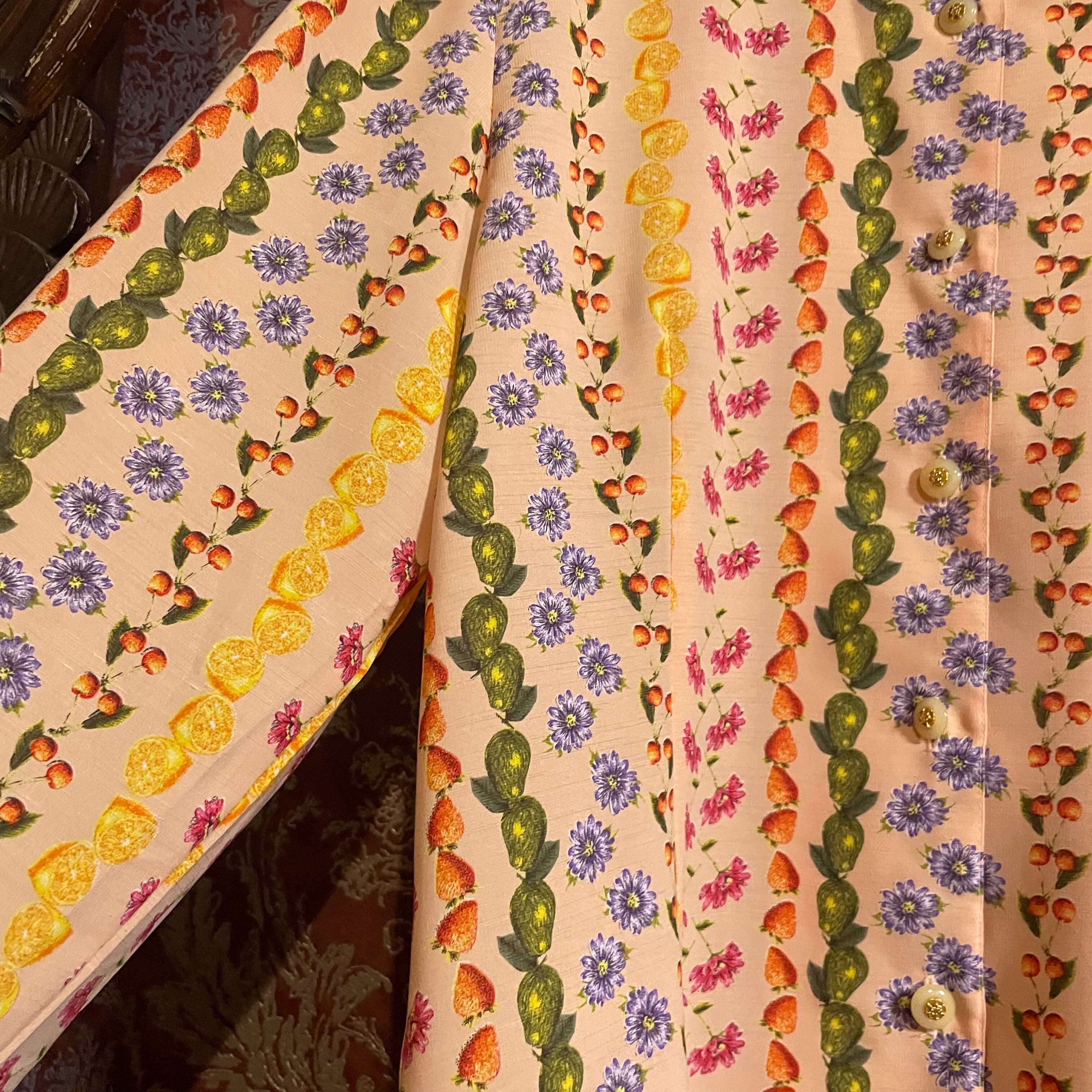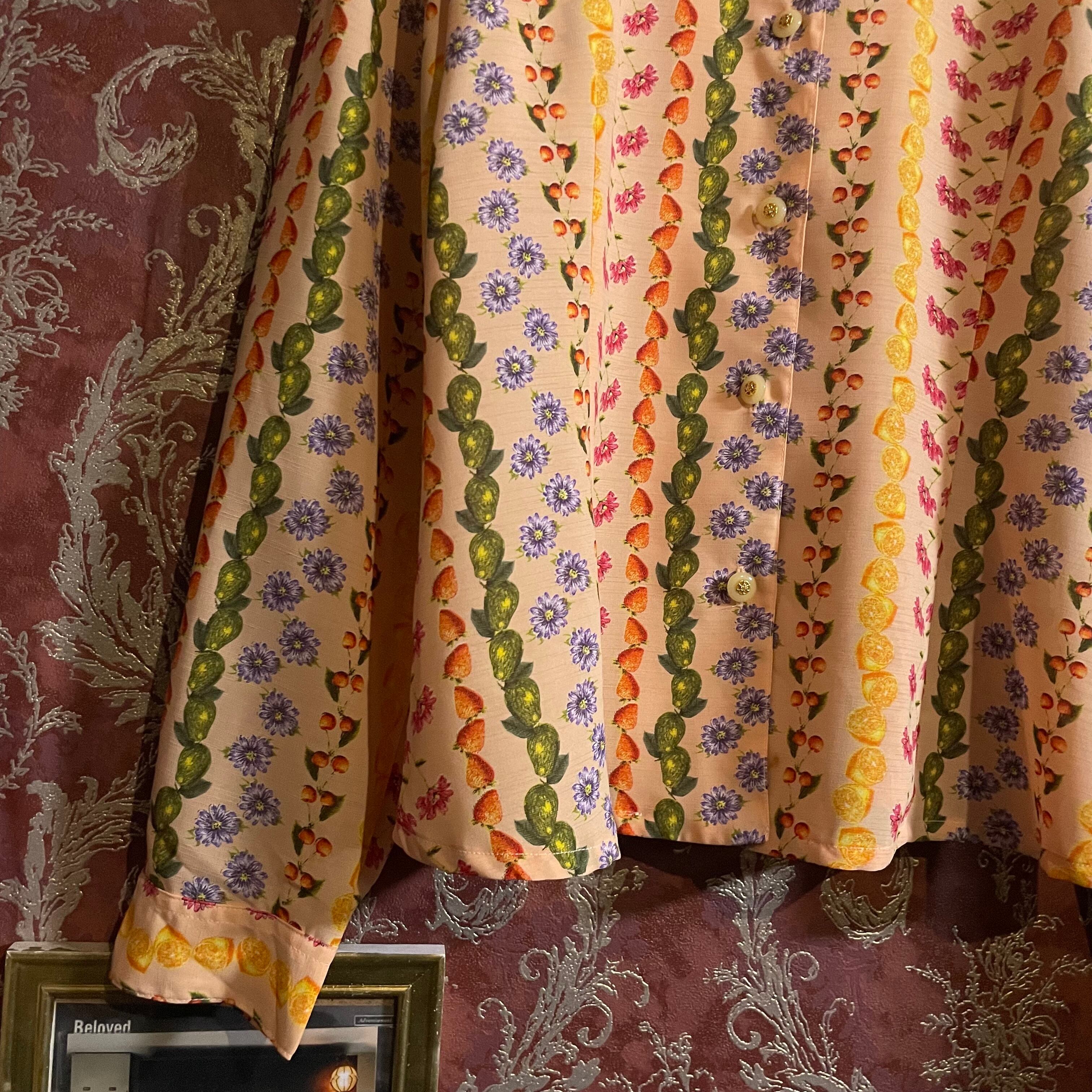 ピンクベージュをベースに可愛らしいフルーツと花柄のブラウスです。
