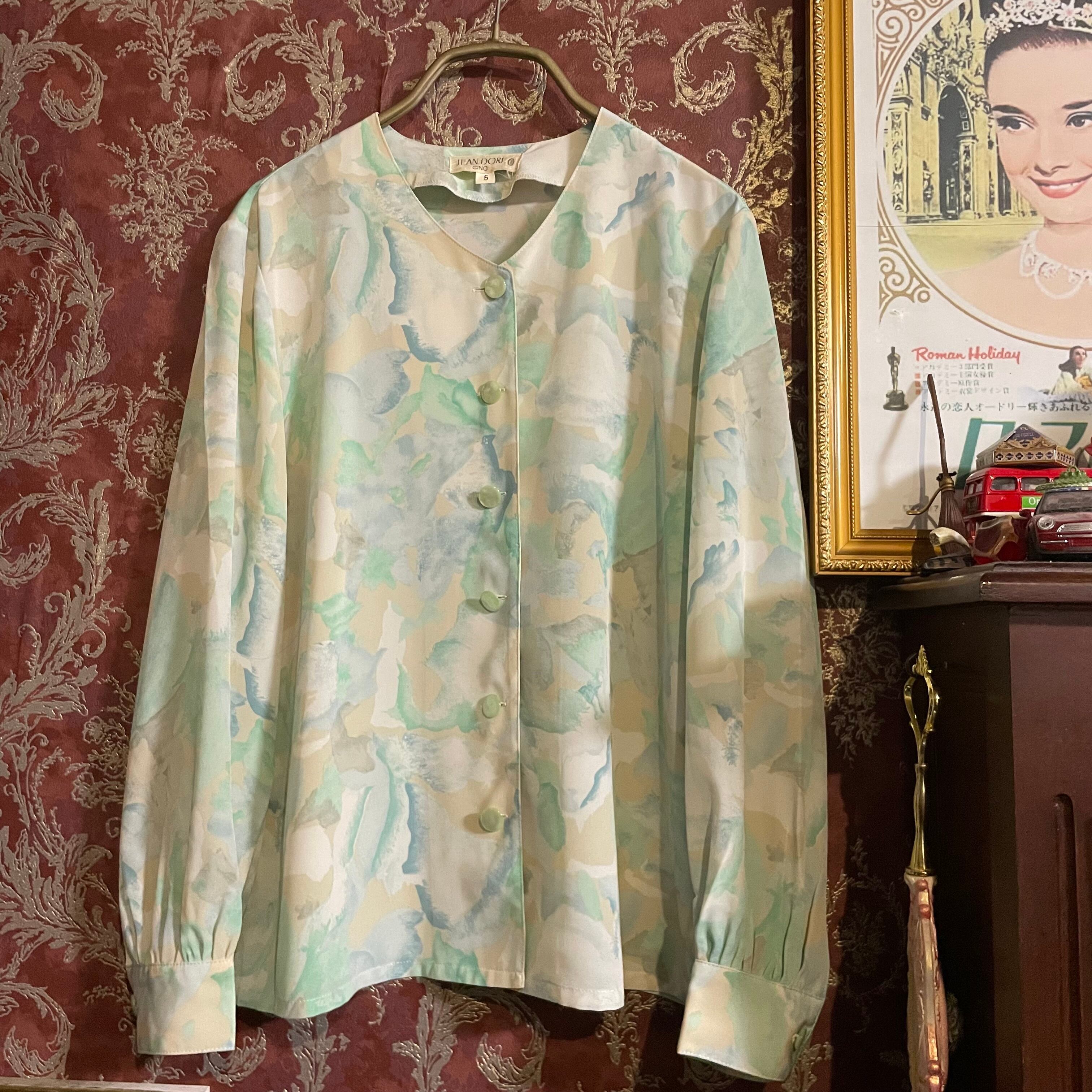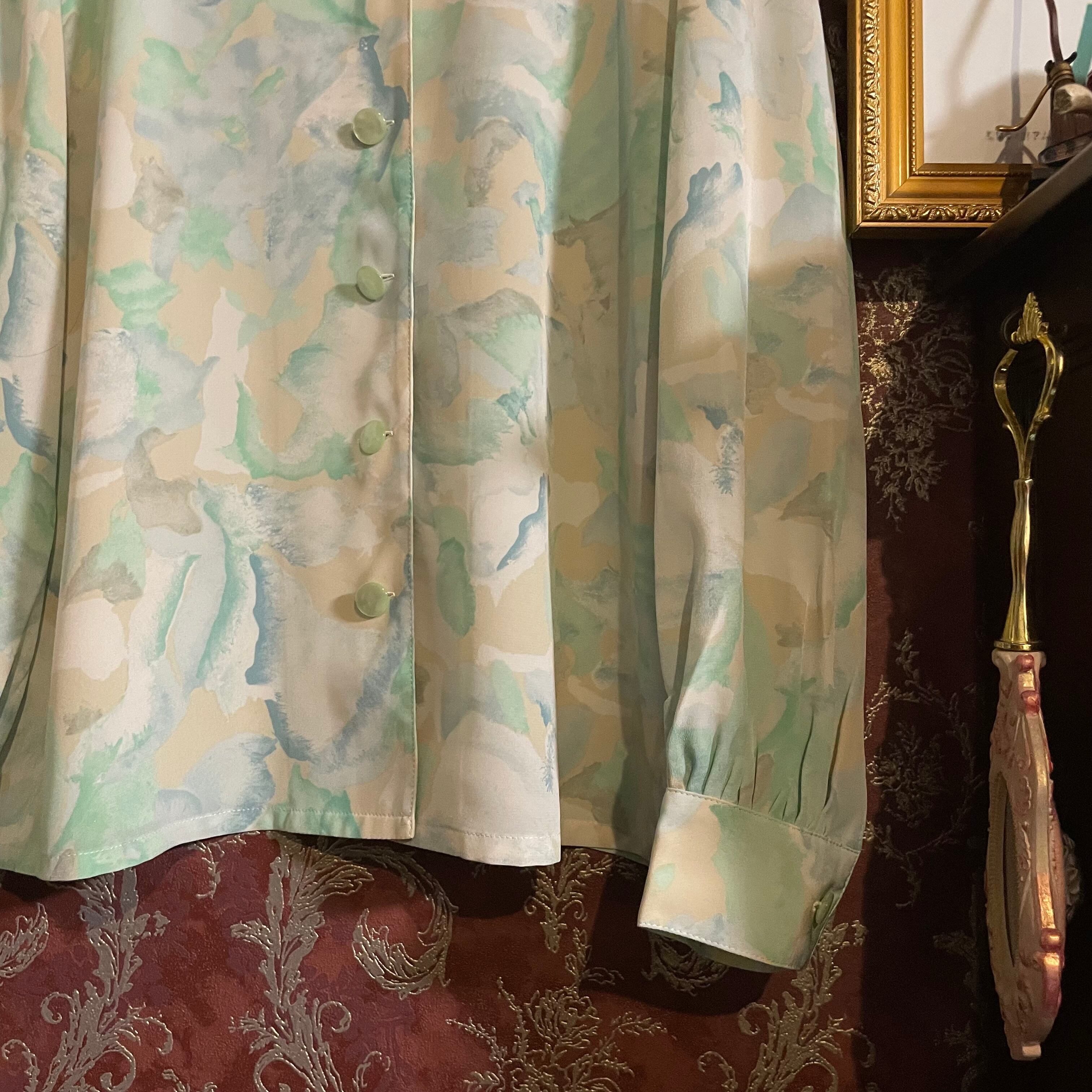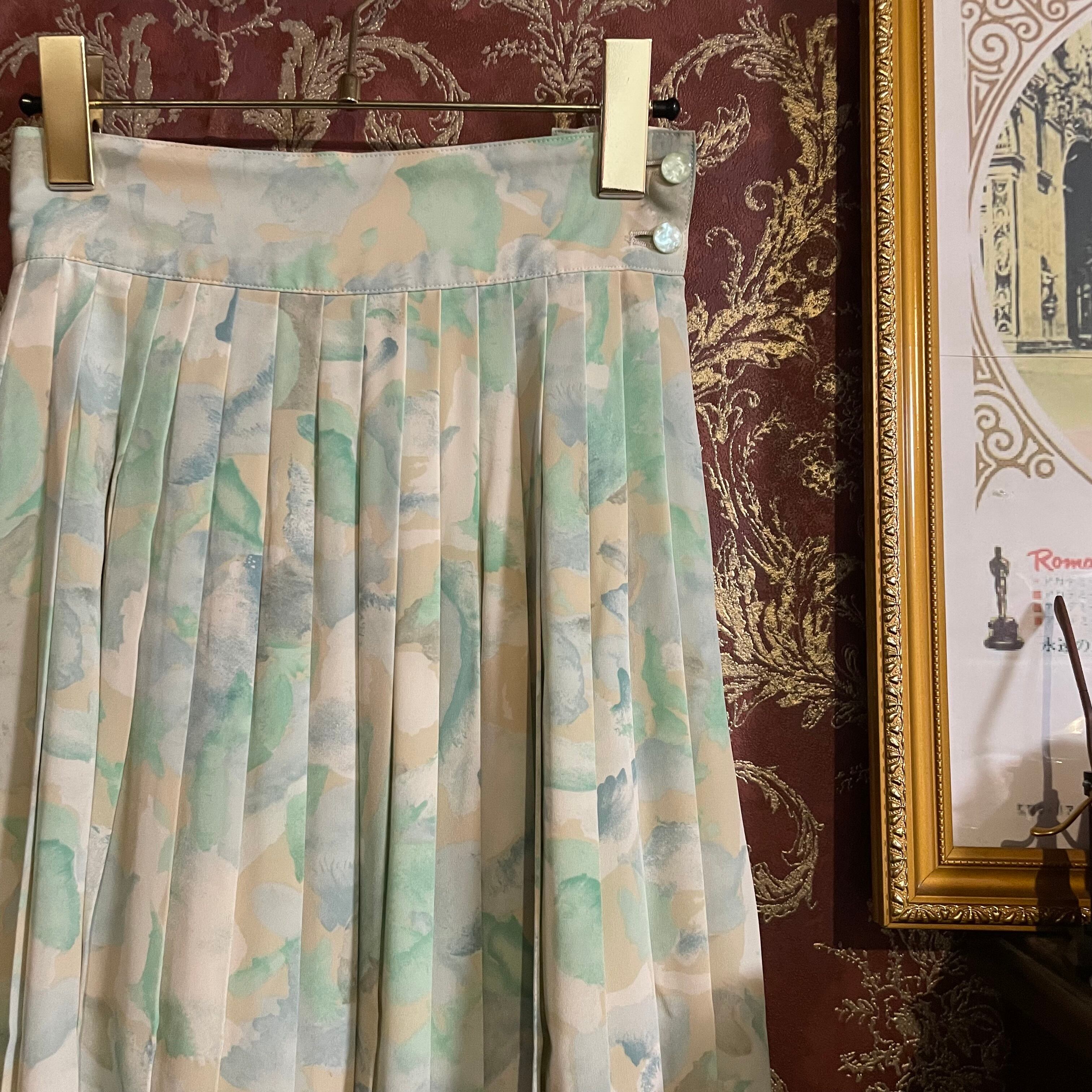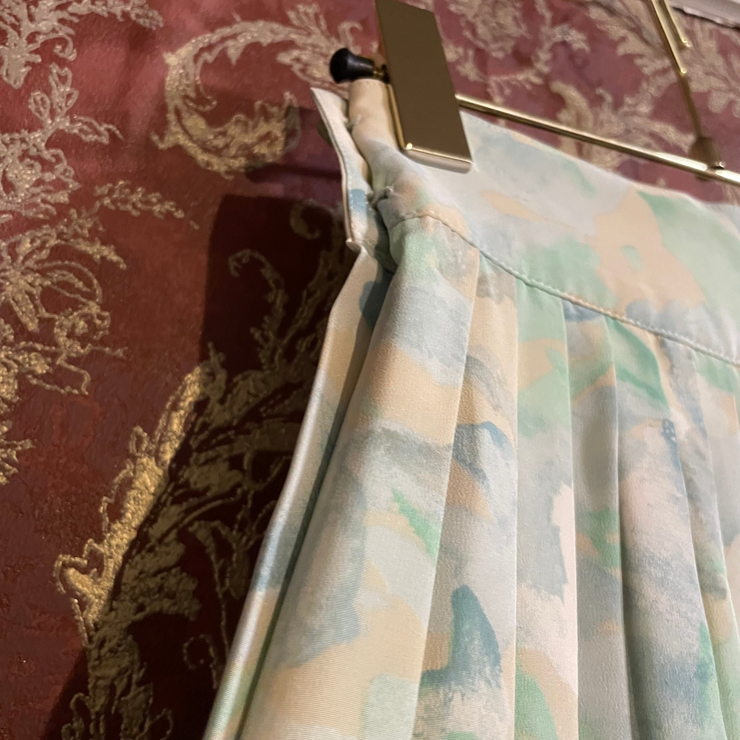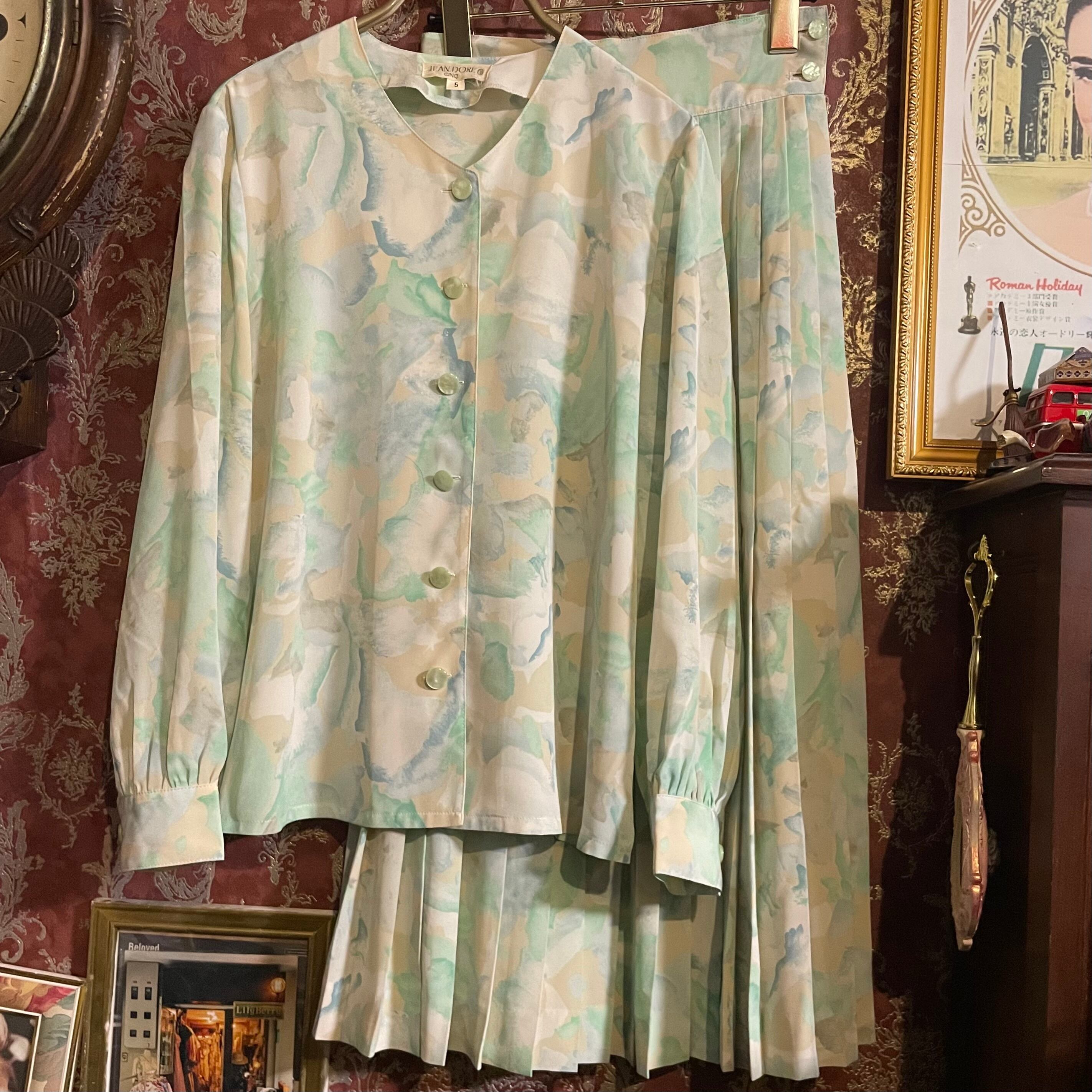 淡いトーンの水彩画風の柄が美しいセットアップです。