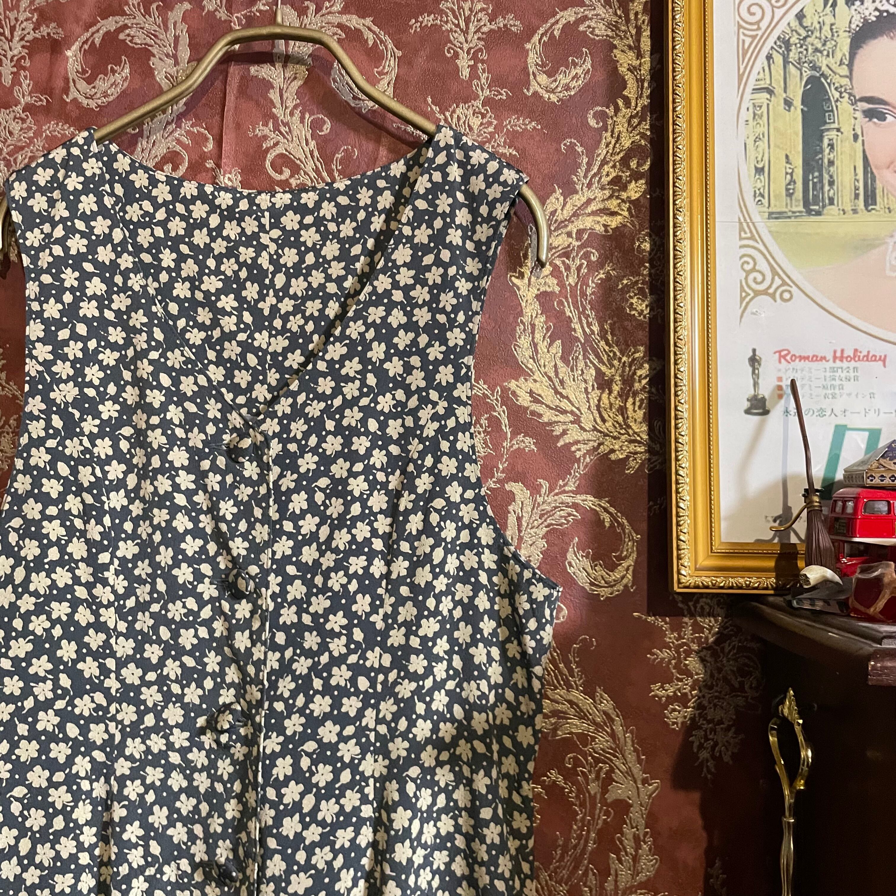 ブルーグレイをベースに、ベージュの花柄ワンピースです。
