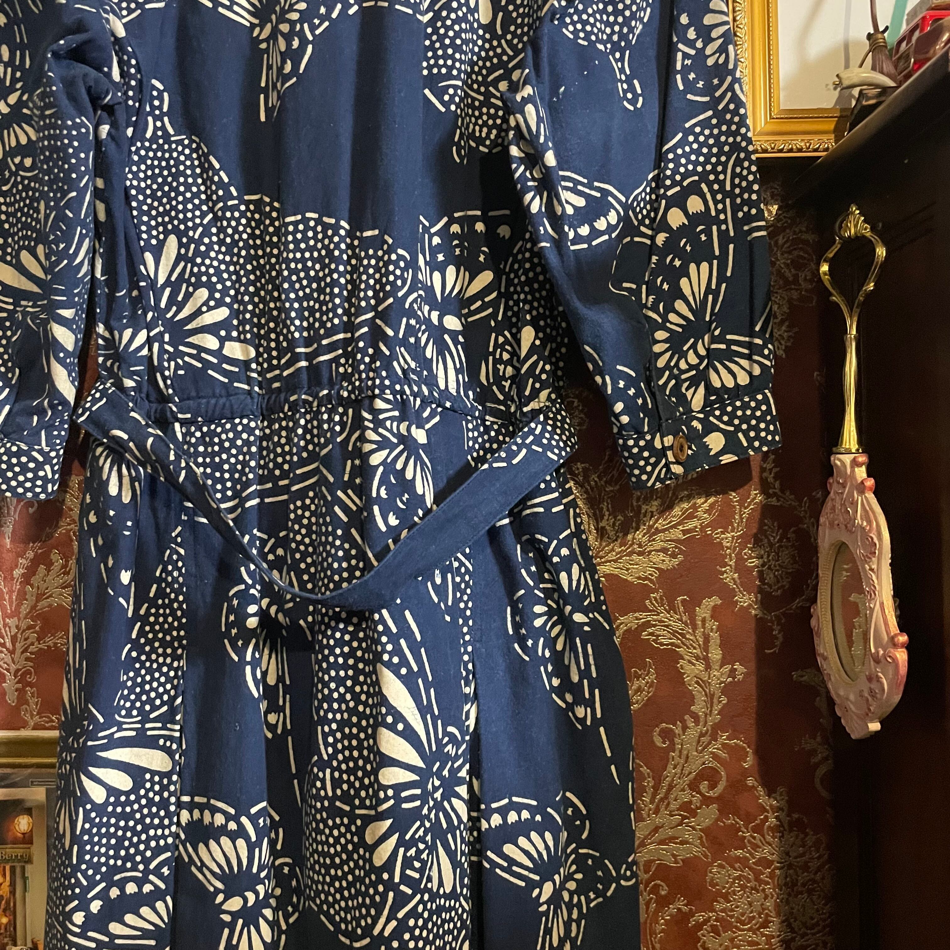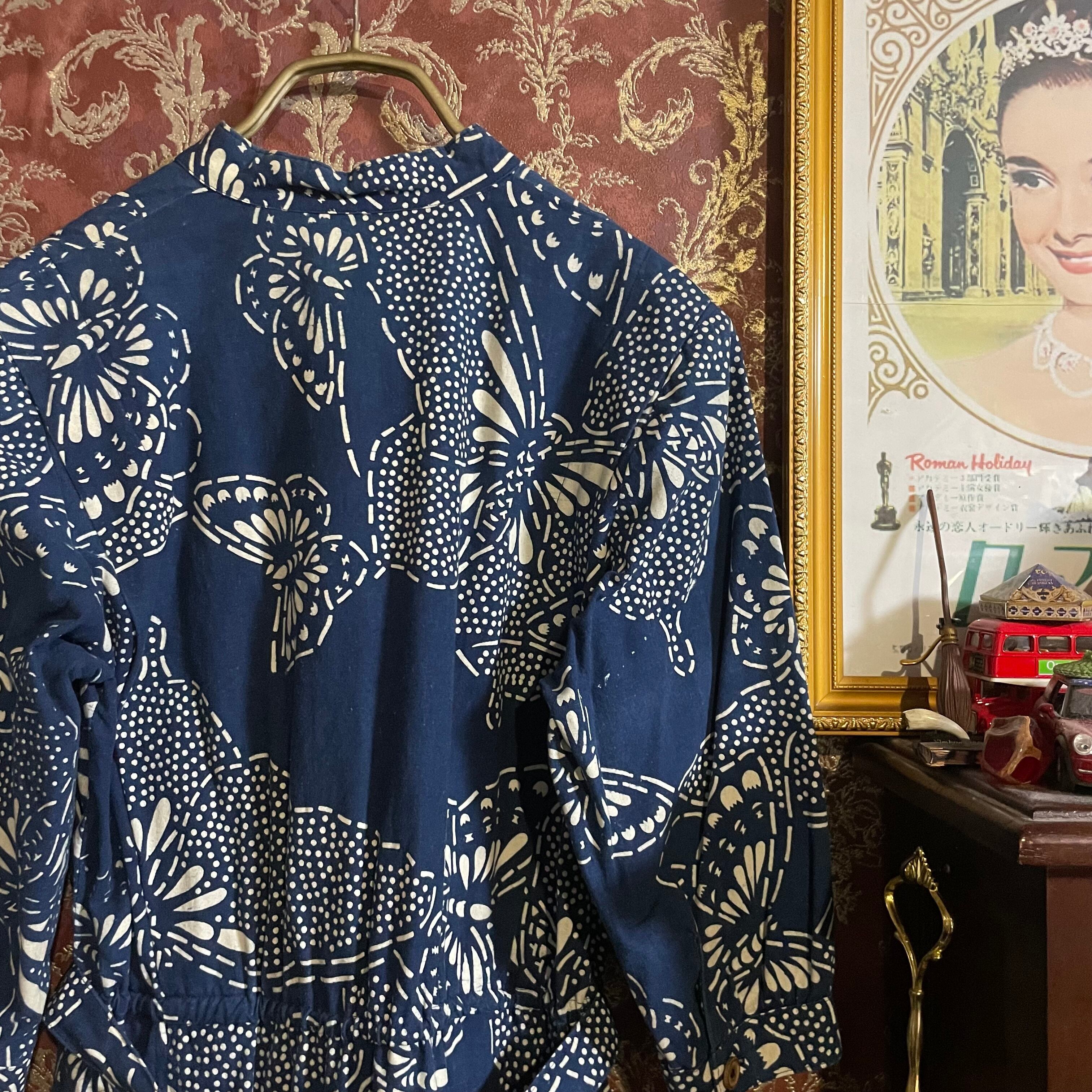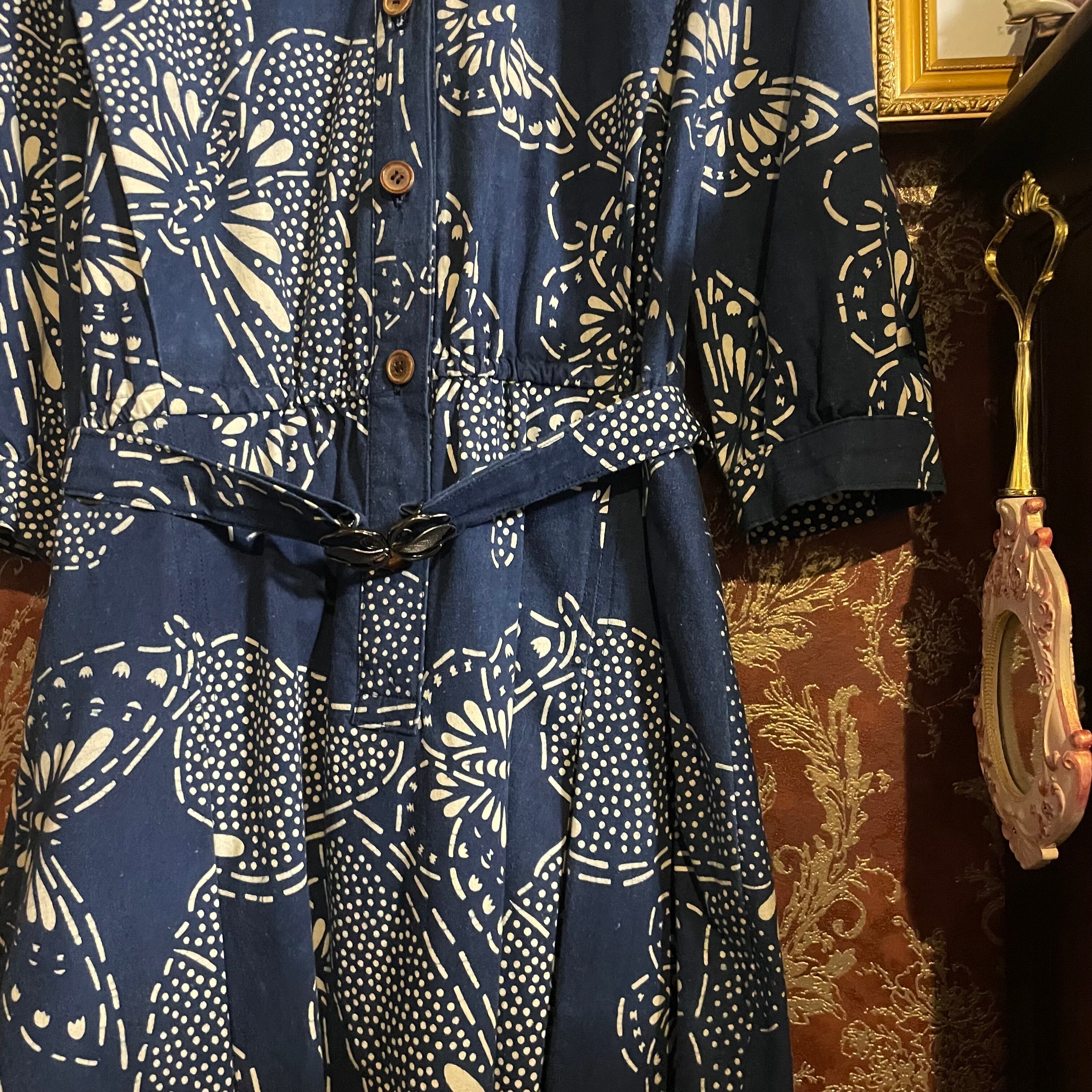 浴衣のようなデザインの藍染め生地で作られたヴィンテージワンピースです。