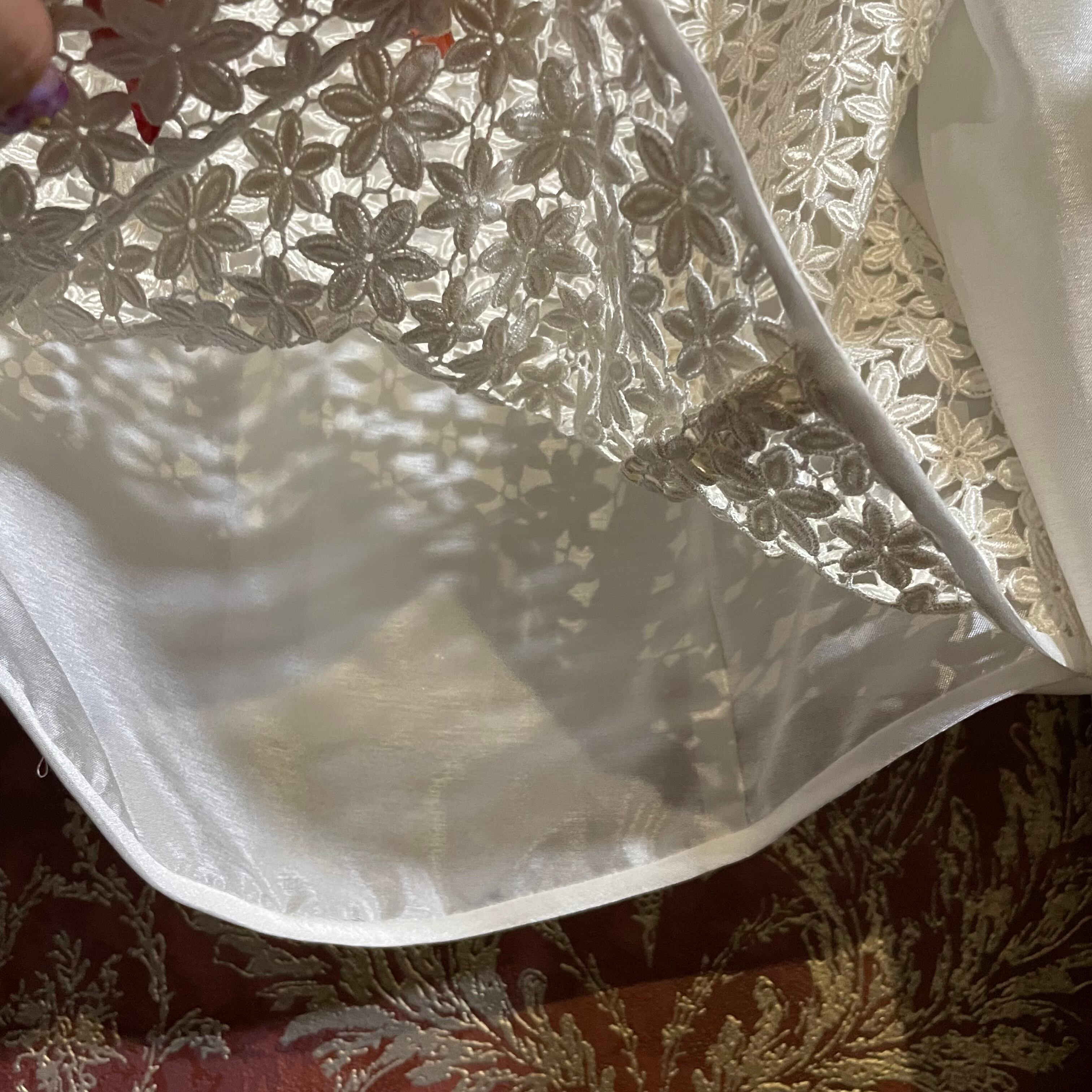 艶感のある生地をベースに、白の花がらが美しいレースが使われています。