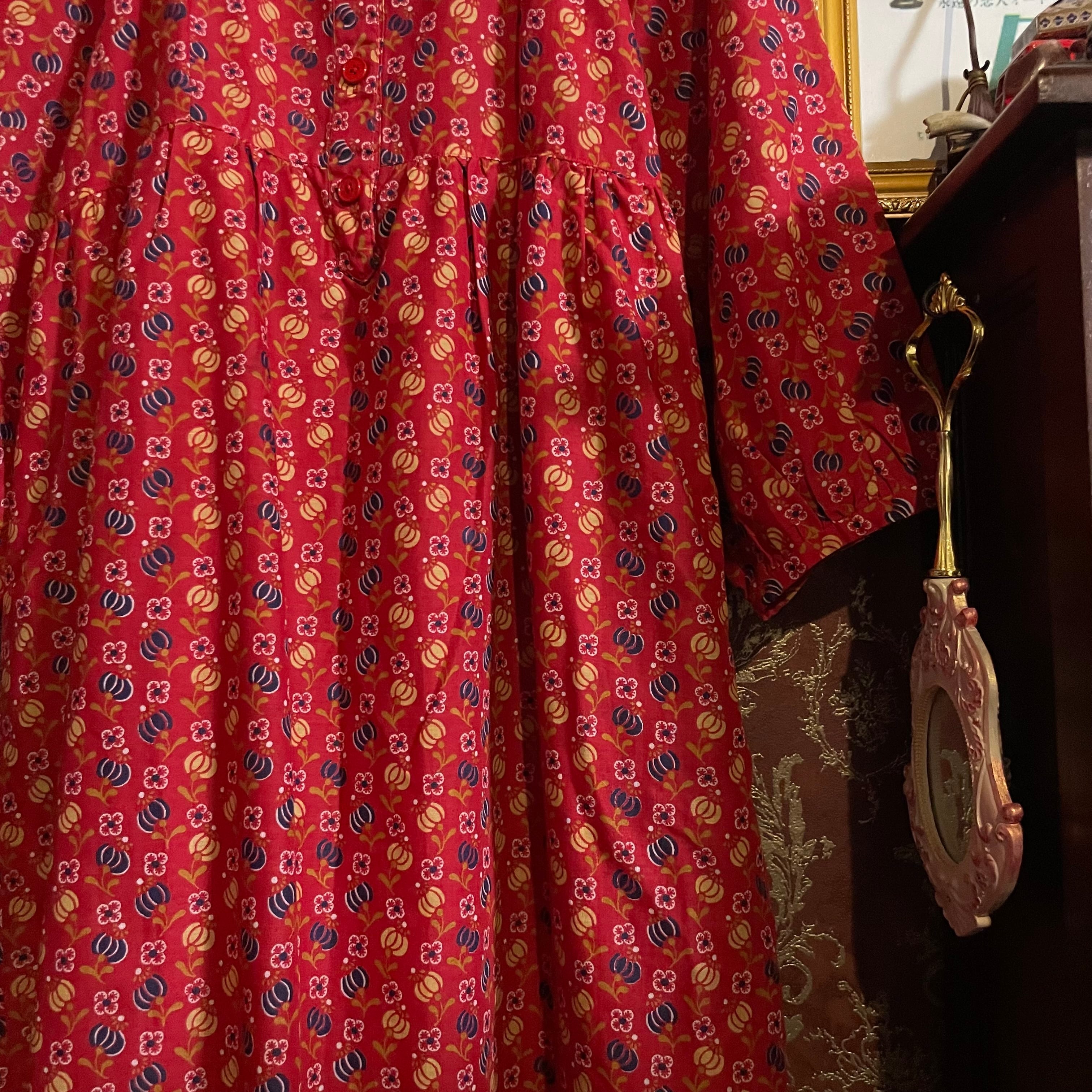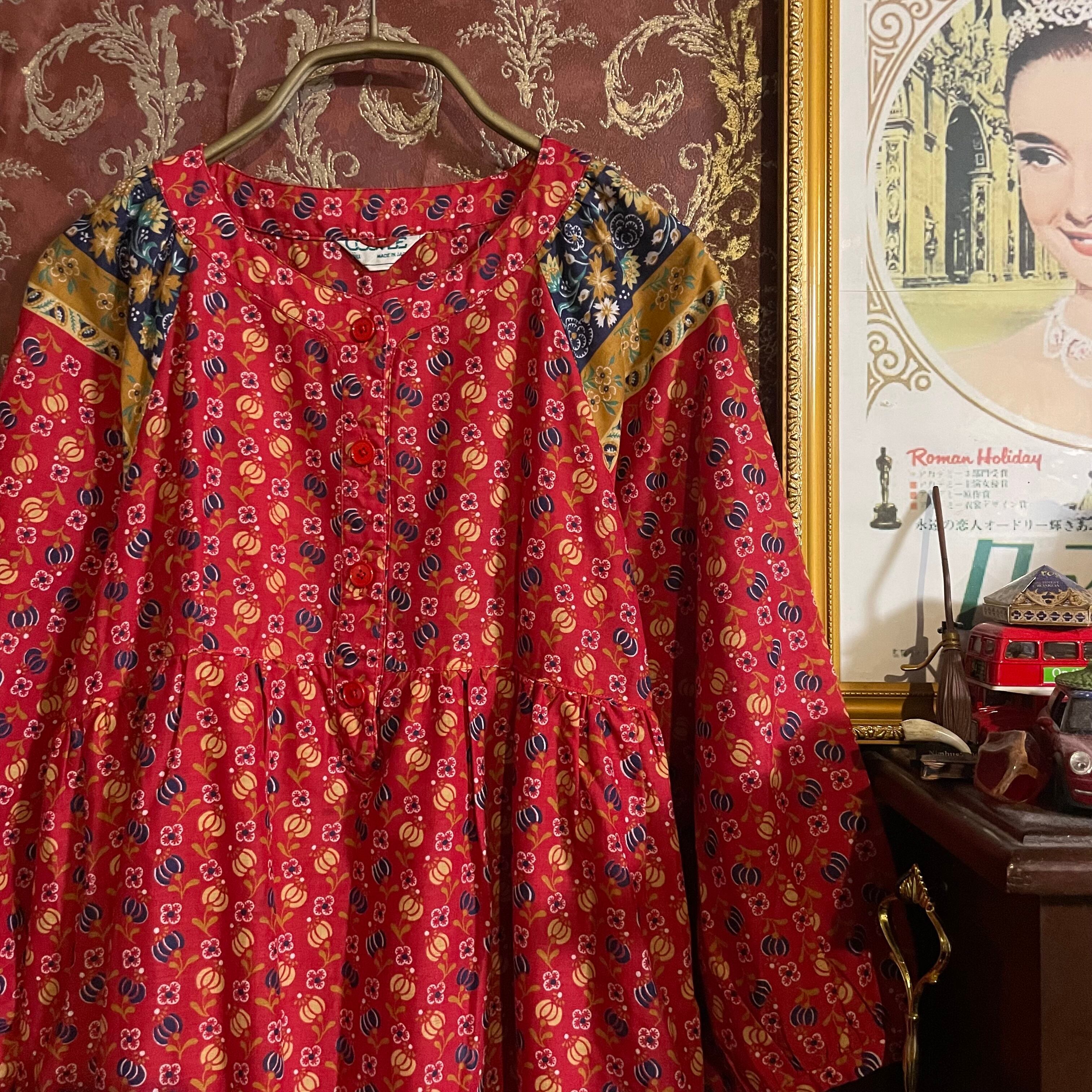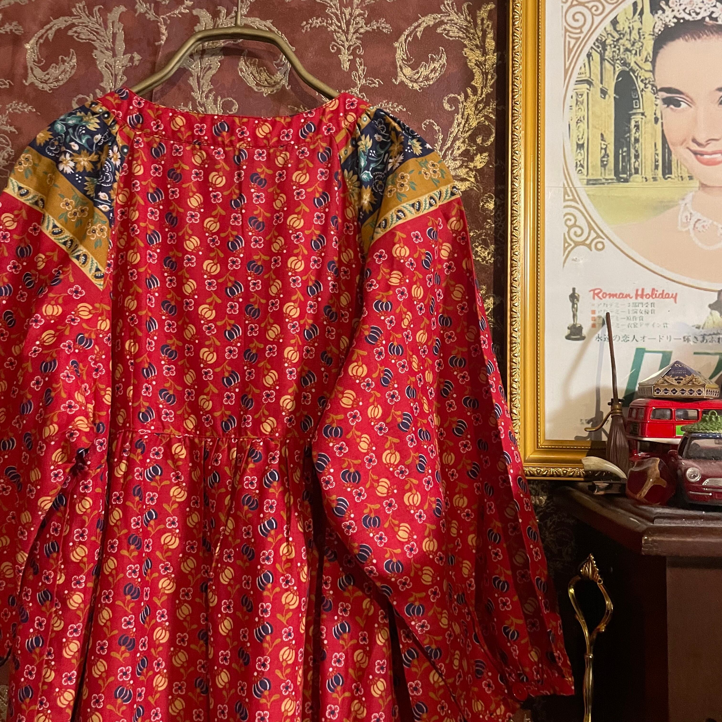赤をベースにエスニック風の配色が個性的なヴィンテージワンピースです。