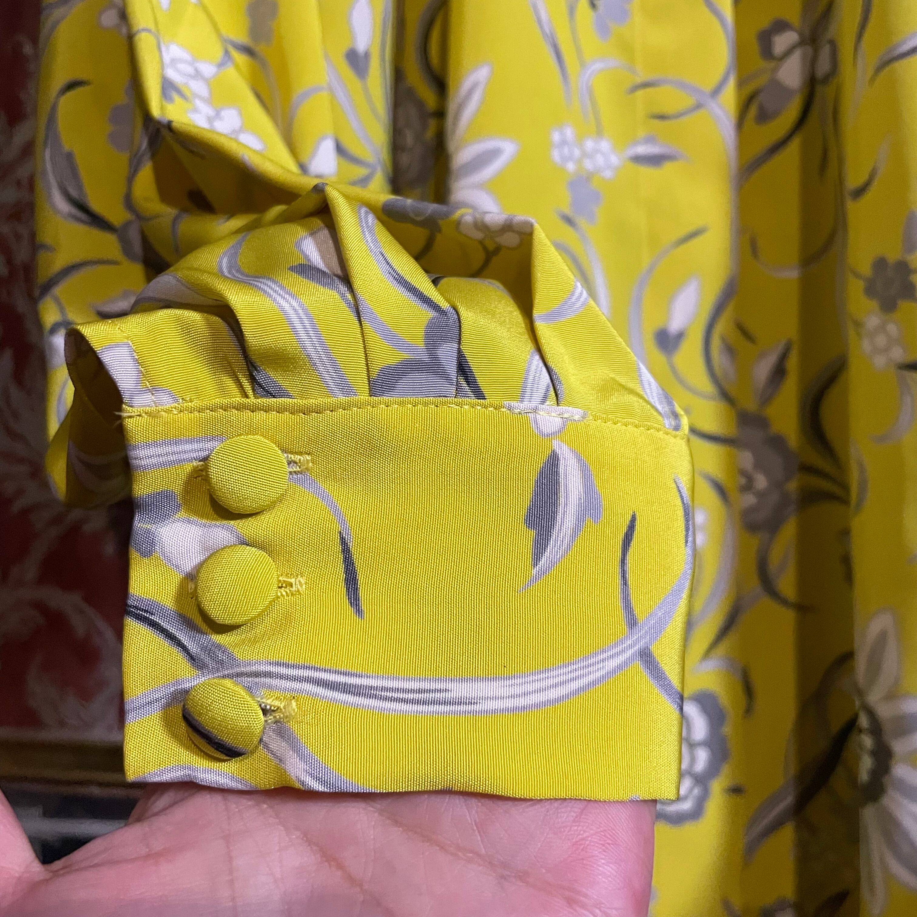 黄色をベースにグレーの花柄がパワフルな一着です。