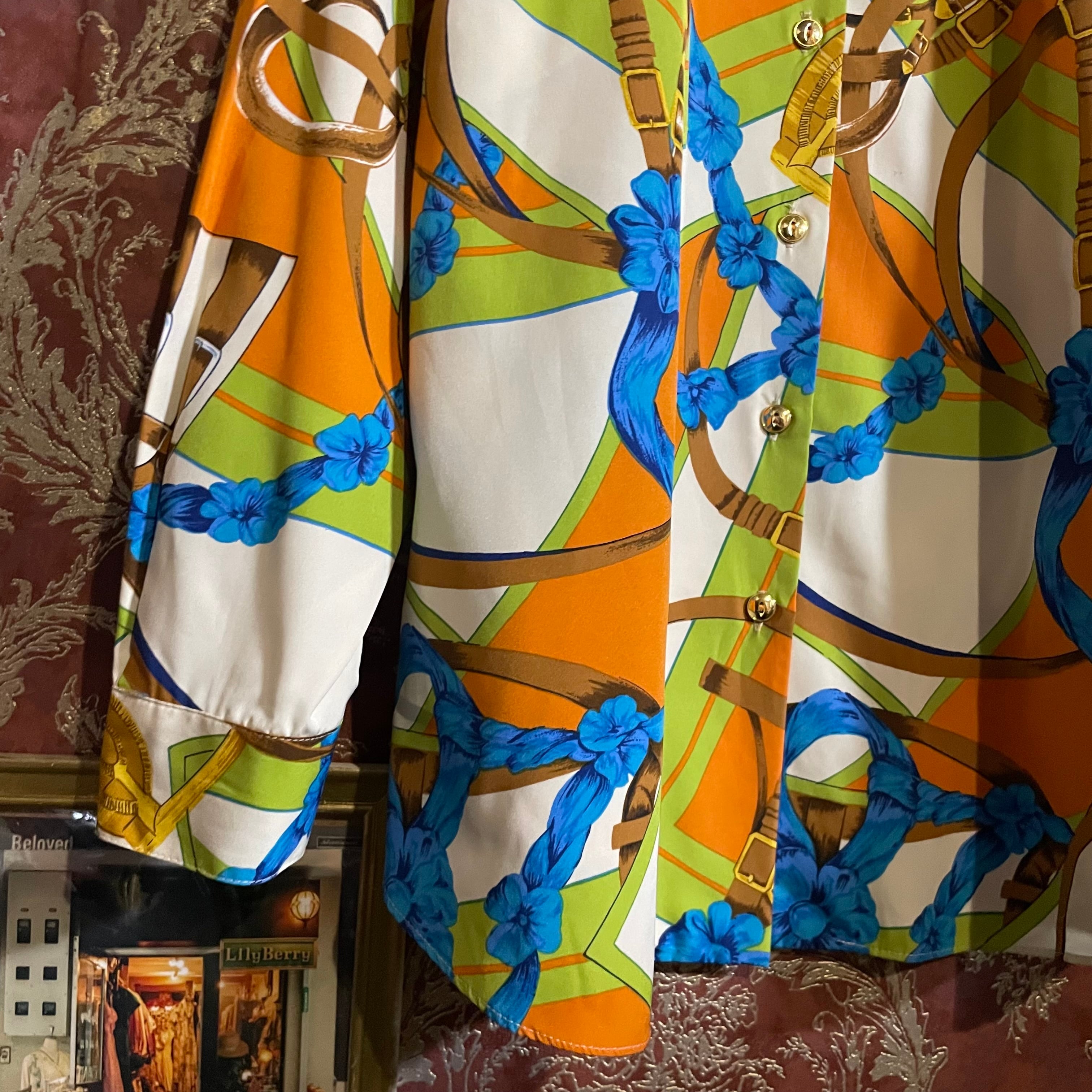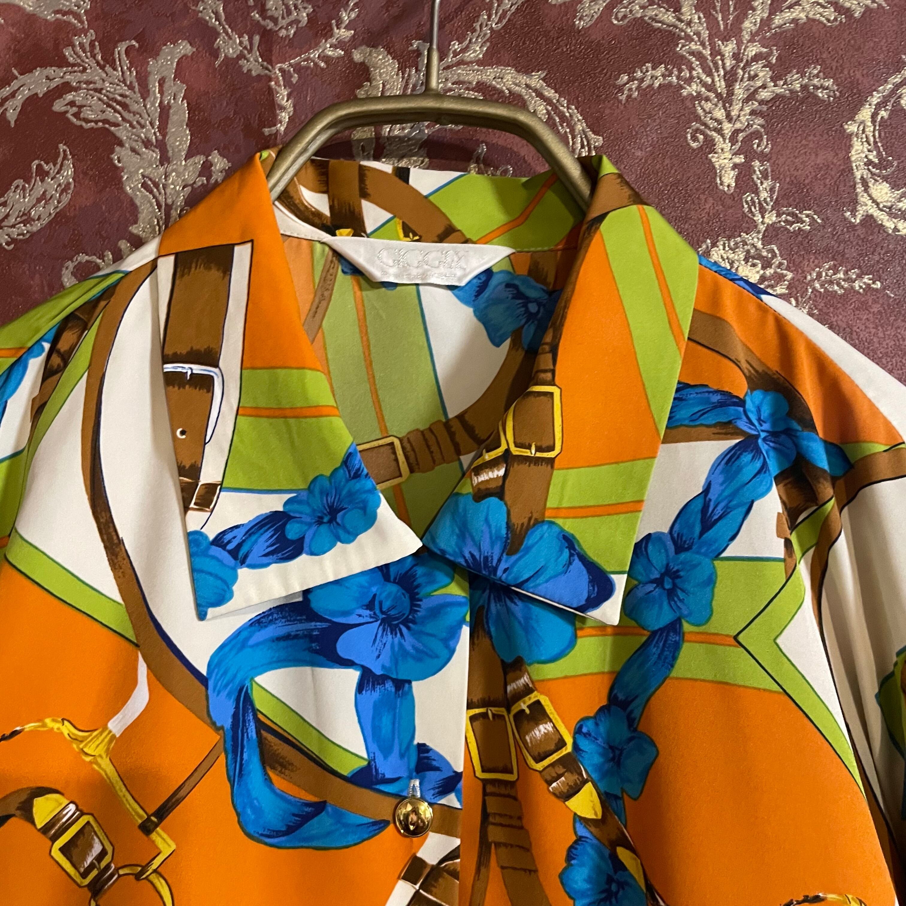 白をベースにベルトやスカーフ、リボン柄のシャツです。