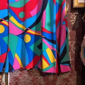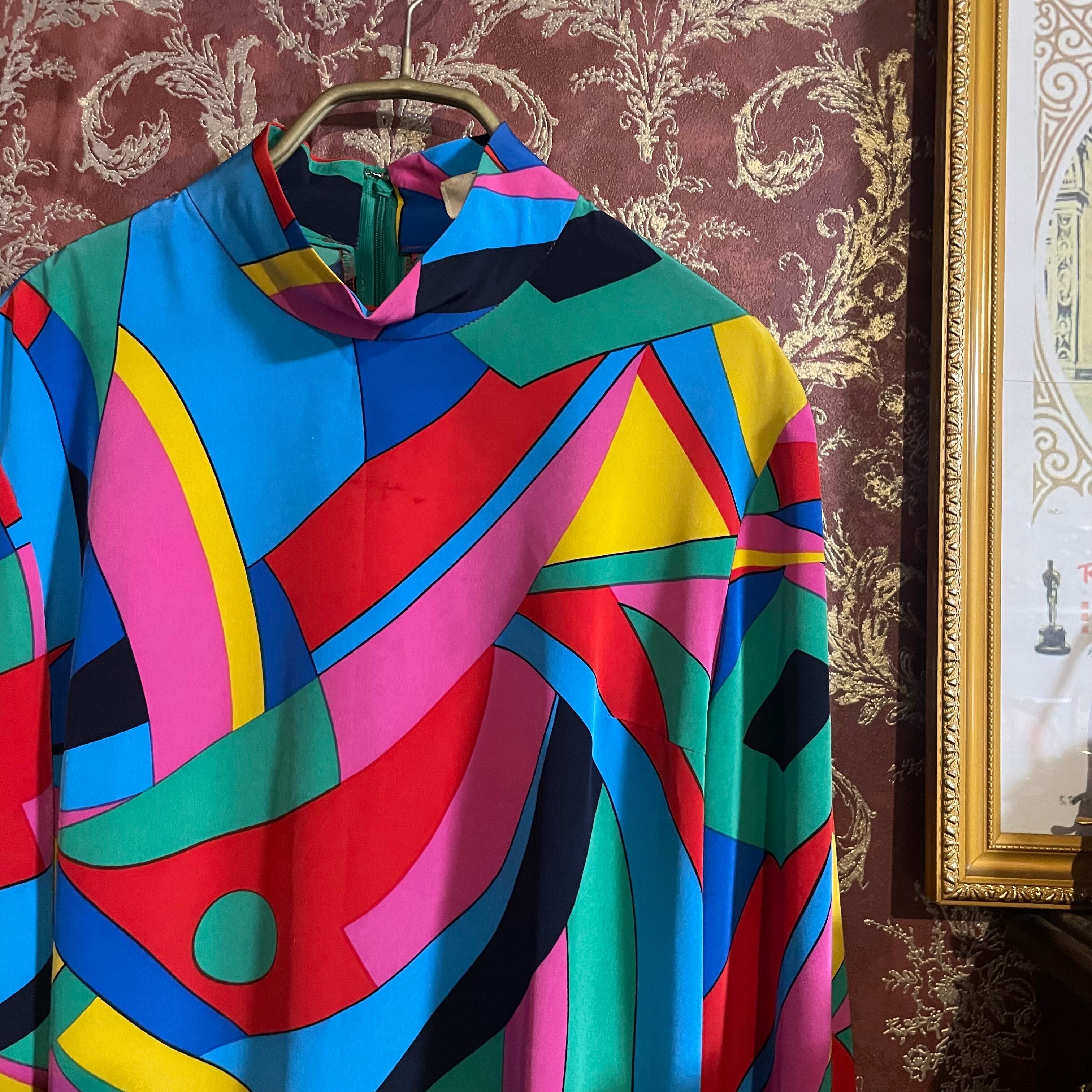 幾何学的な模様が特徴的な長袖のブラウスです。この模様は、複数の色と形が組み合わされており、キュビズム(立体派)の絵画を彷彿とさせます。