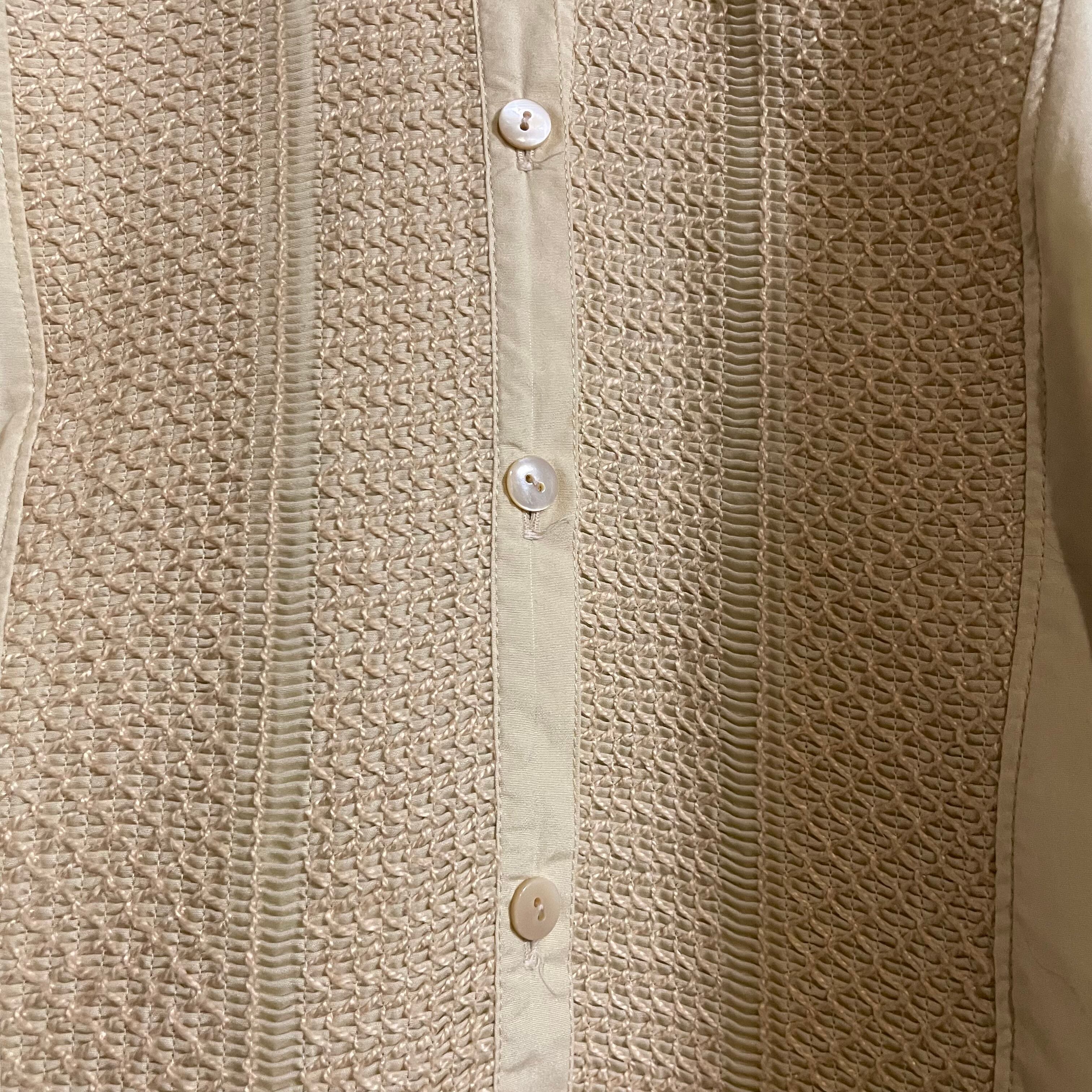 襟からフロントにかけて寸分の狂いのないスモッキングが施されていて、とても美しいです。