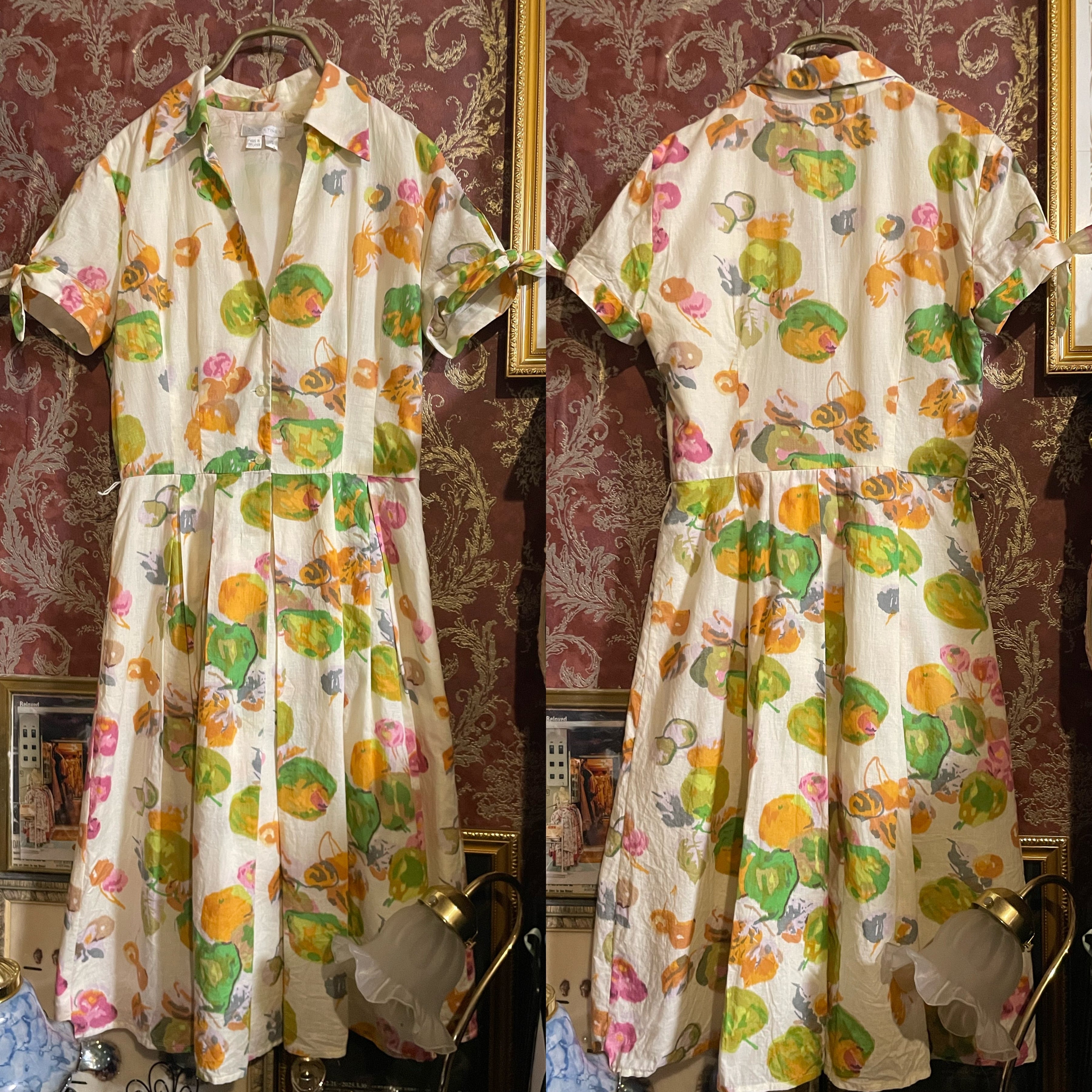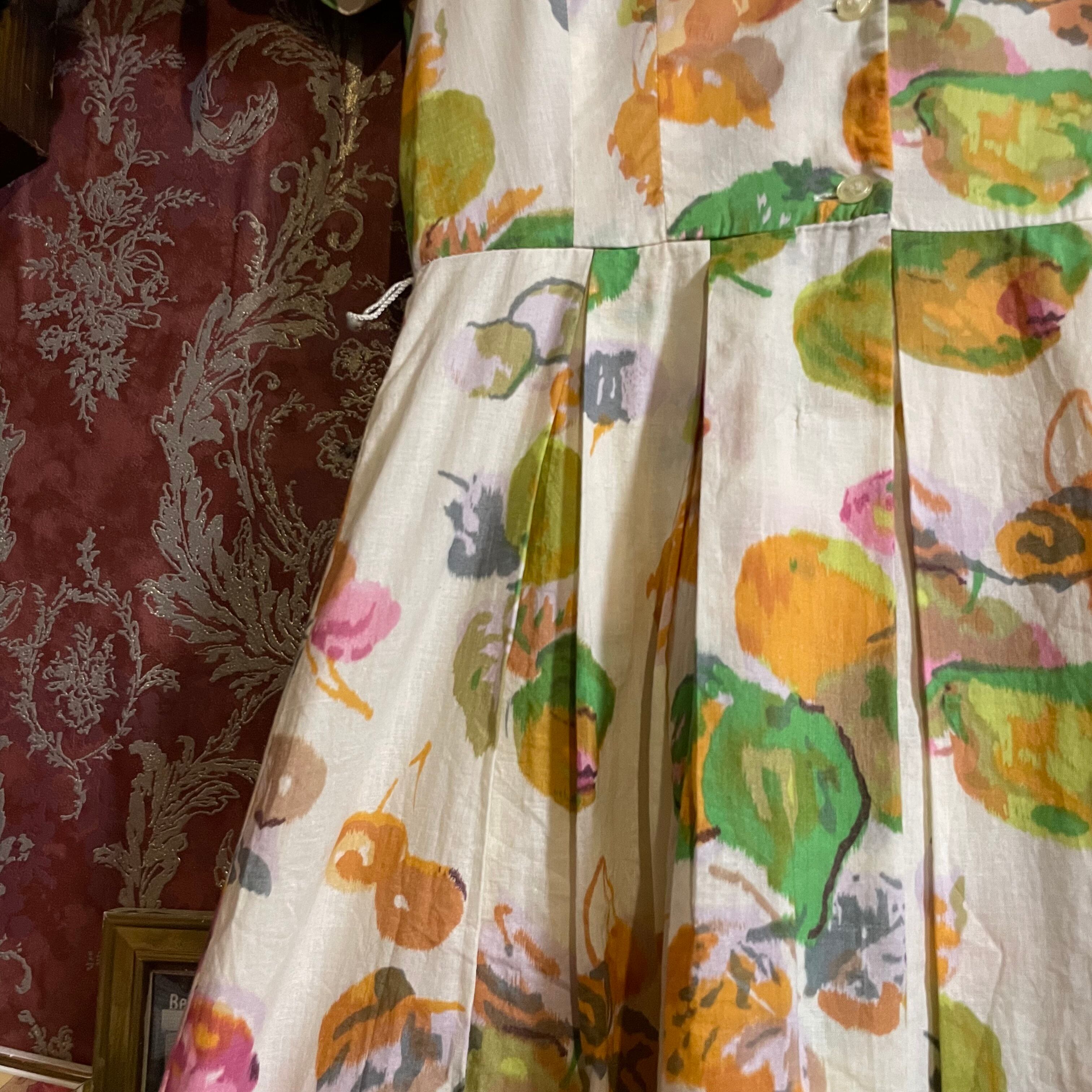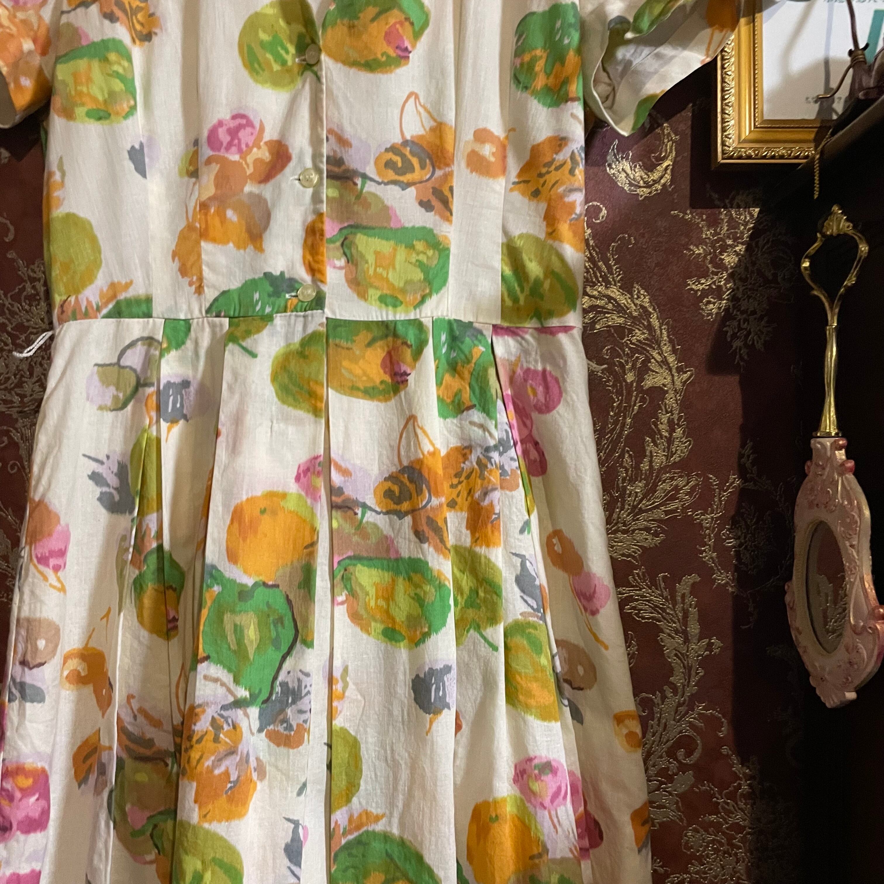 絵本のような柔らかいタッチのフルーツ柄ワンピースです。