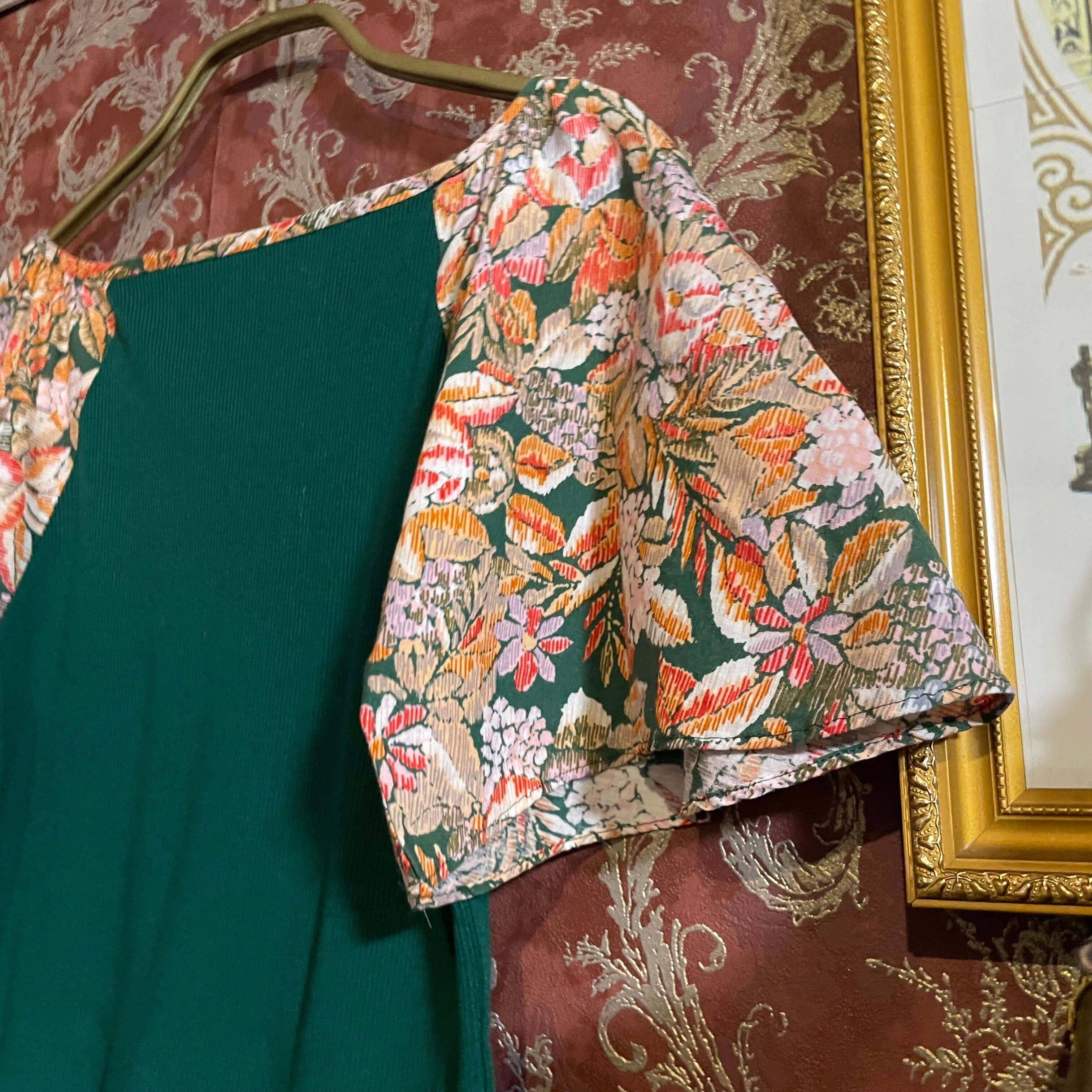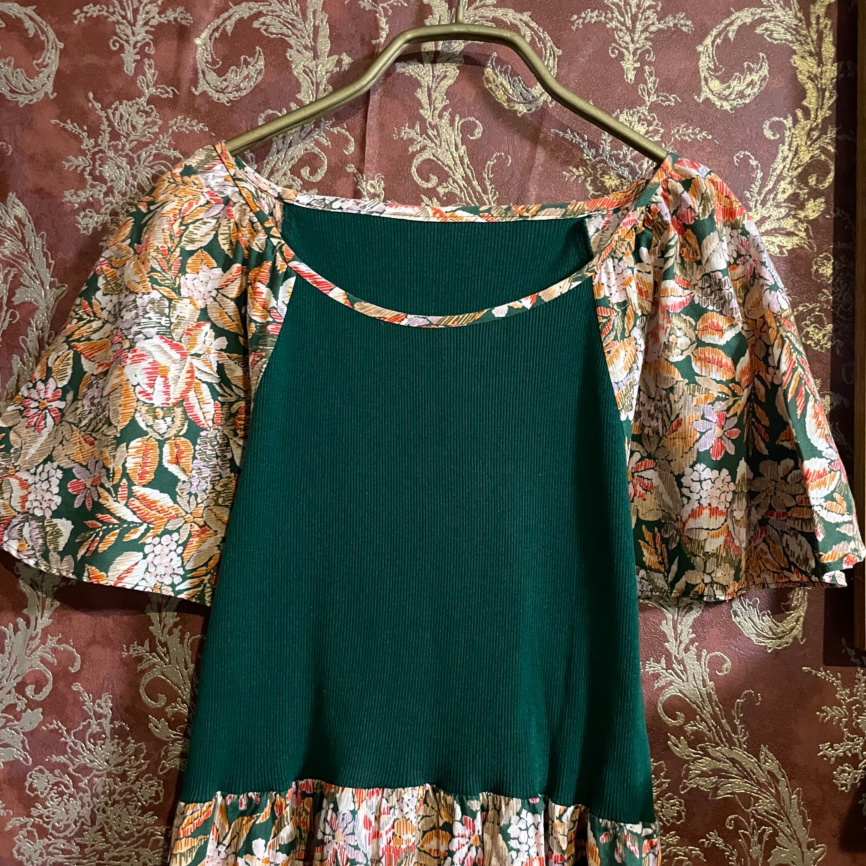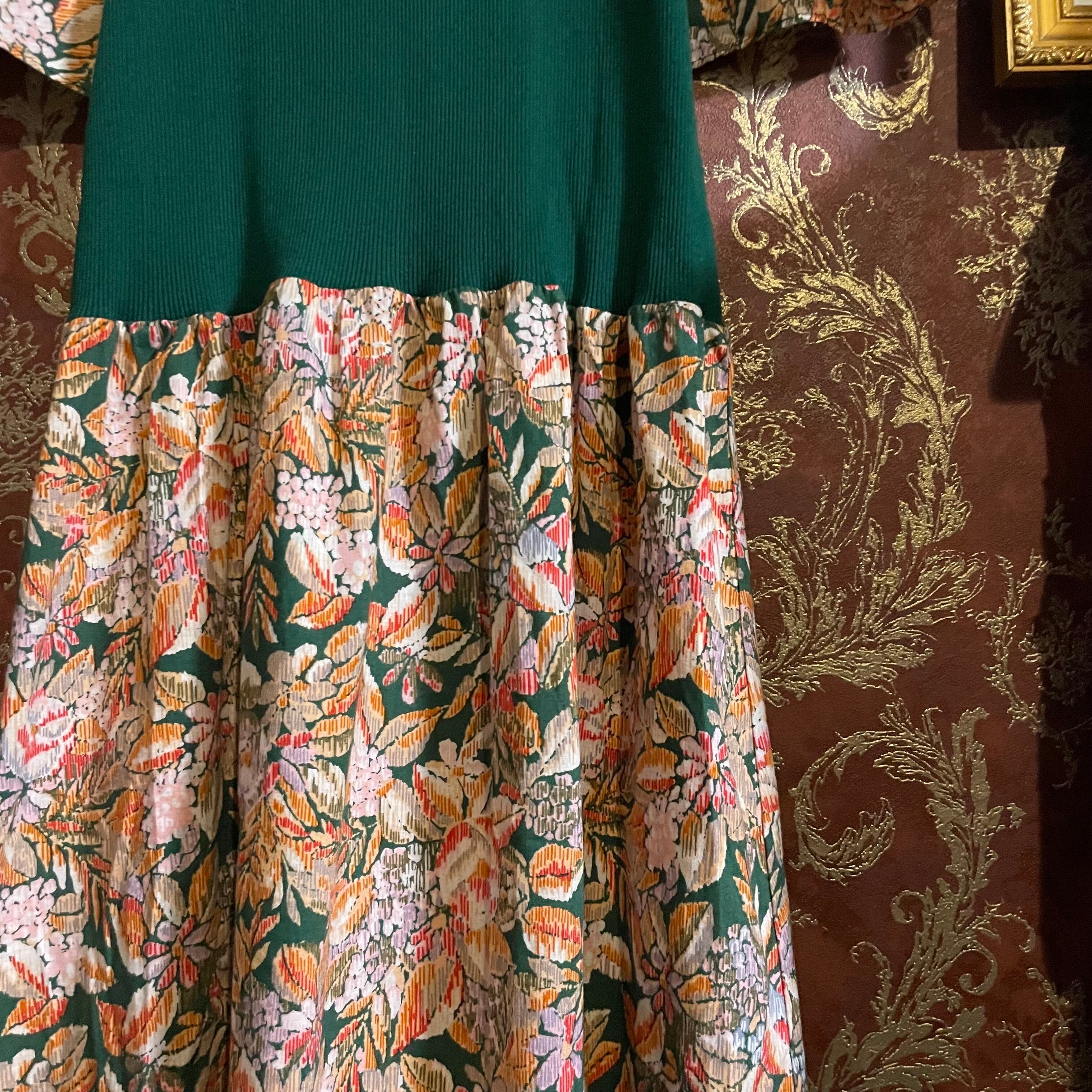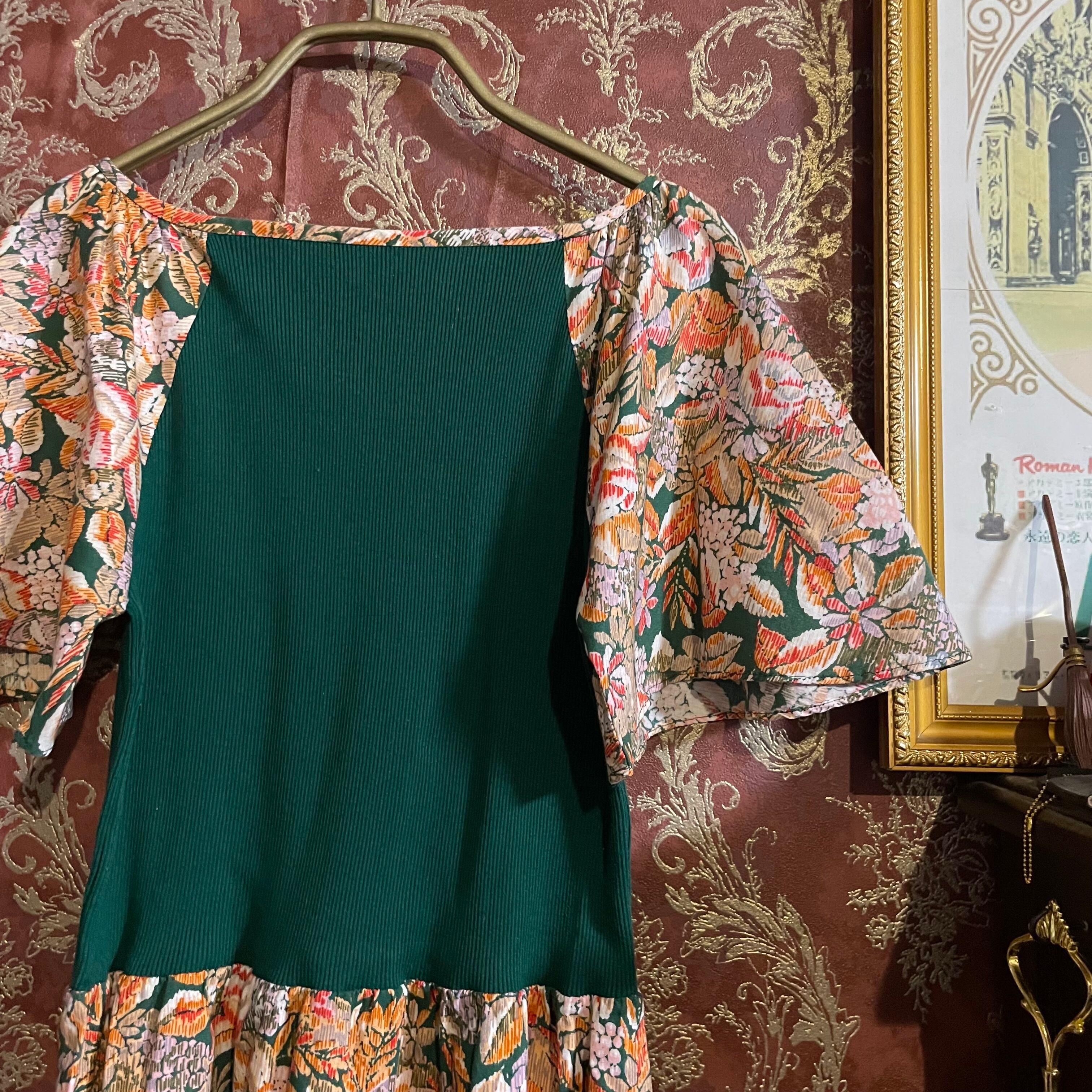 鮮やかなグリーンのリブニットと華やかな花柄のドッキングワンピースです。