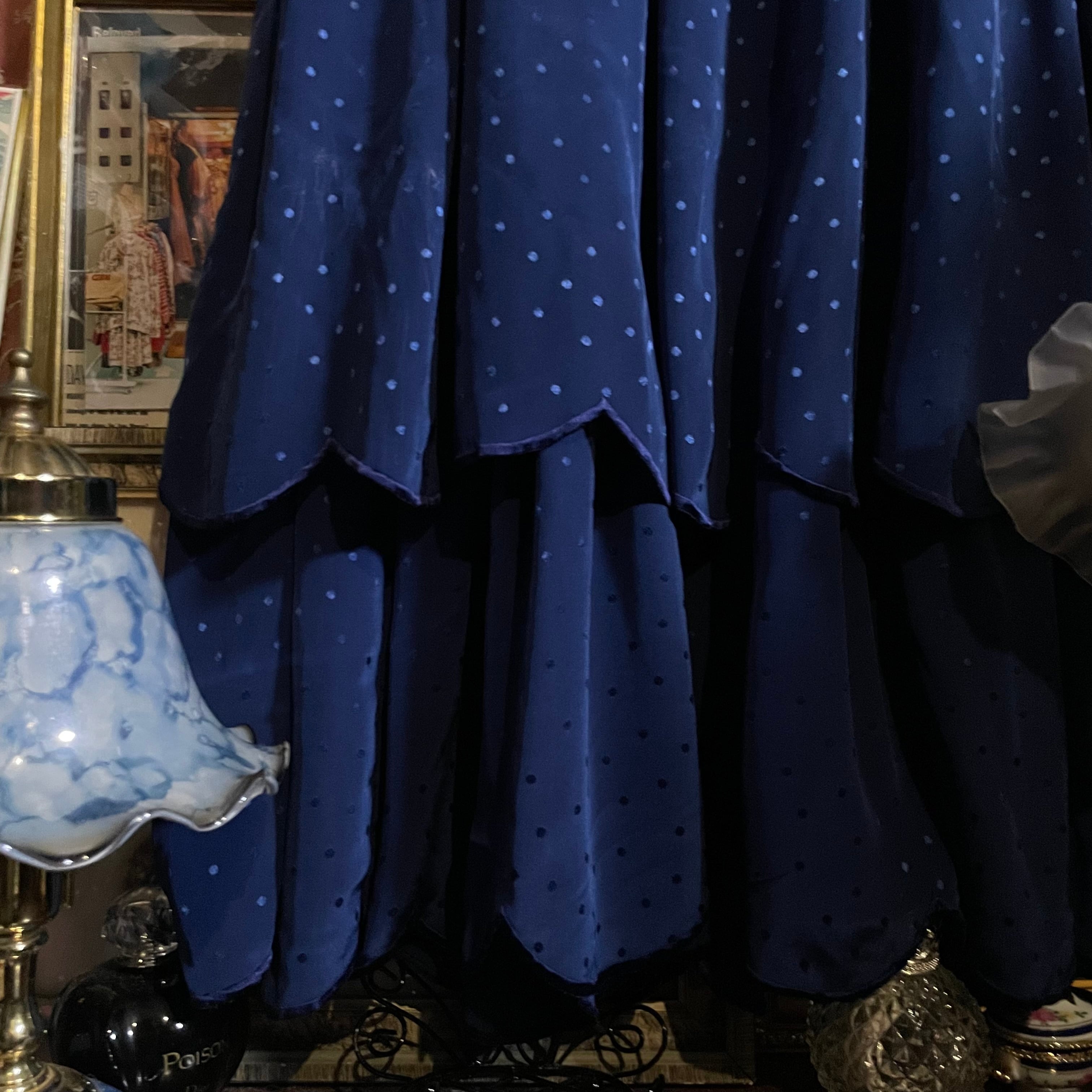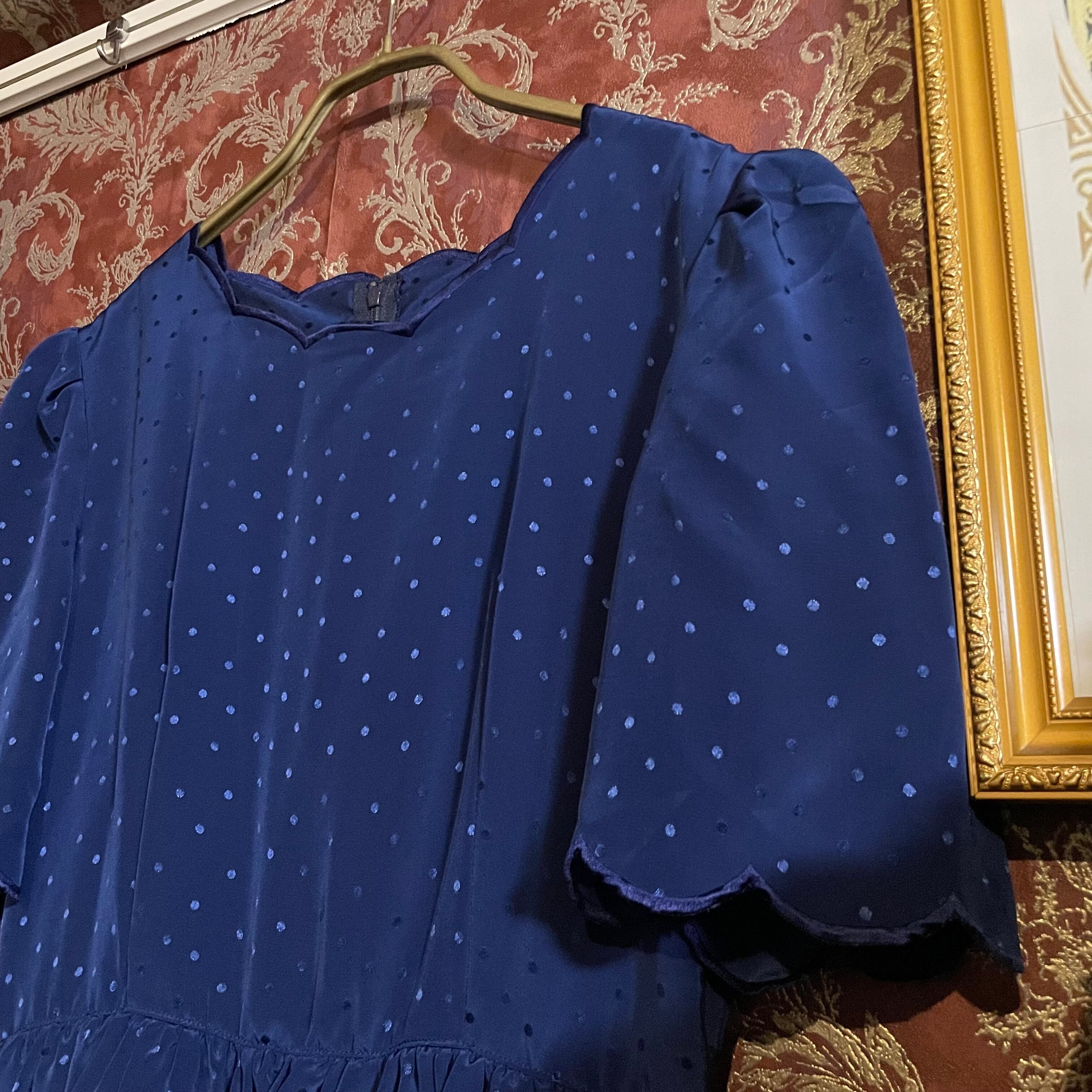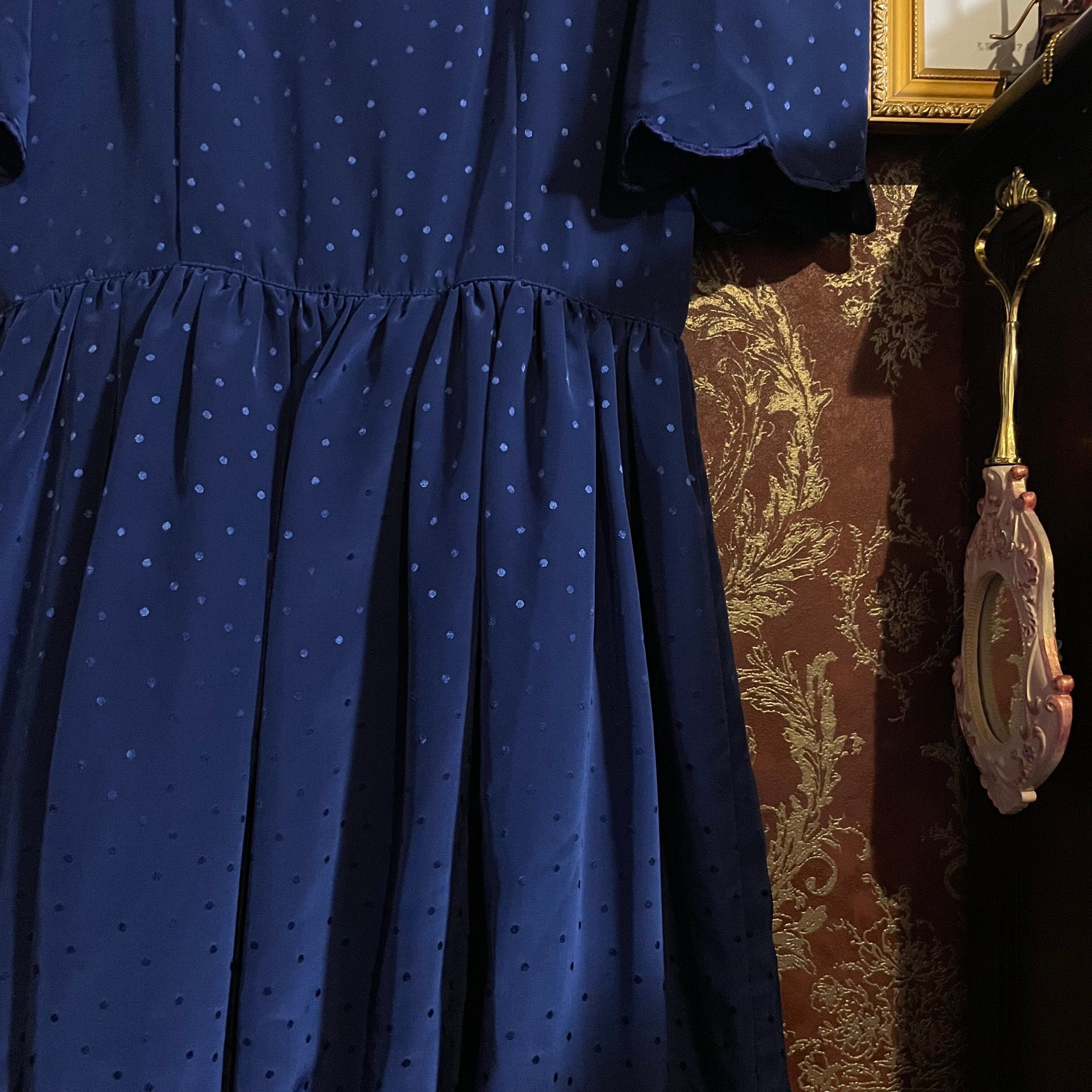 深い青をベースに、ジャガードのドット柄がレトロ感漂うヴィンテージワンピースです。