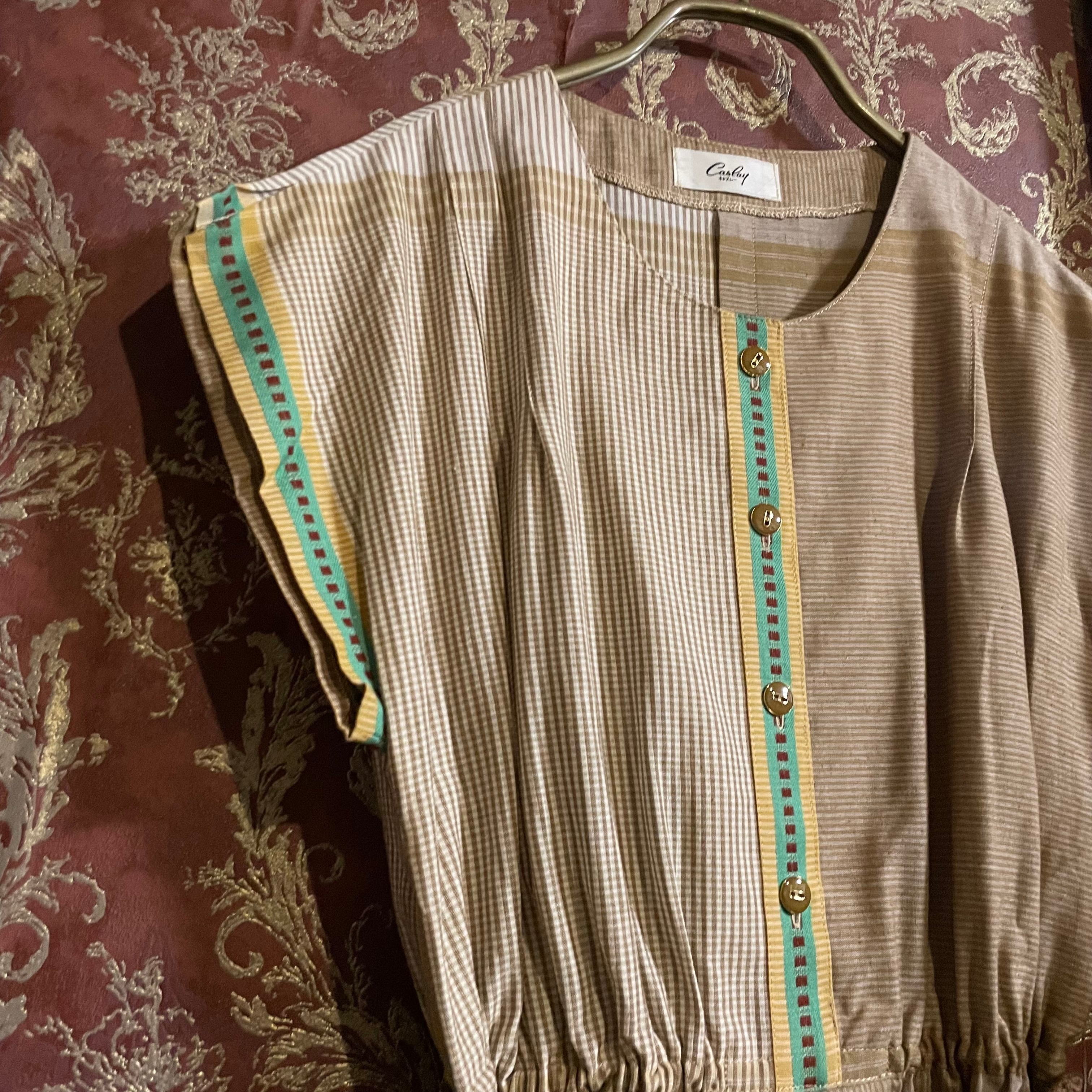 チェックやストライプなどの柄がパッチワーク風に組み合わさったコットンワンピースです。
