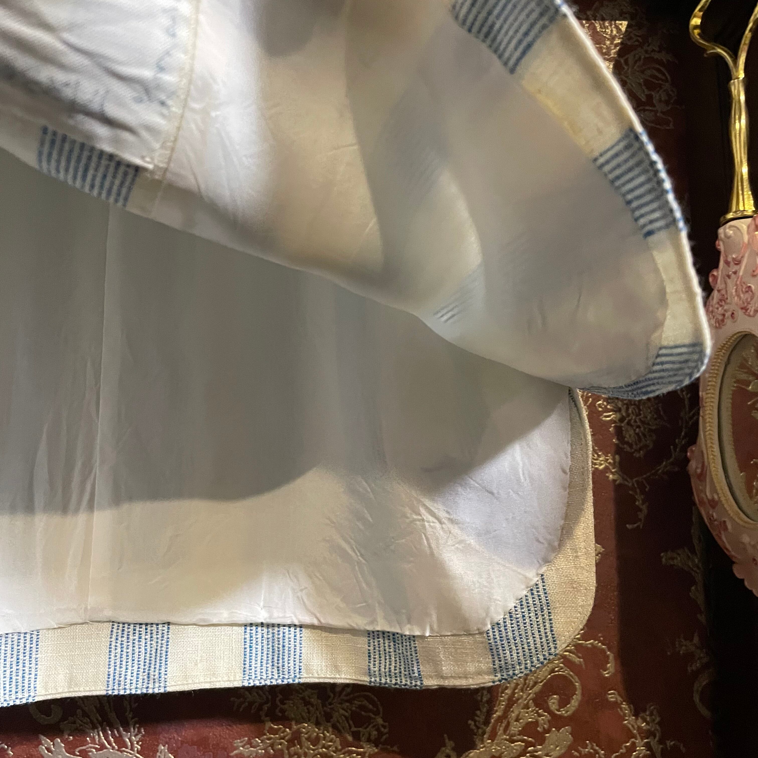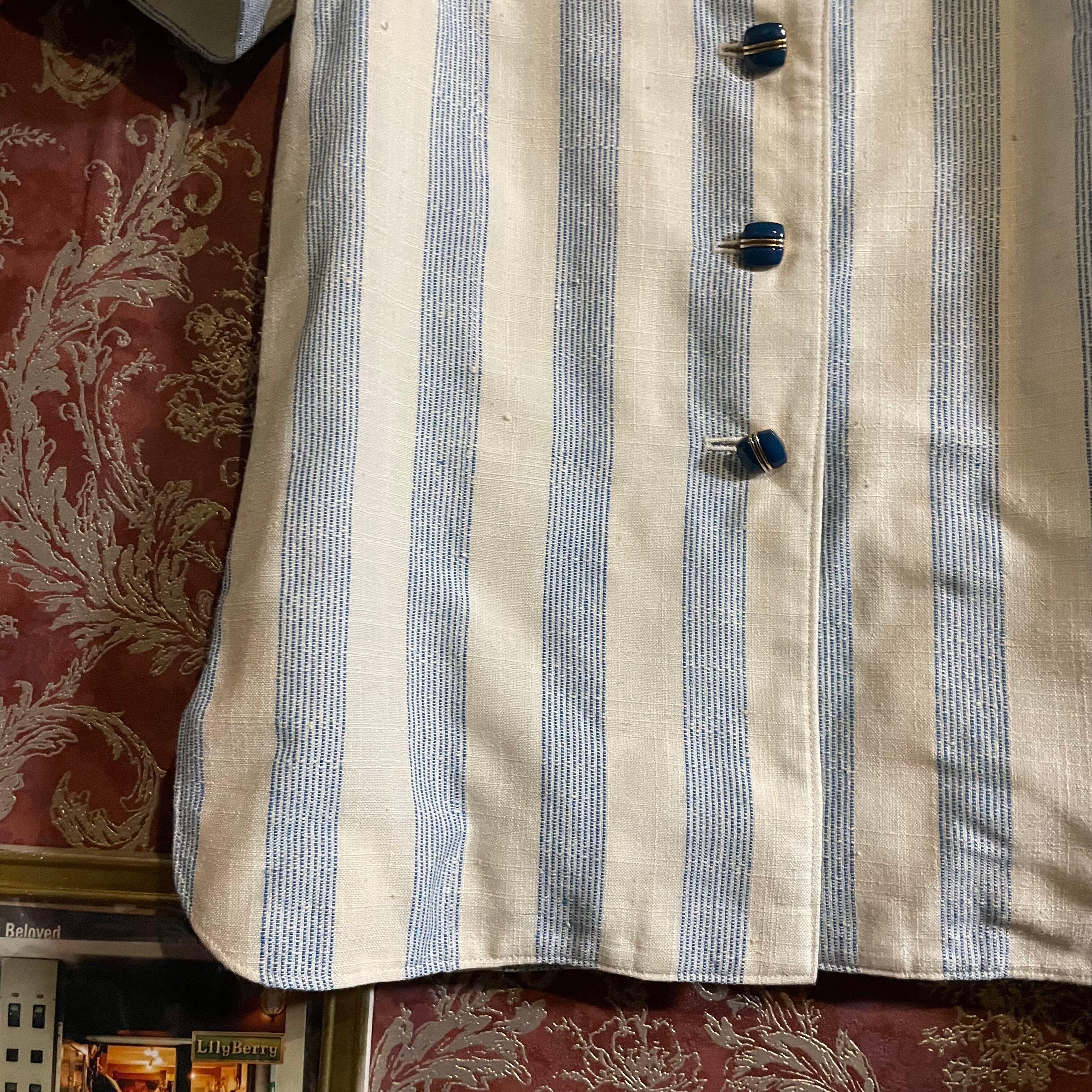 生成りに近い白をベースに、青のストライプ柄が織り込まれた爽やかなジャケットです。