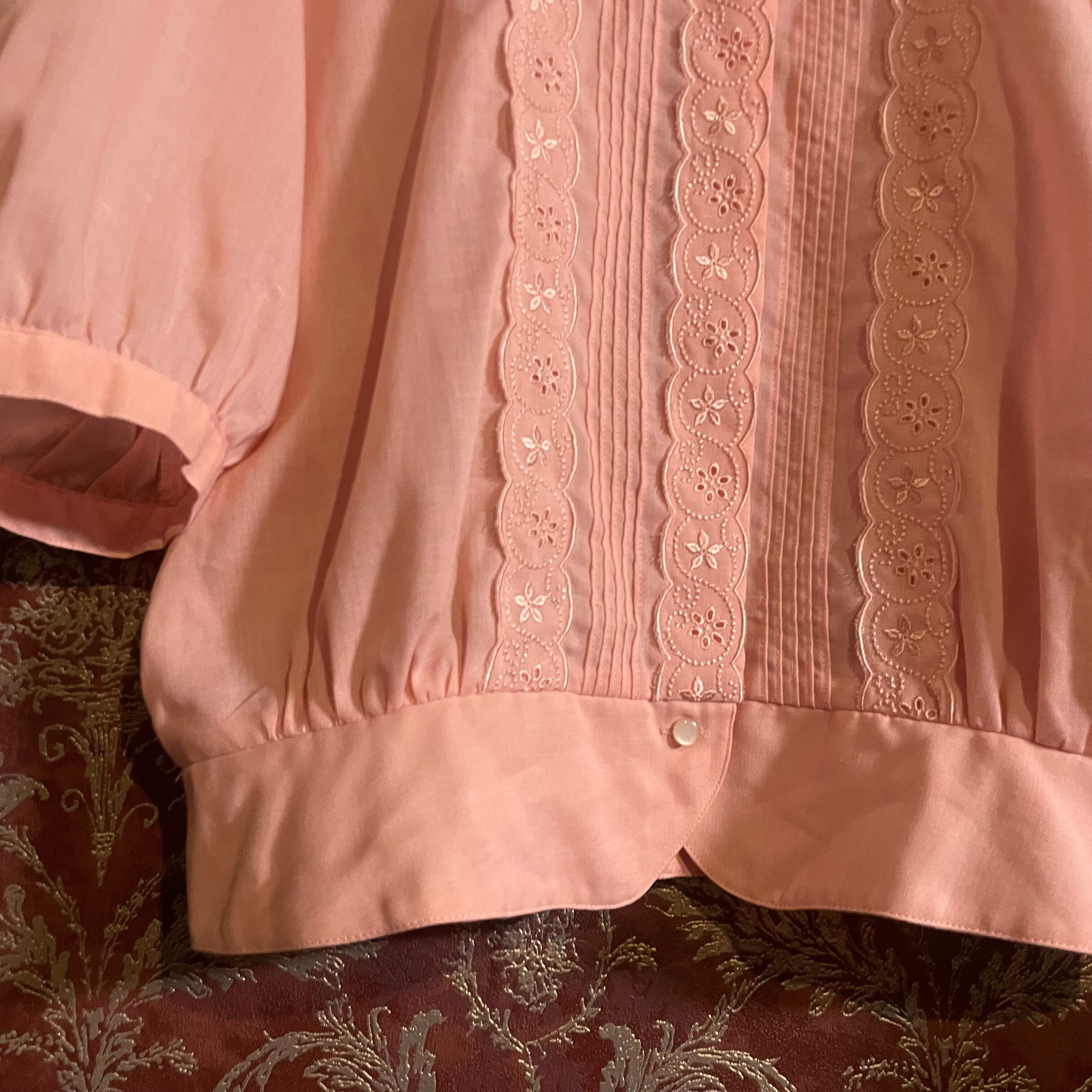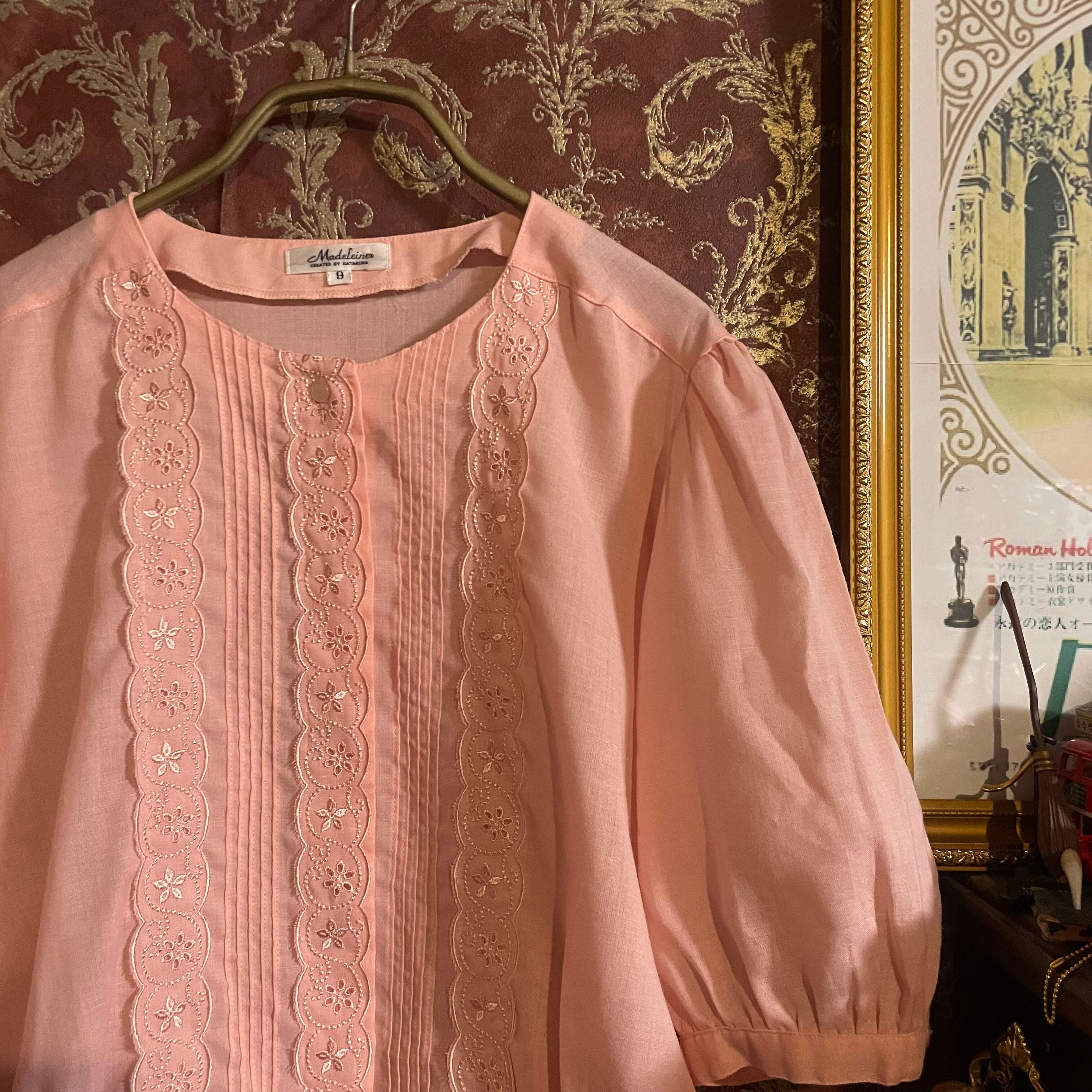 柔らかなピンクが可愛らしい半袖のブラウスです。