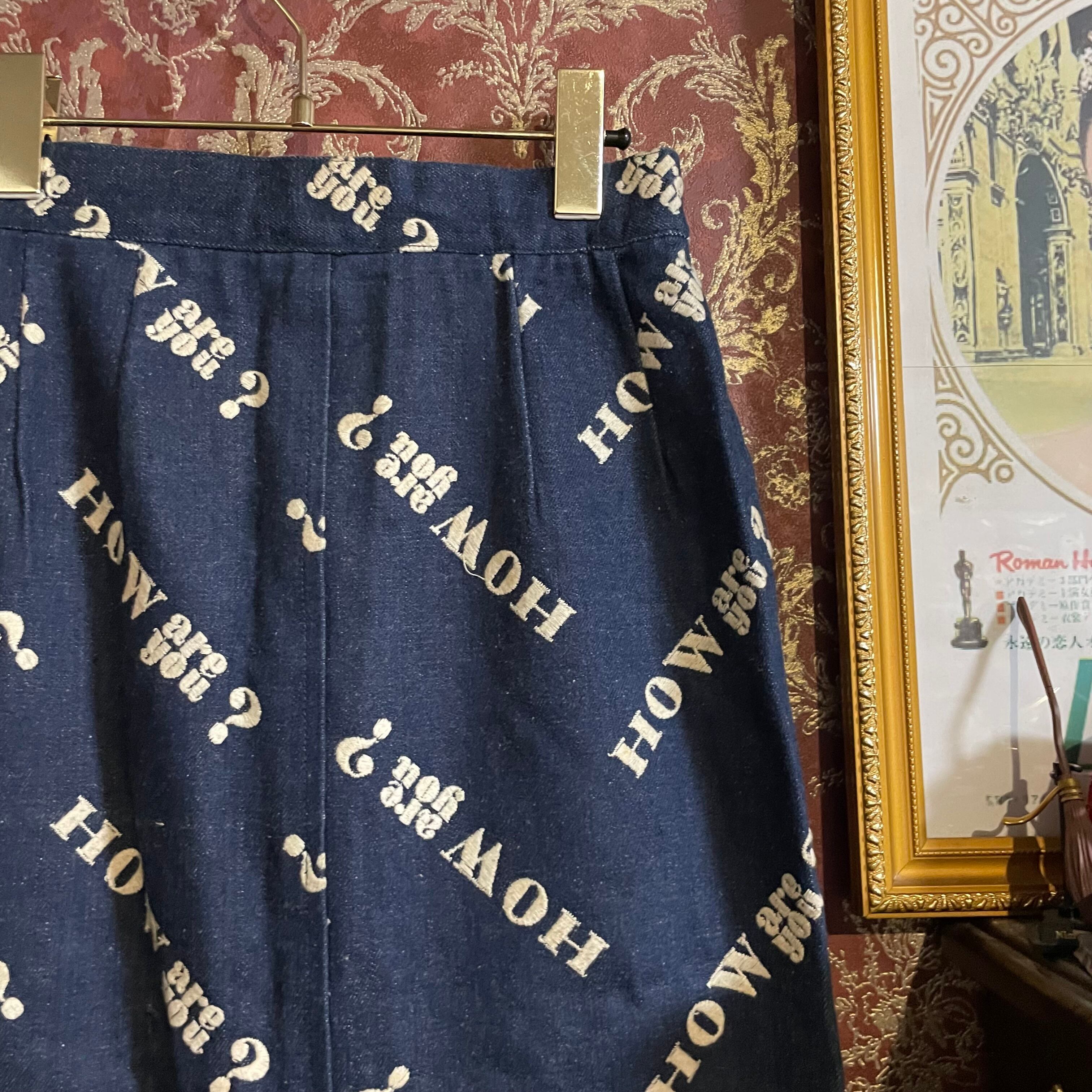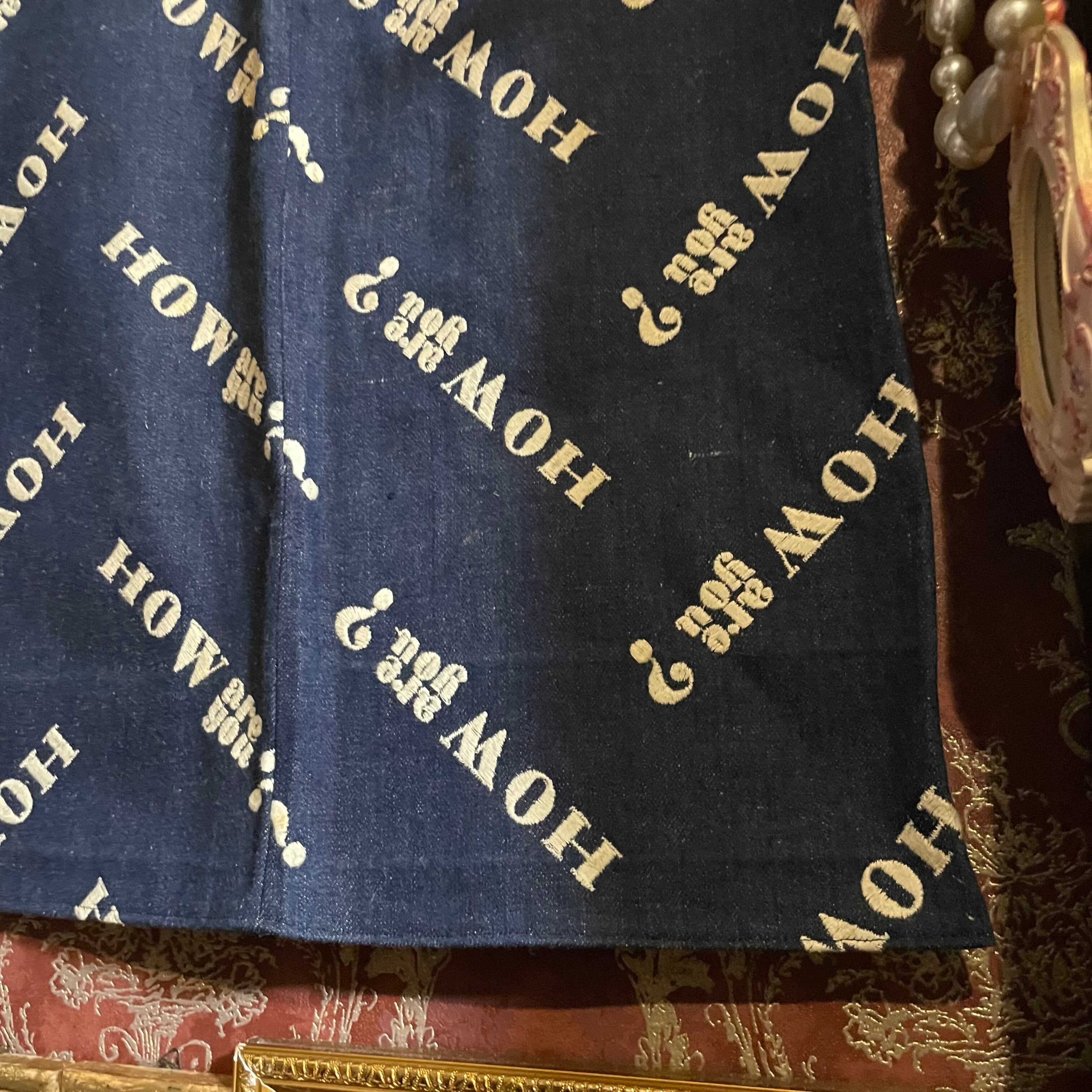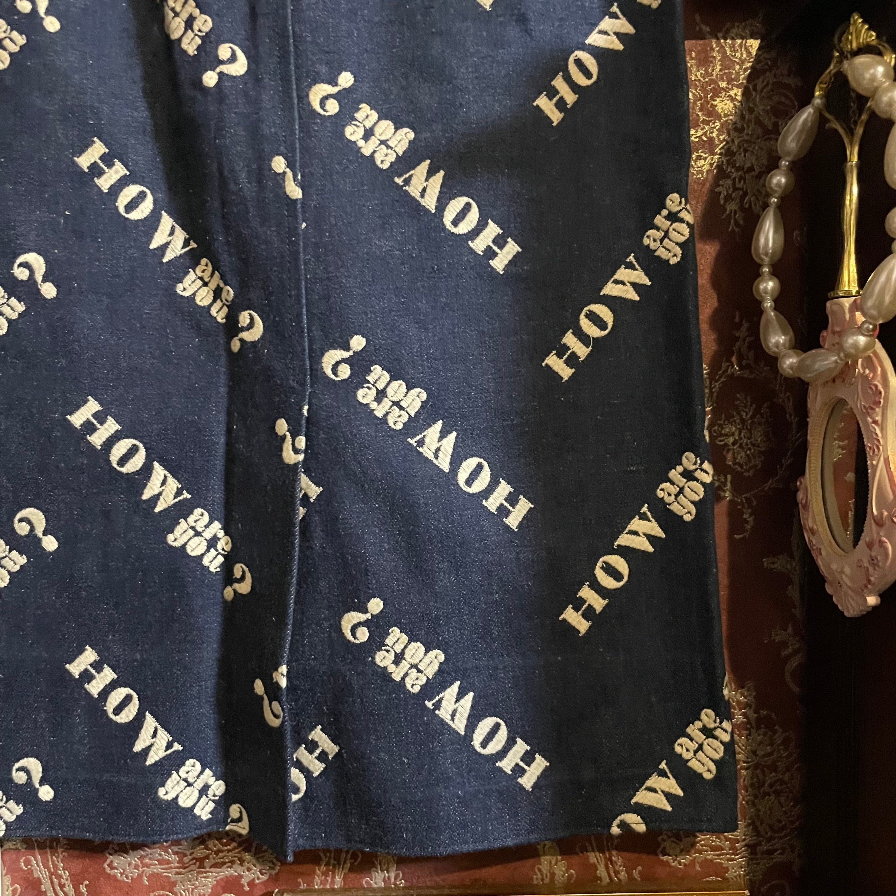 HOW are you?」の刺繍が全体に施された、遊び心あふれるデニムスカートです。