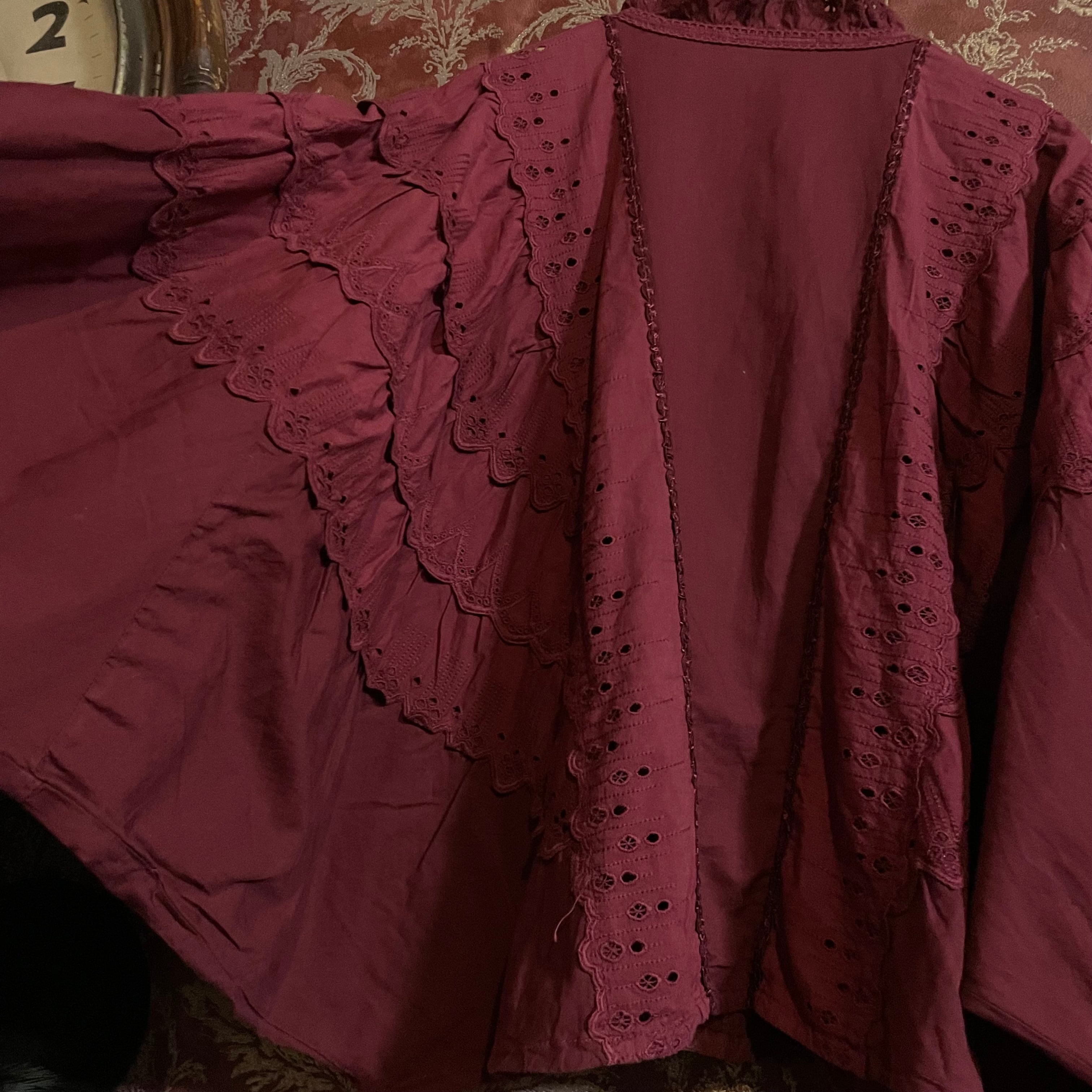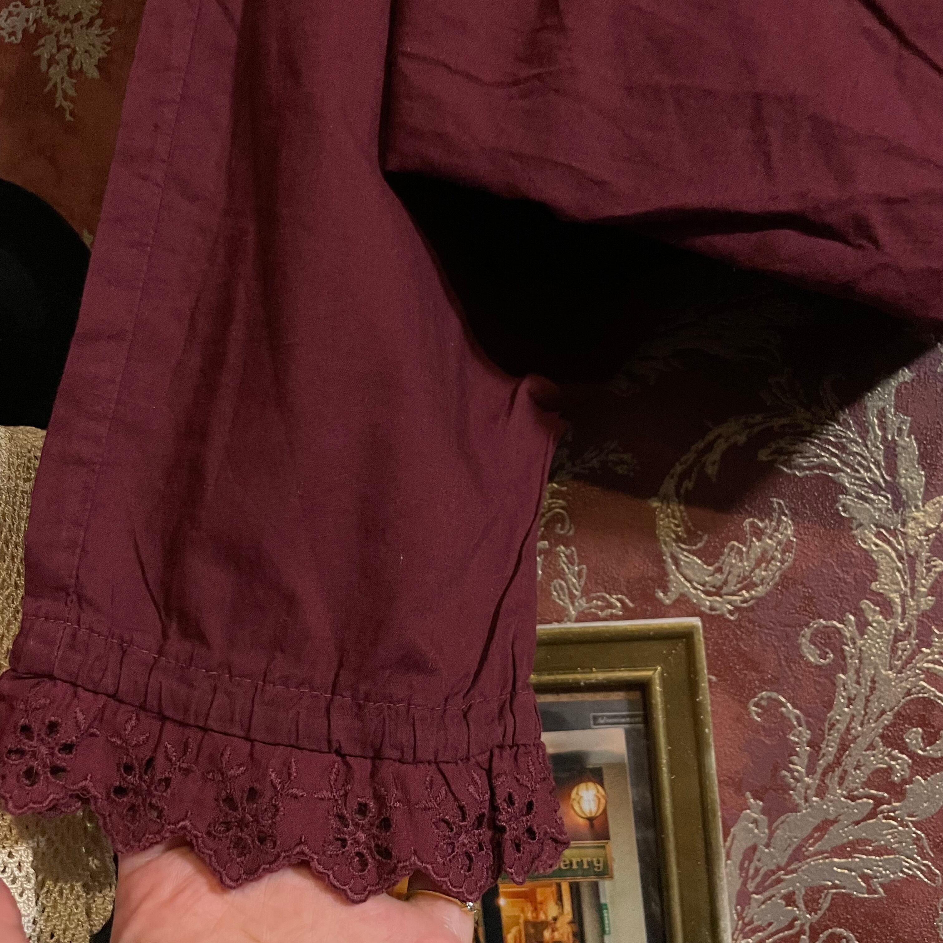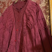 深みのあるバーガンディカラー(赤紫系)で仕立てられた、クラシカルな雰囲気漂うブラウスです。