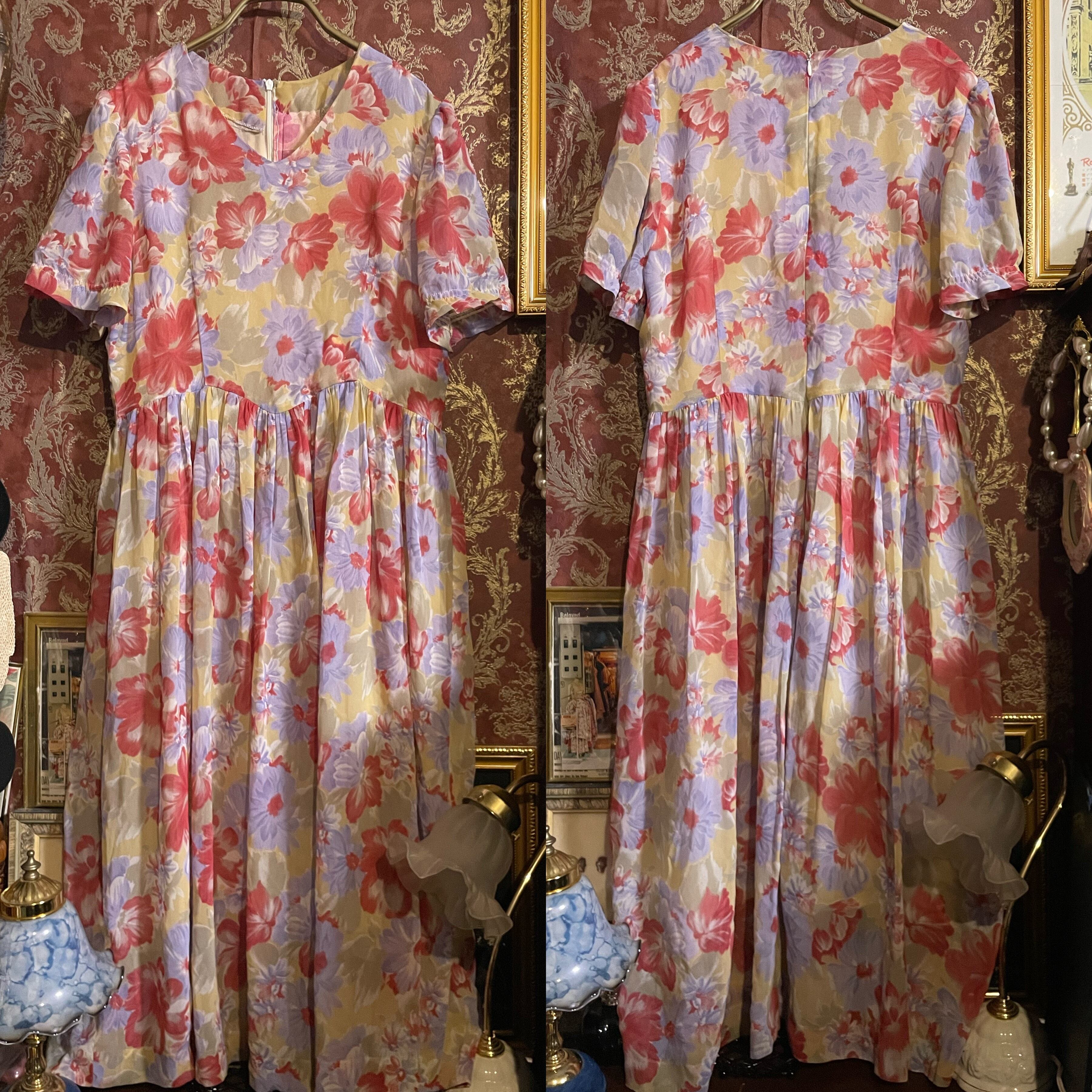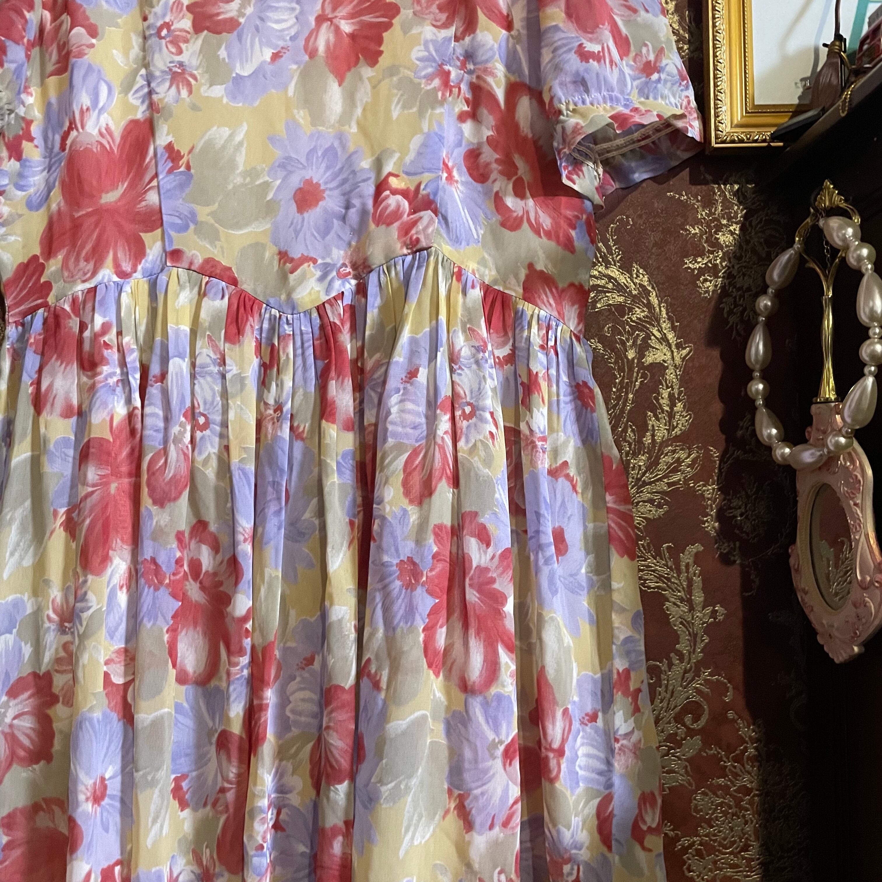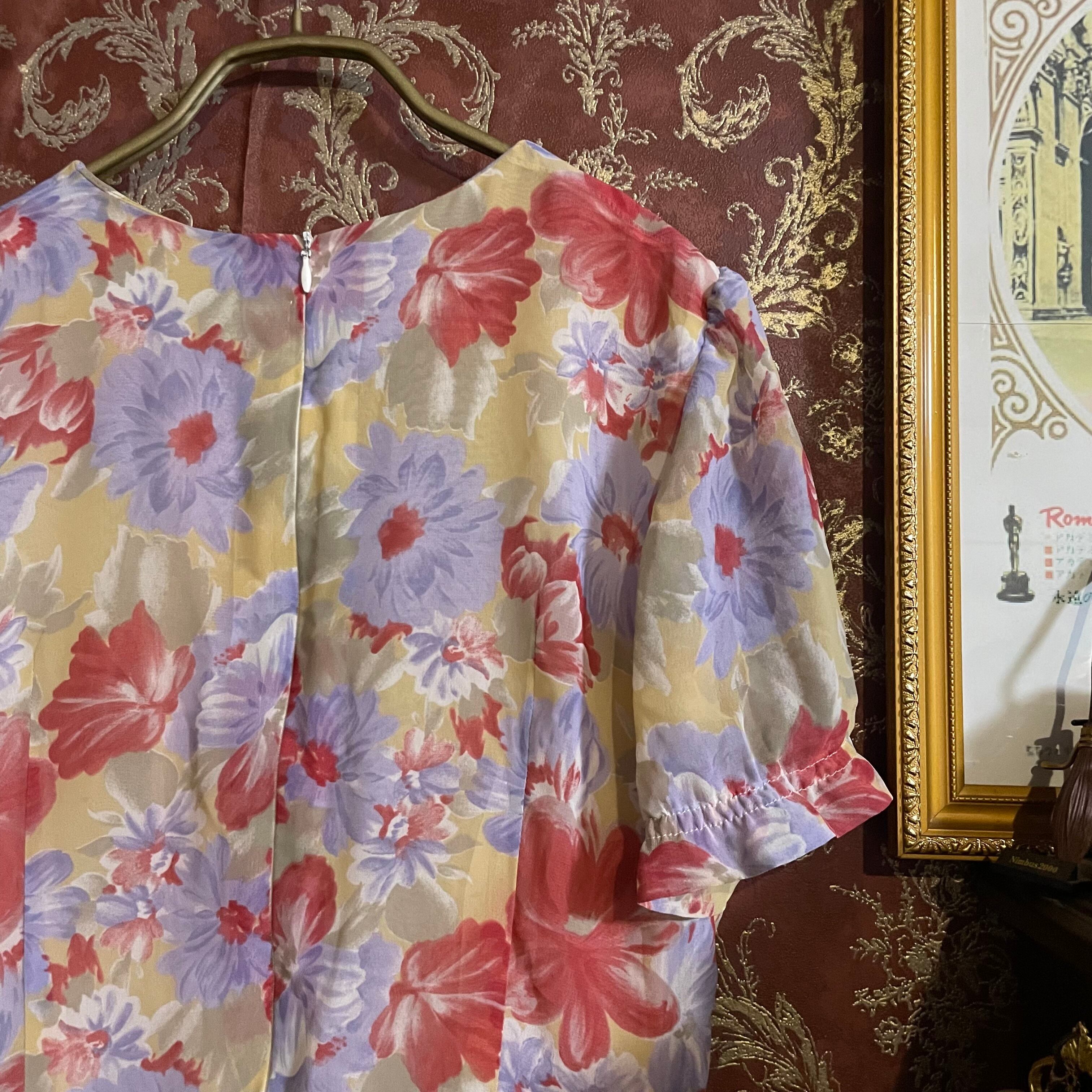 柔らかなくすみイエロー地にラベンダー、ピンク、レッドのくすみカラーで統一された大きな花柄が印象的な、レトロムード漂う半袖ワンピースです。