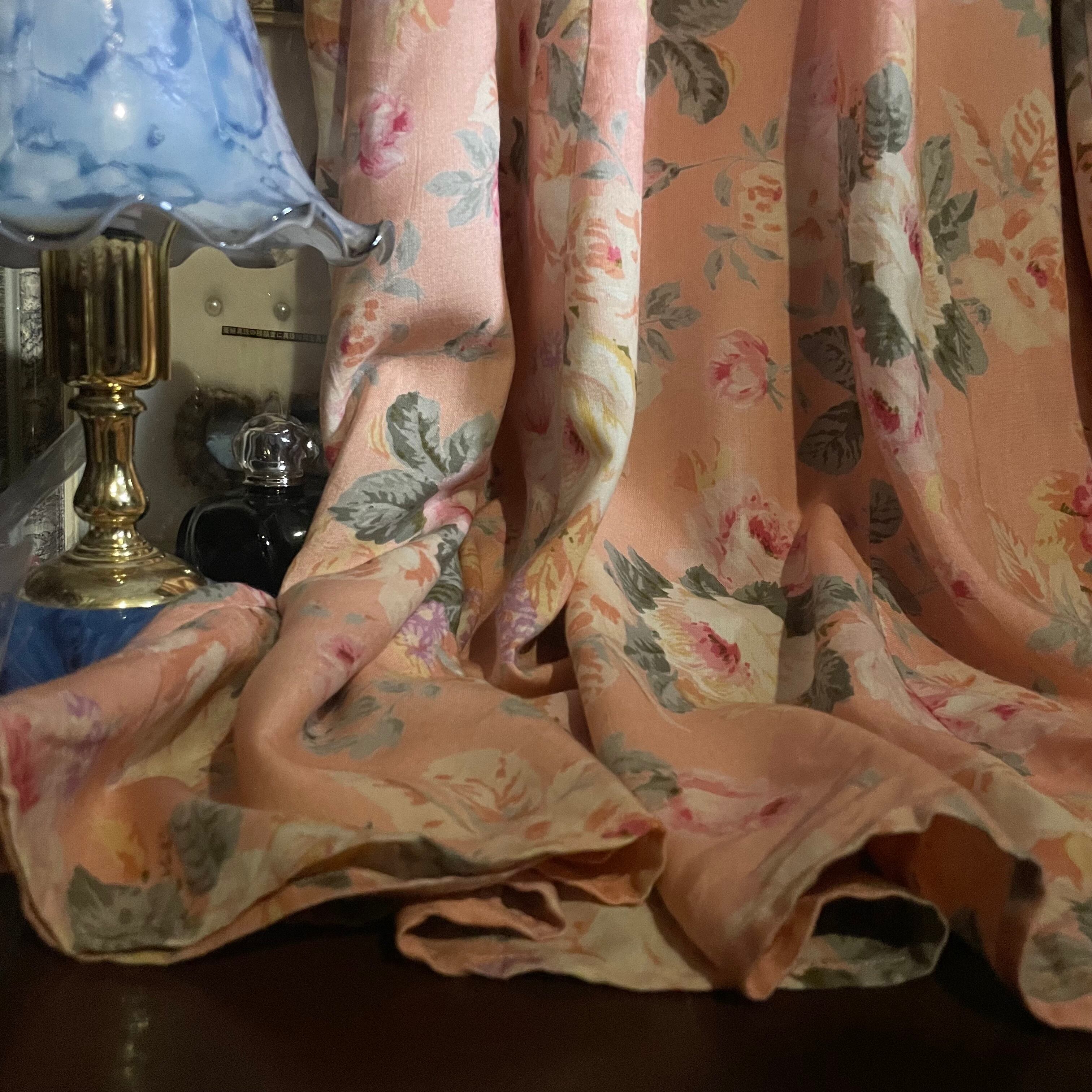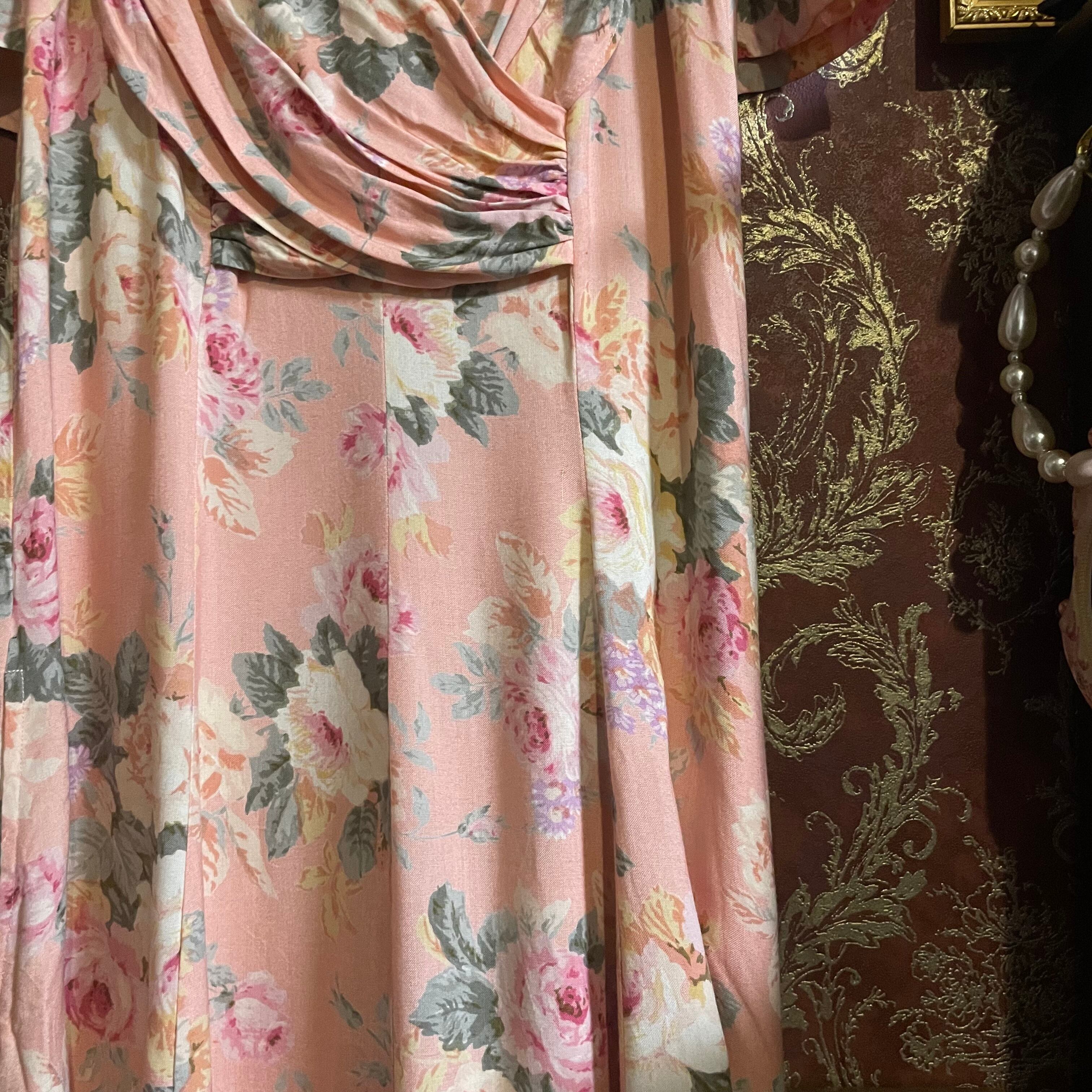 ピンク地に繊細なローズ柄が描かれた、ロマンティックでクラシカルな雰囲気漂うロングドレスです。