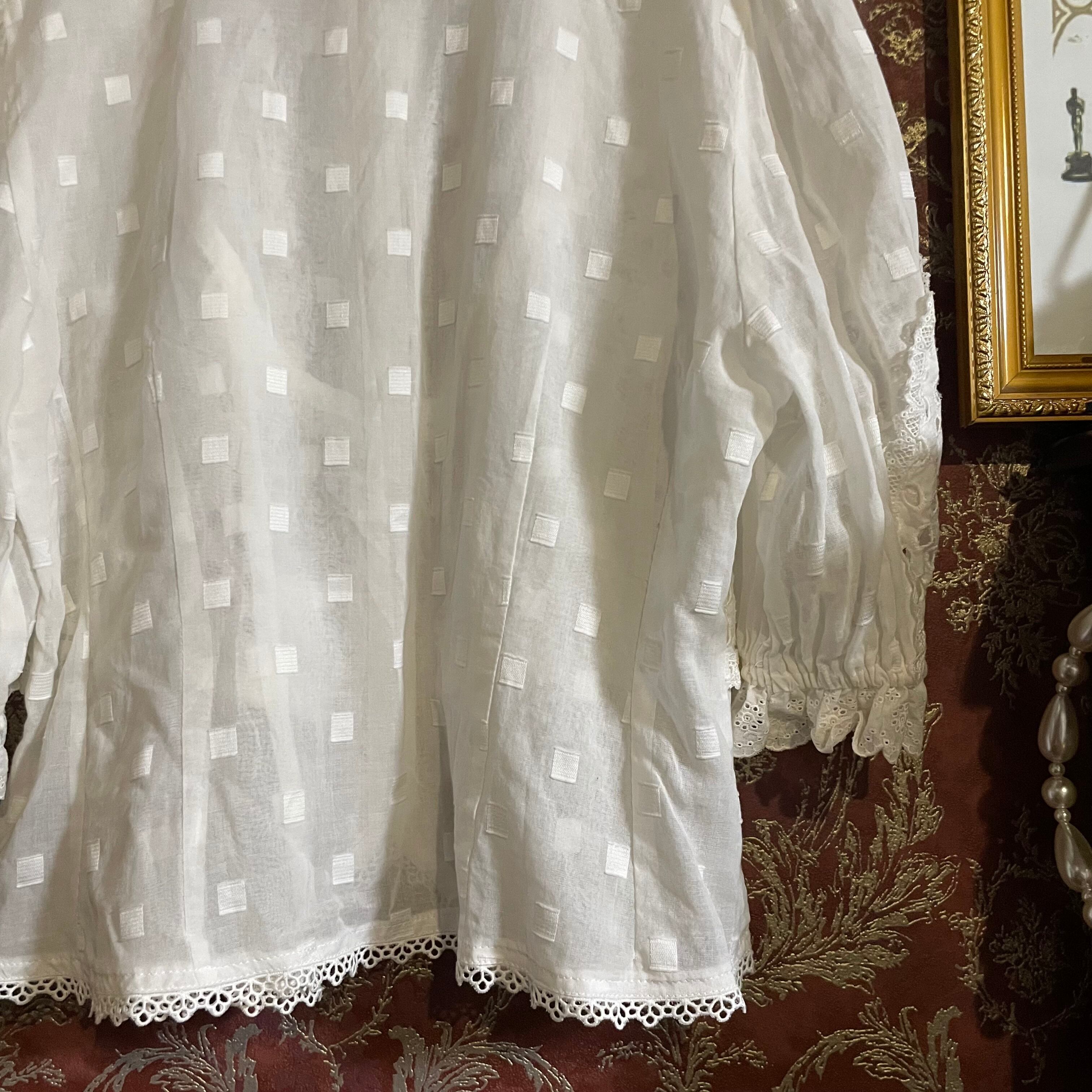 繊細なレースと立体的なフラワーモチーフが印象的な、ホワイトコットンブラウスです。