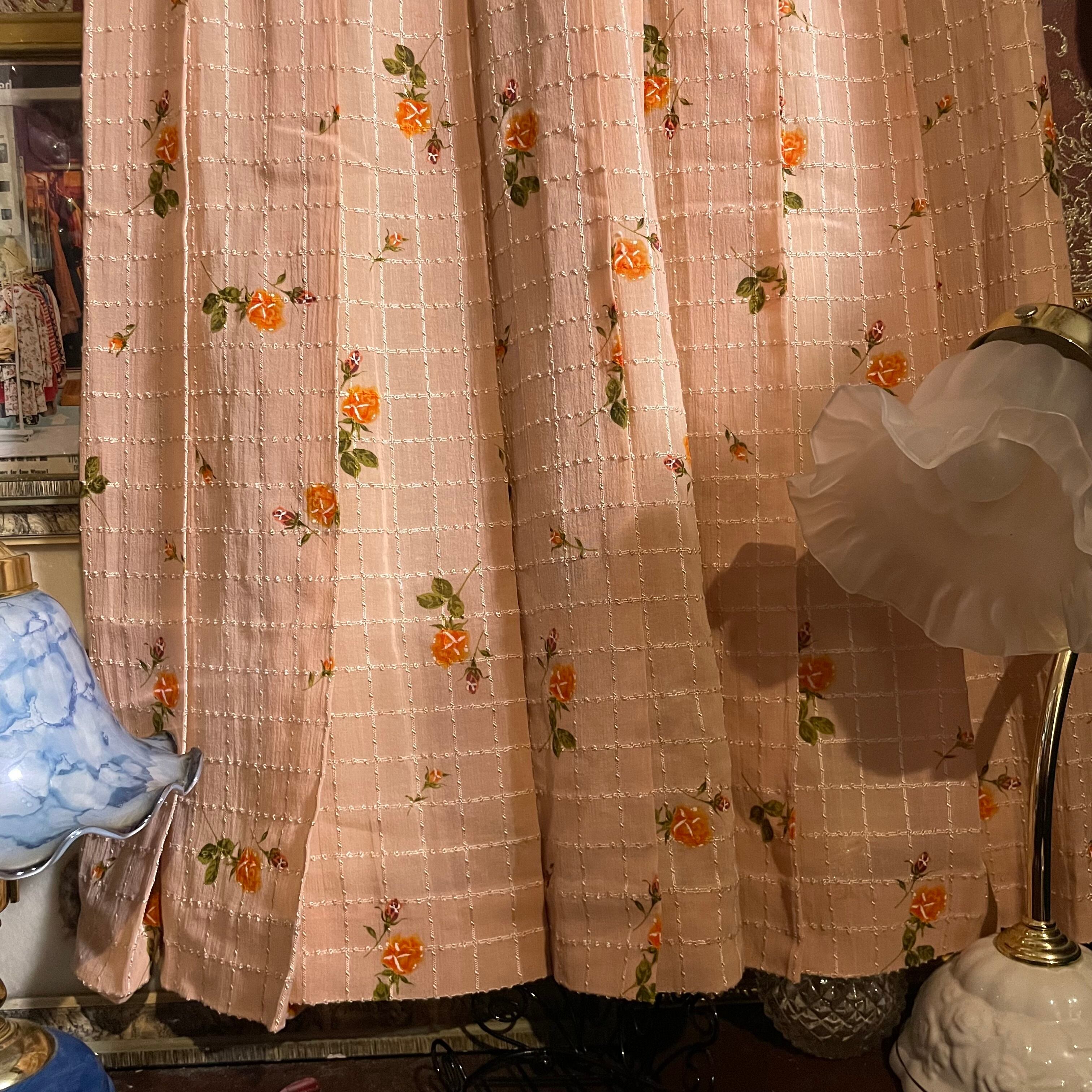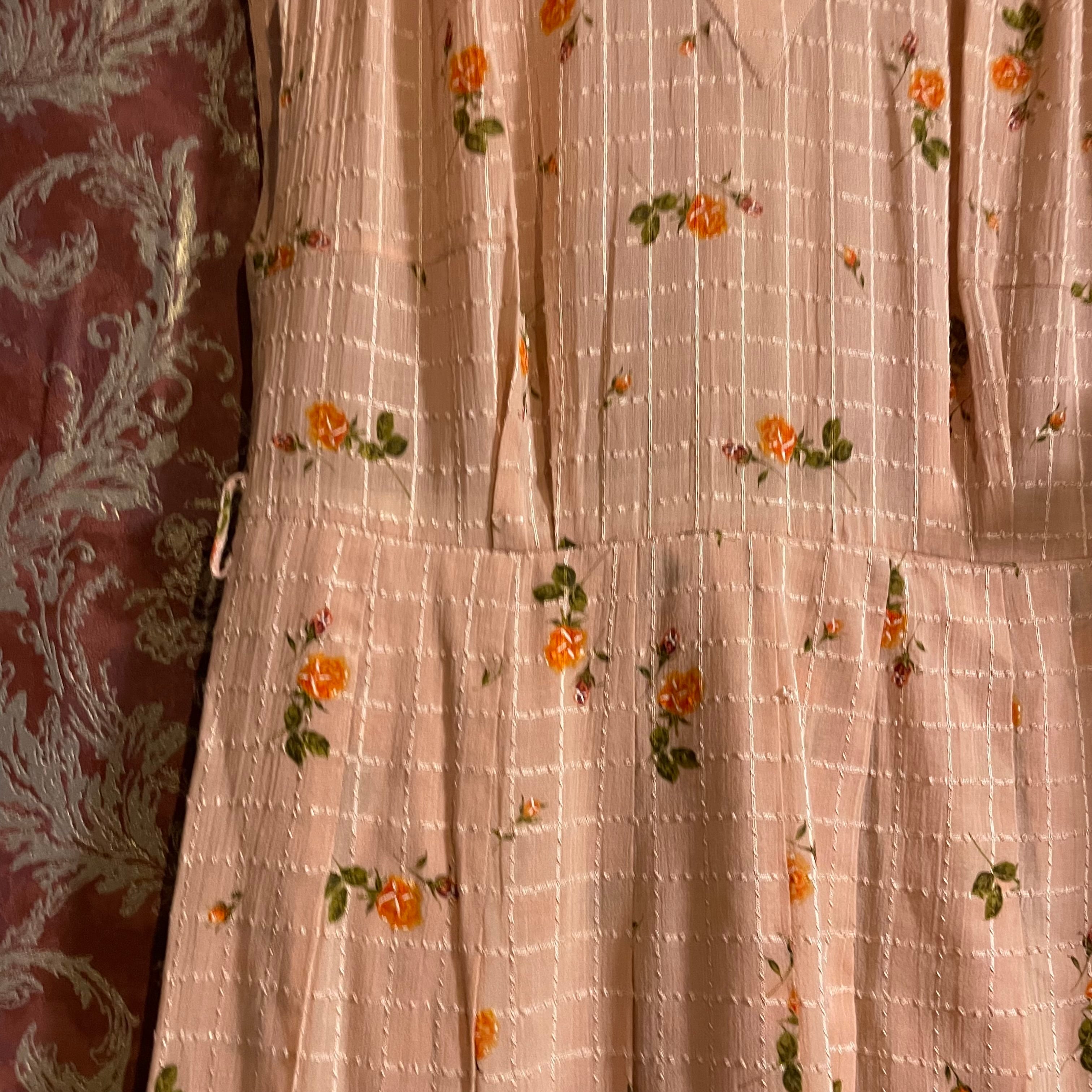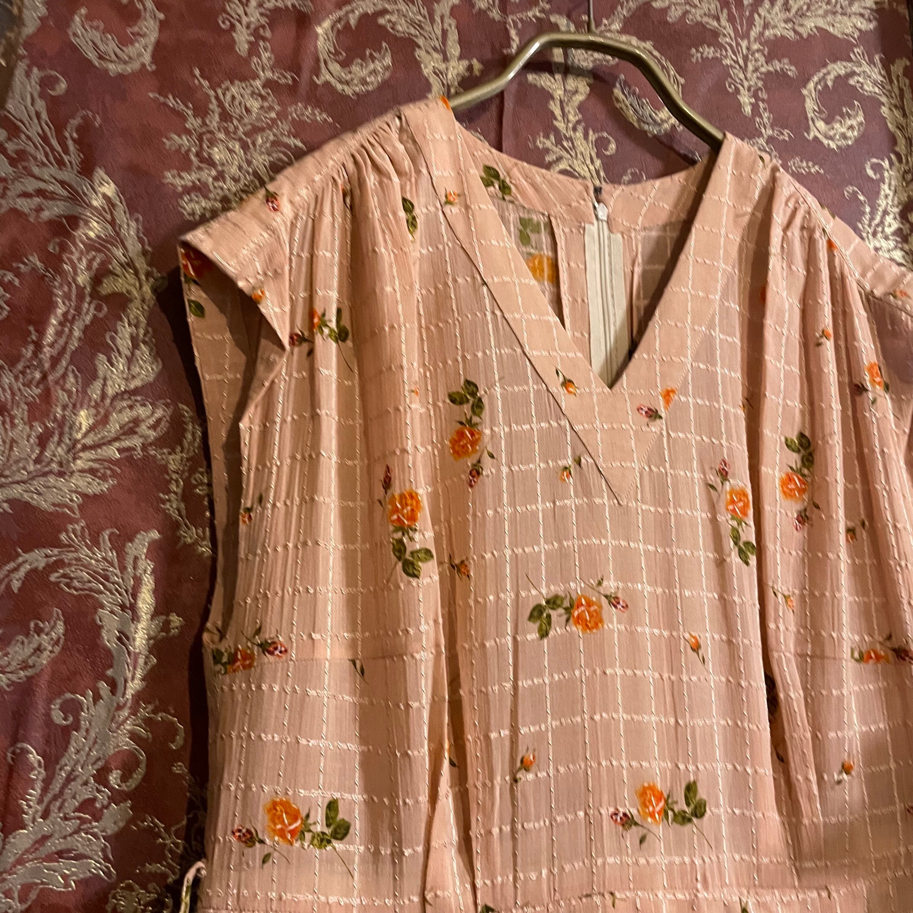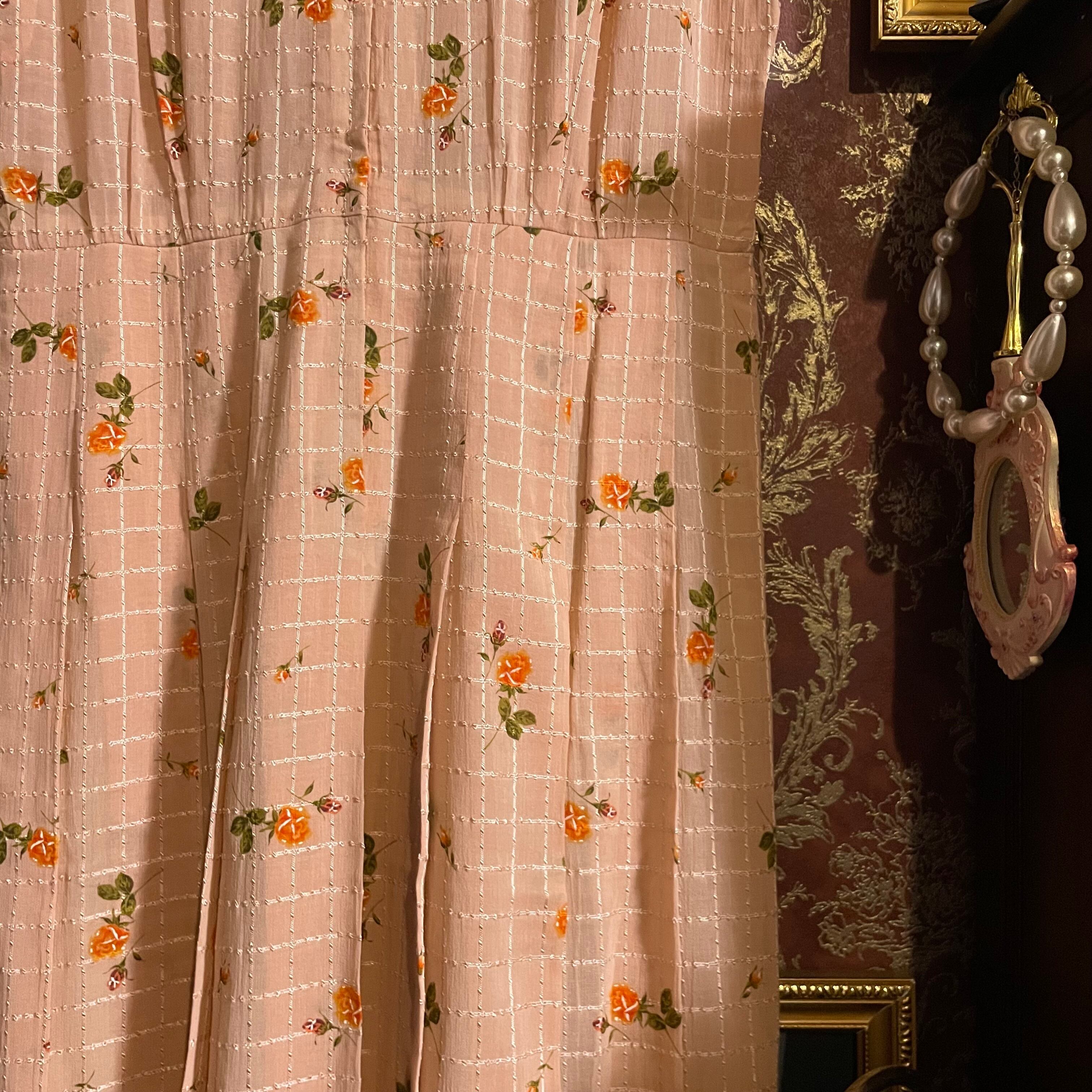 柔らかなピンクベージュ地に、オレンジの小花柄と繊細なチェックが組み合わされた、優しげな印象のヴィンテージワンピースです。