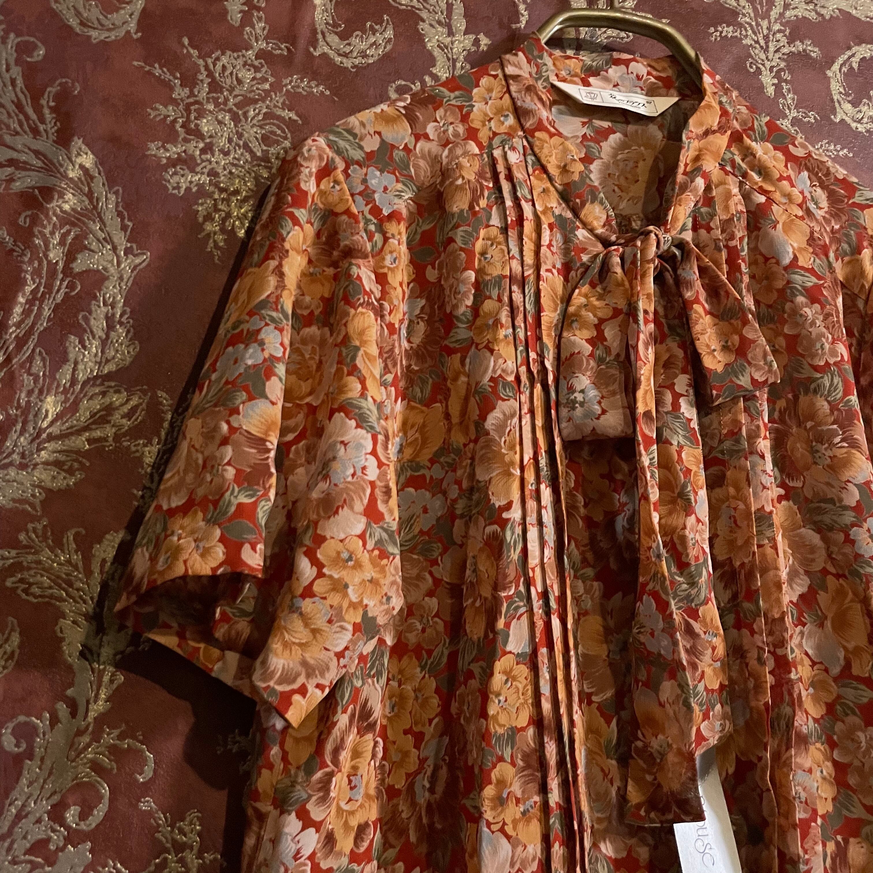 全面にあしらわれたレトロなフラワープリントが目を惹き、温かみのある色合いで柔らかな雰囲気です。