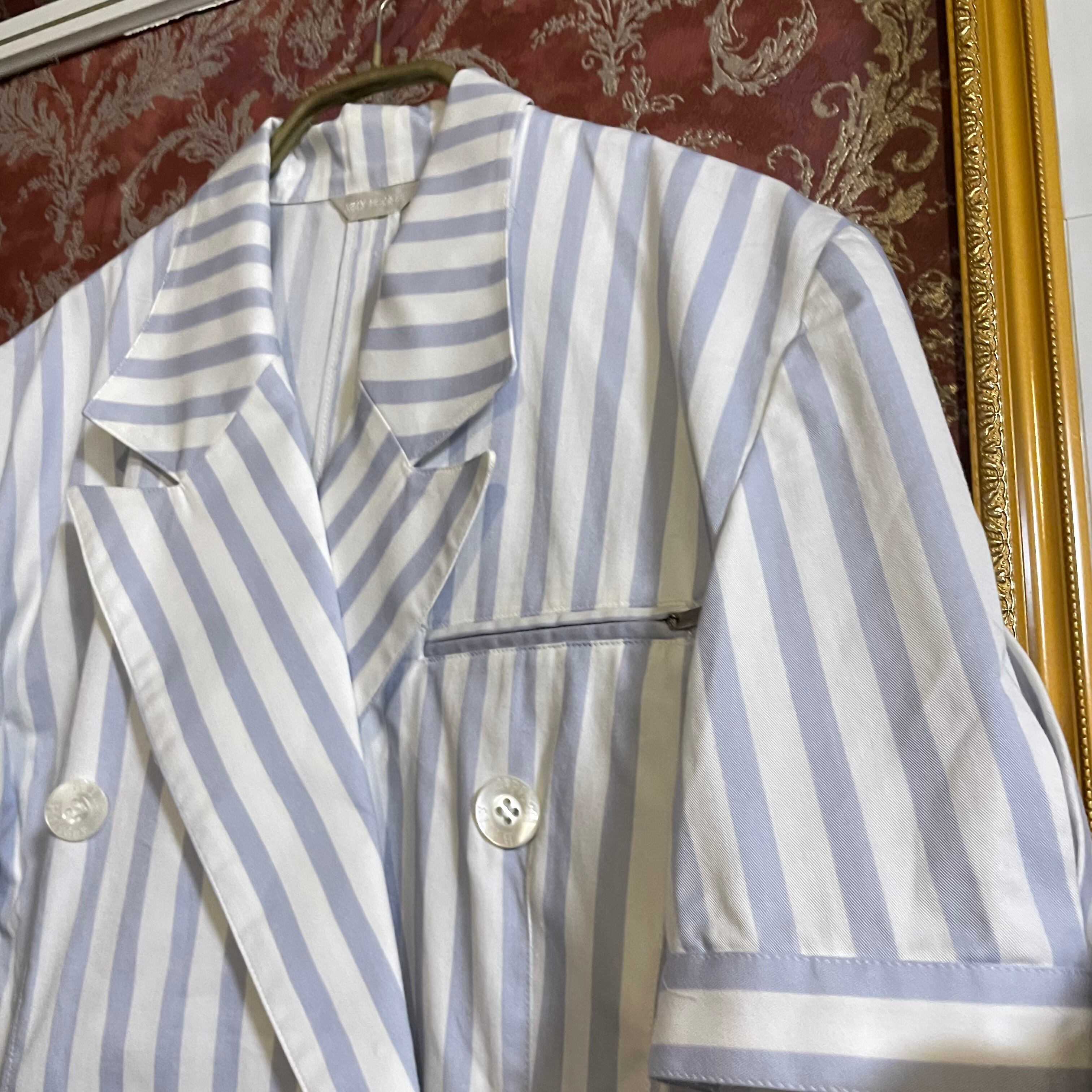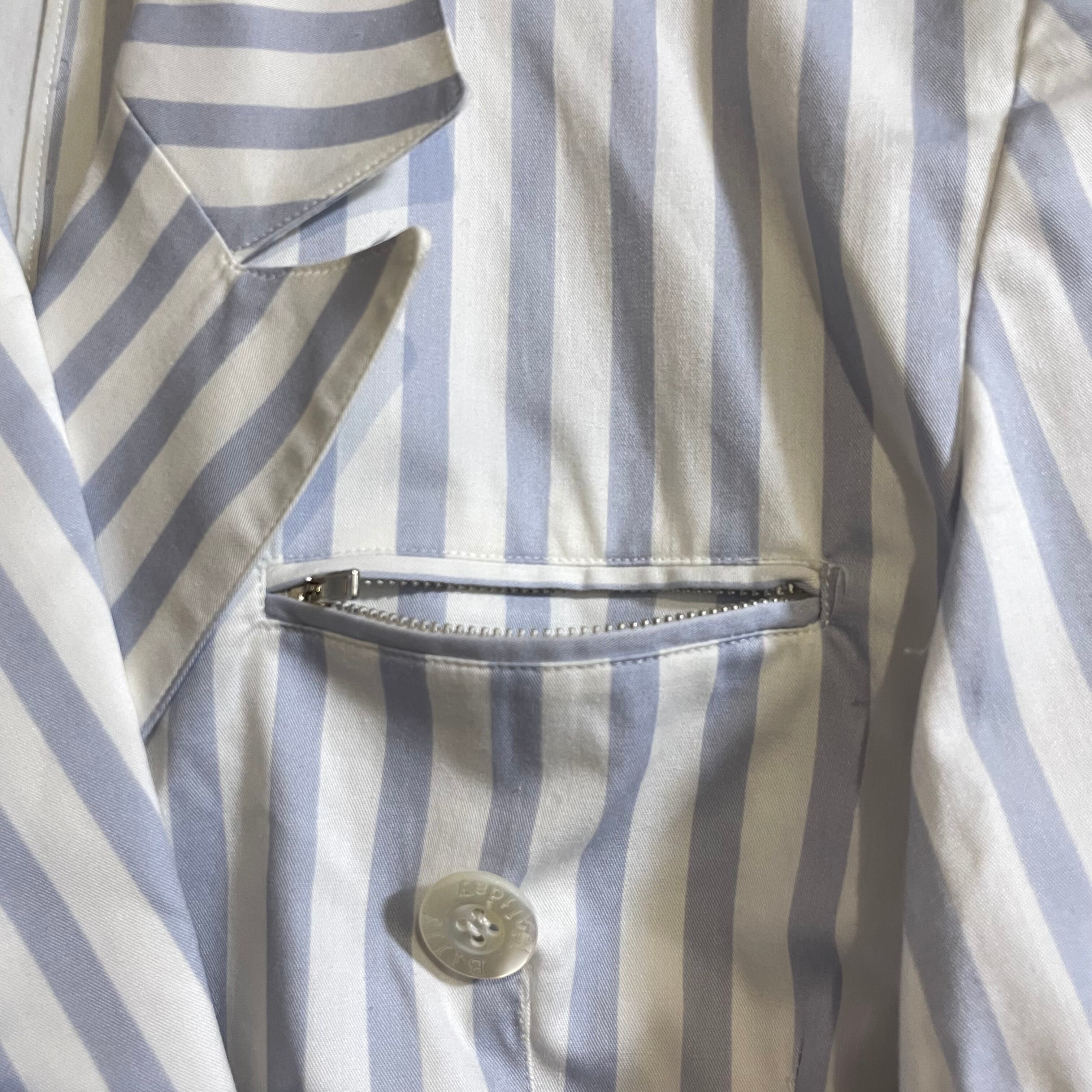 柔らかなホワイト×淡い水色のストライプは、清涼感と品の良さを兼ね備え、夏の装いにぴったりです。
