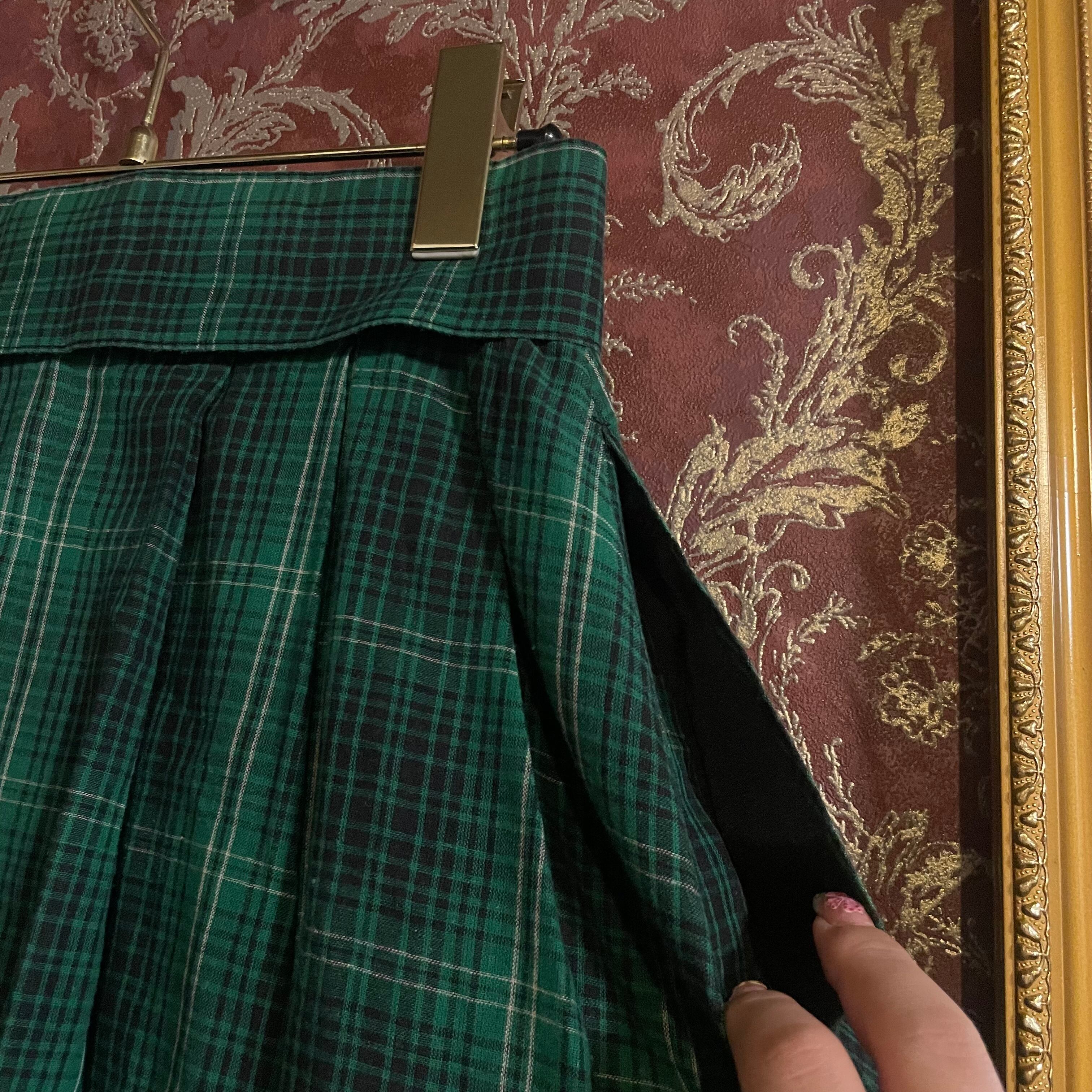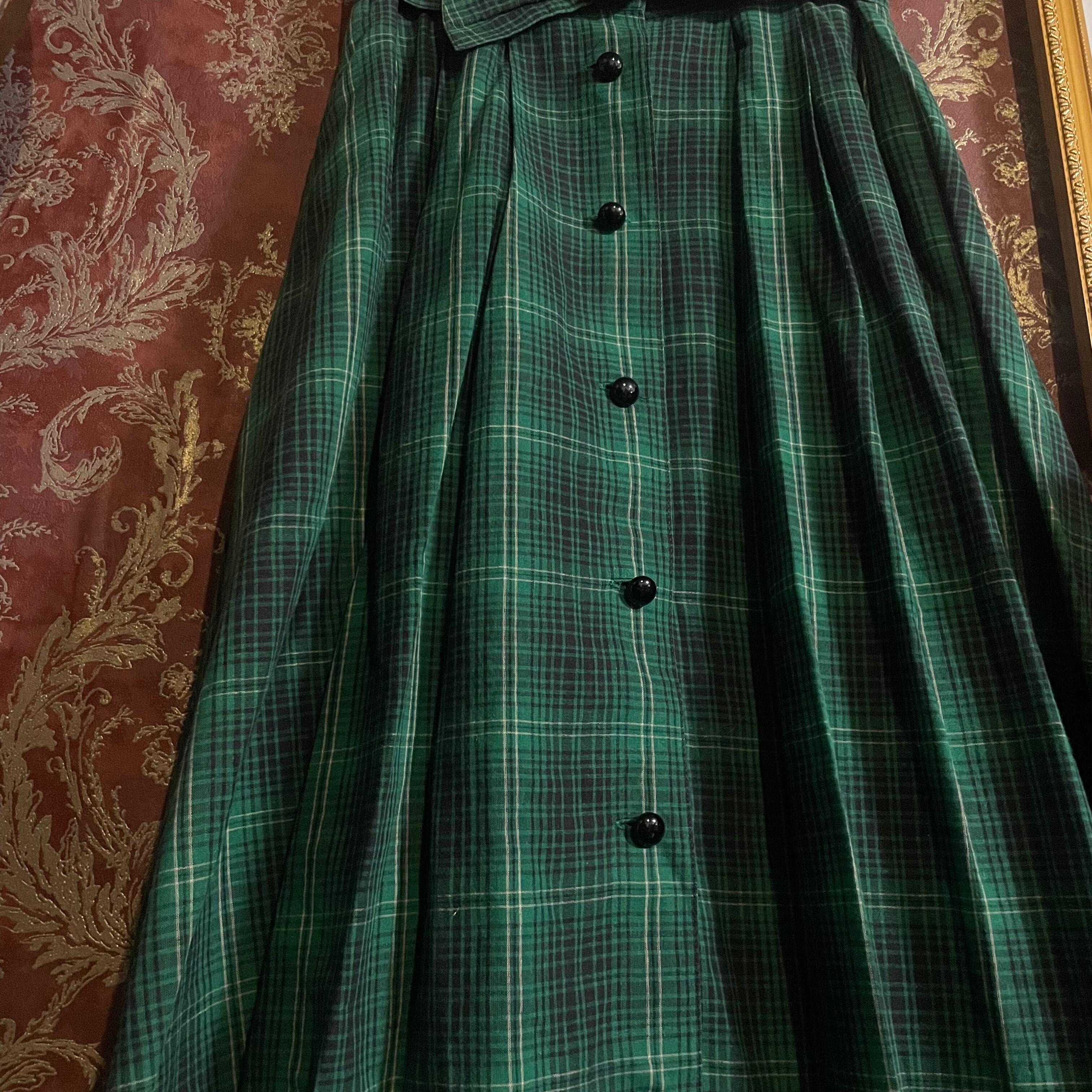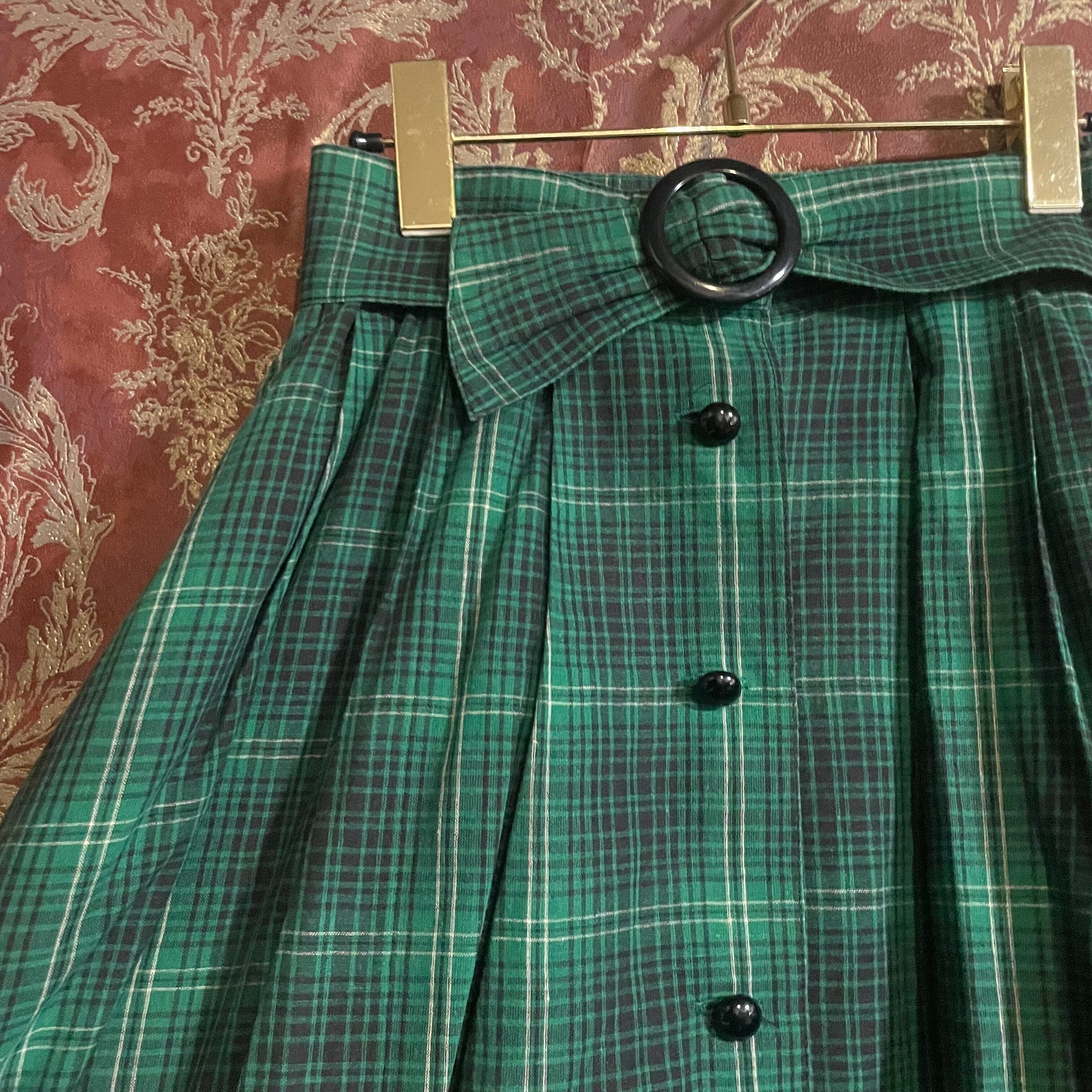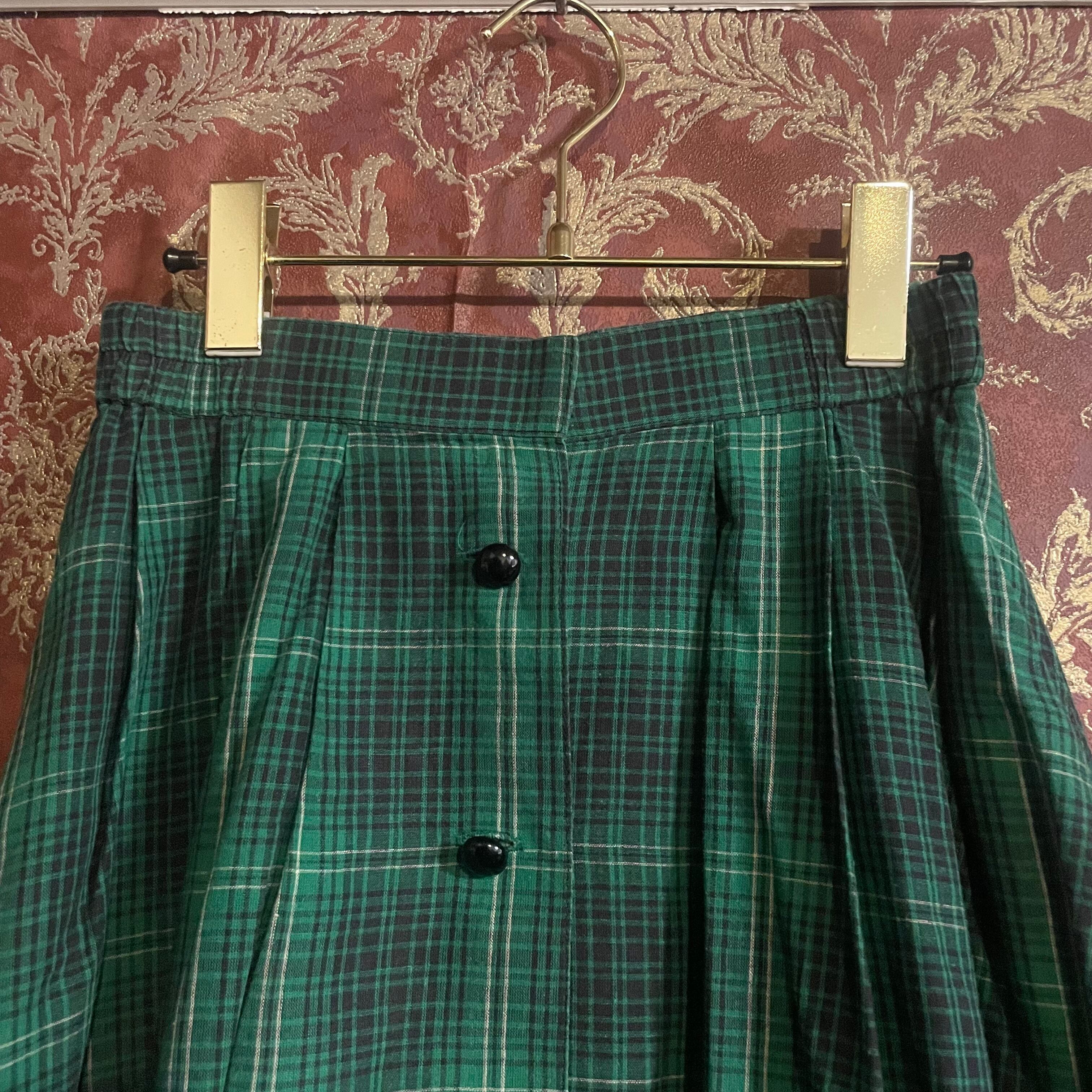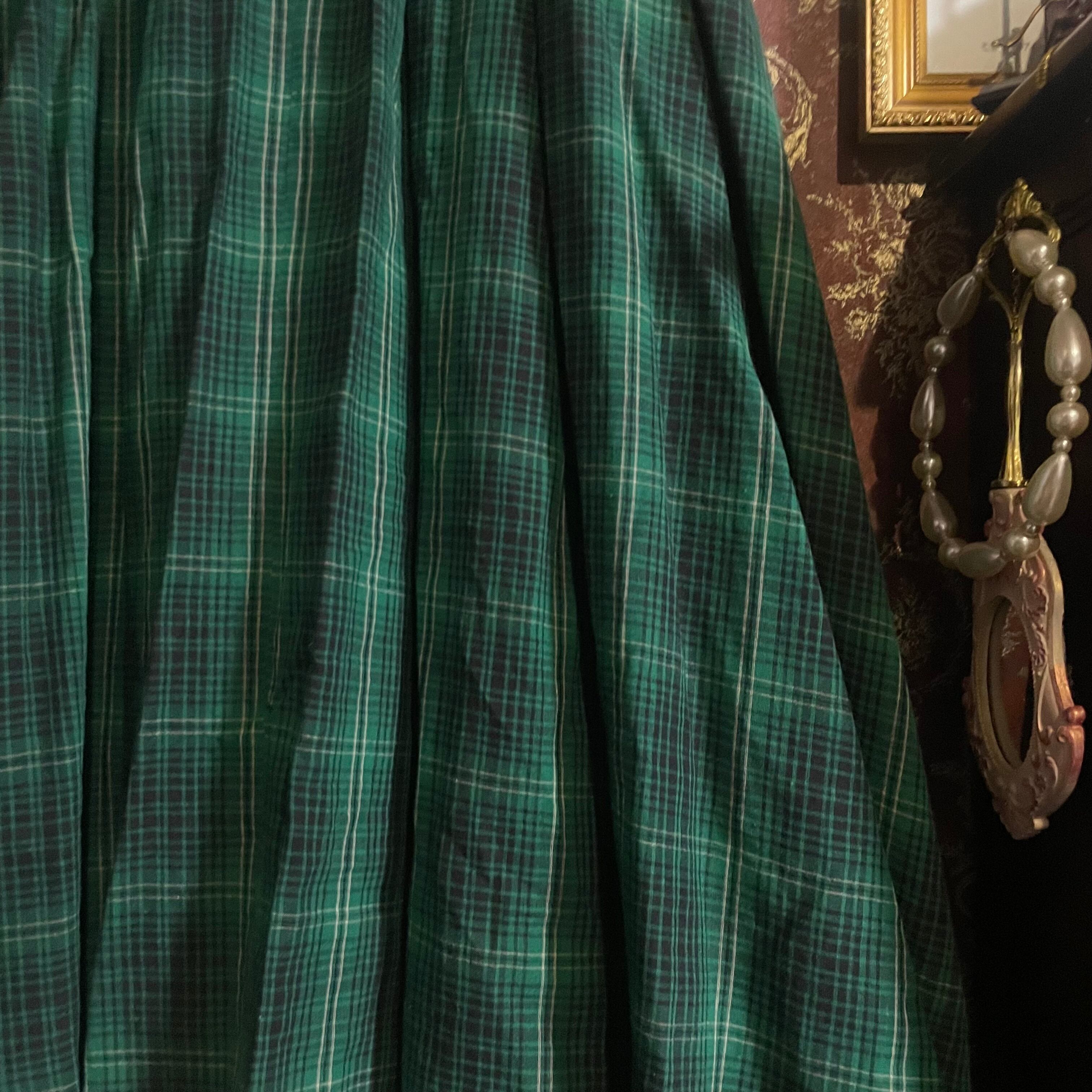 クラシカルな雰囲気漂う、深みのあるグリーンチェックのフレアスカートです。