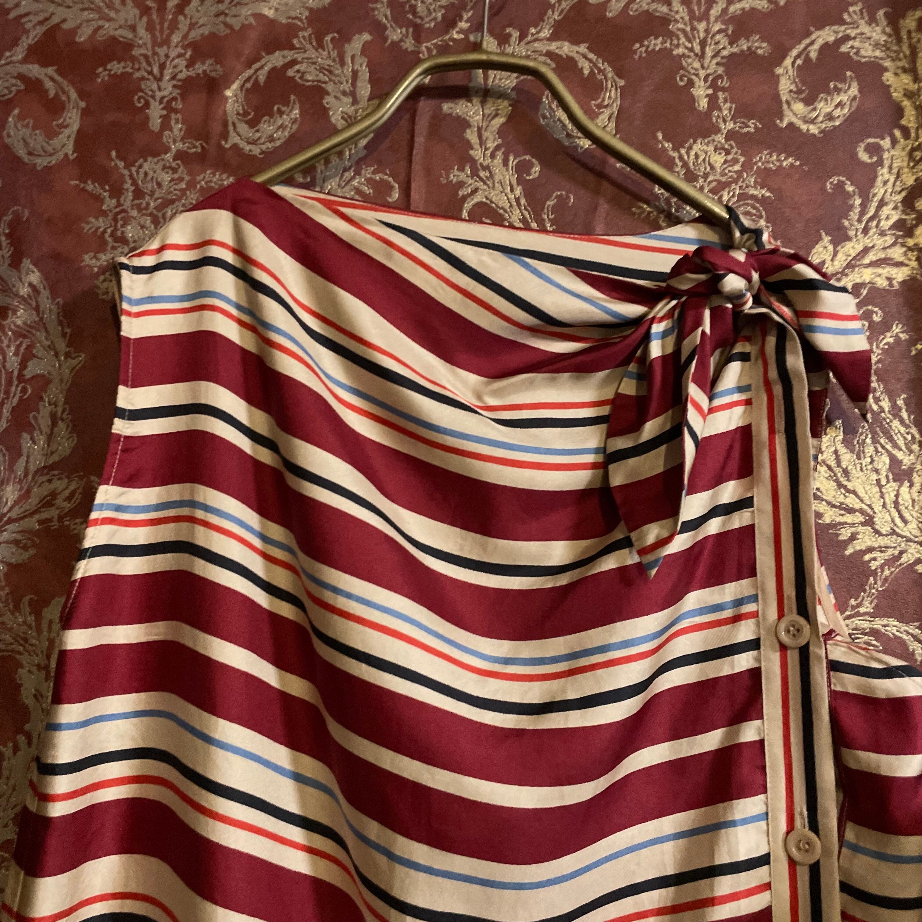 スカーフのような質感・デザイン、肩に結ぶリボン、片側に並んだボタンディテールが特徴的です。