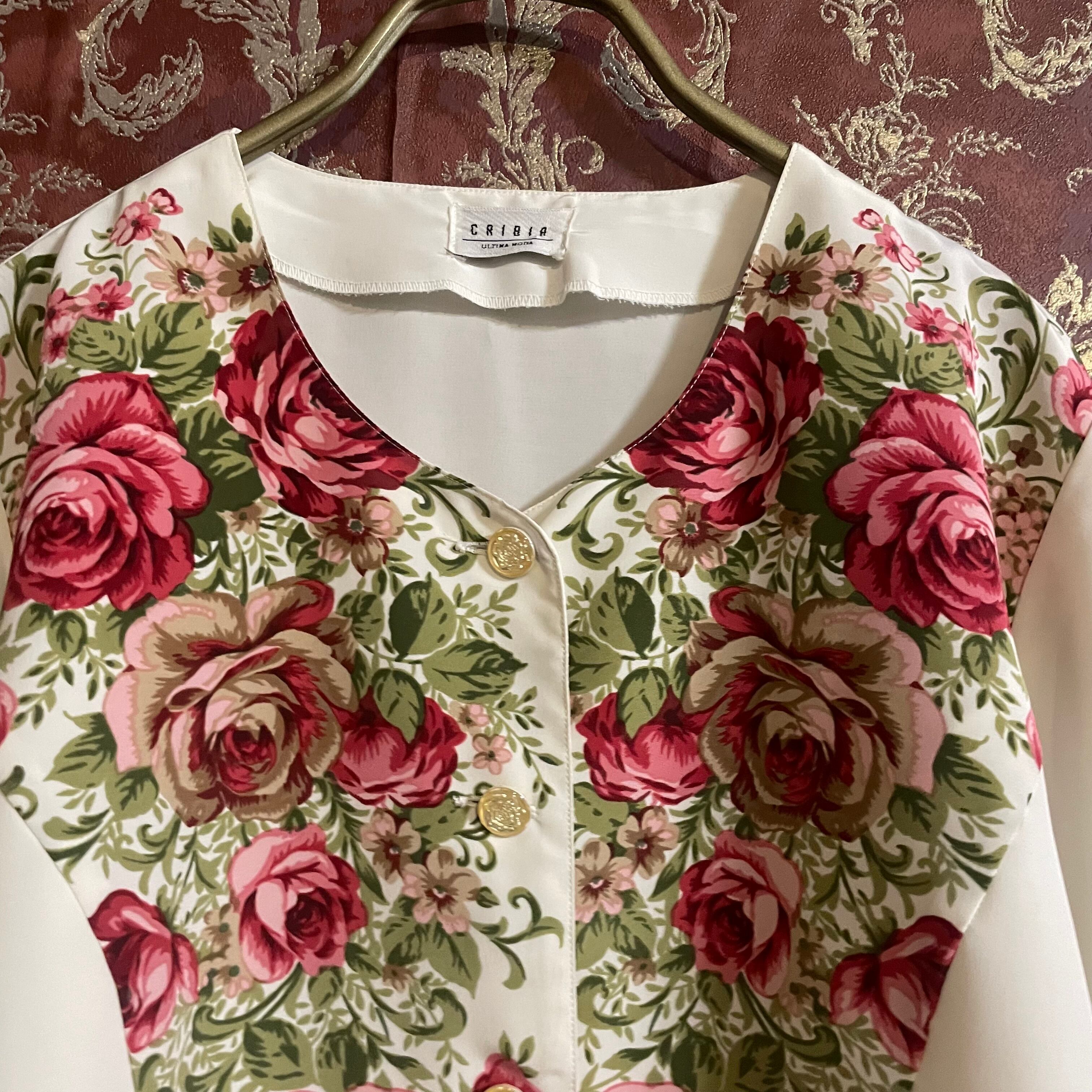 フロントと袖口には色鮮やかなローズ柄が贅沢にあしらわれ、ヴィンテージライクな魅力を引き立てます。