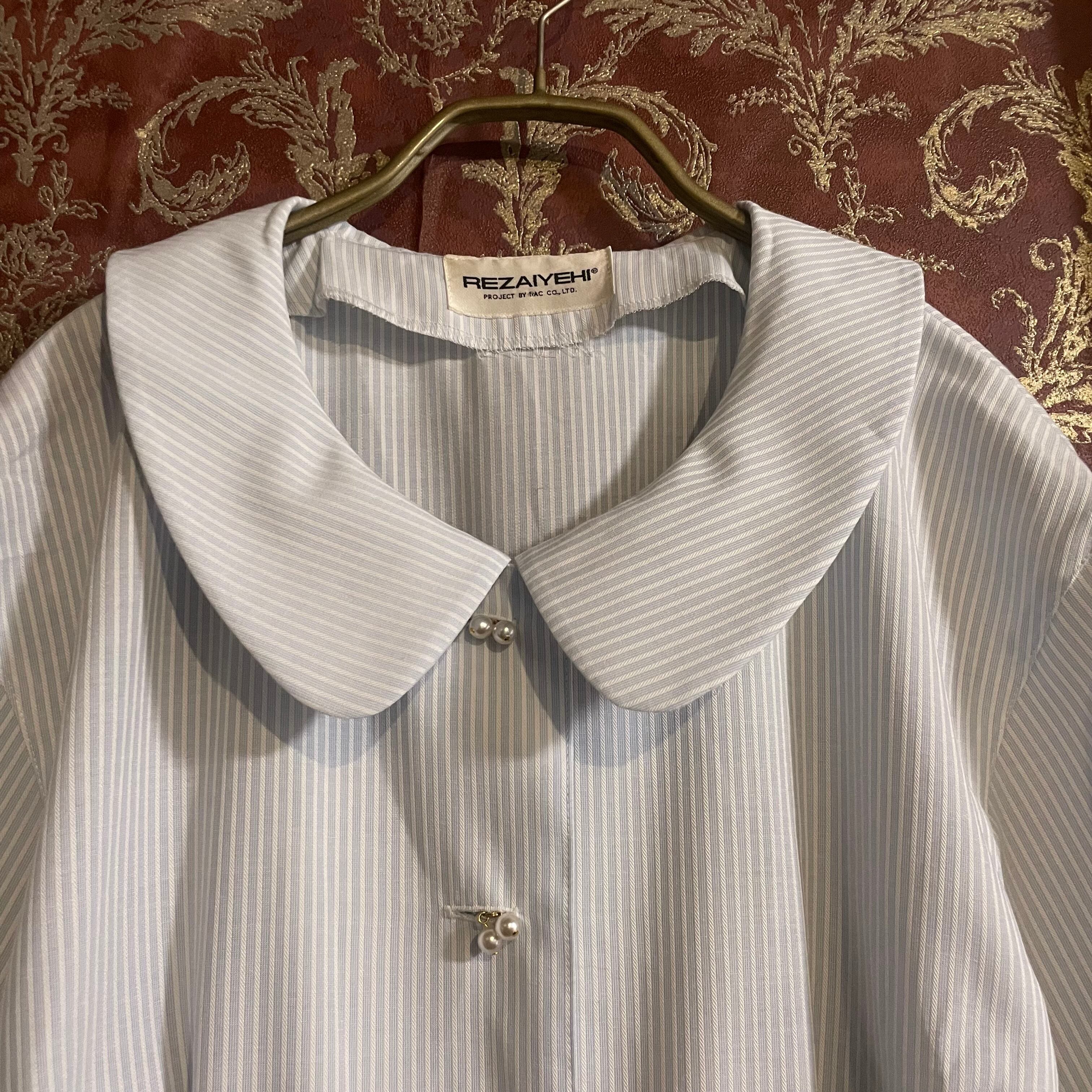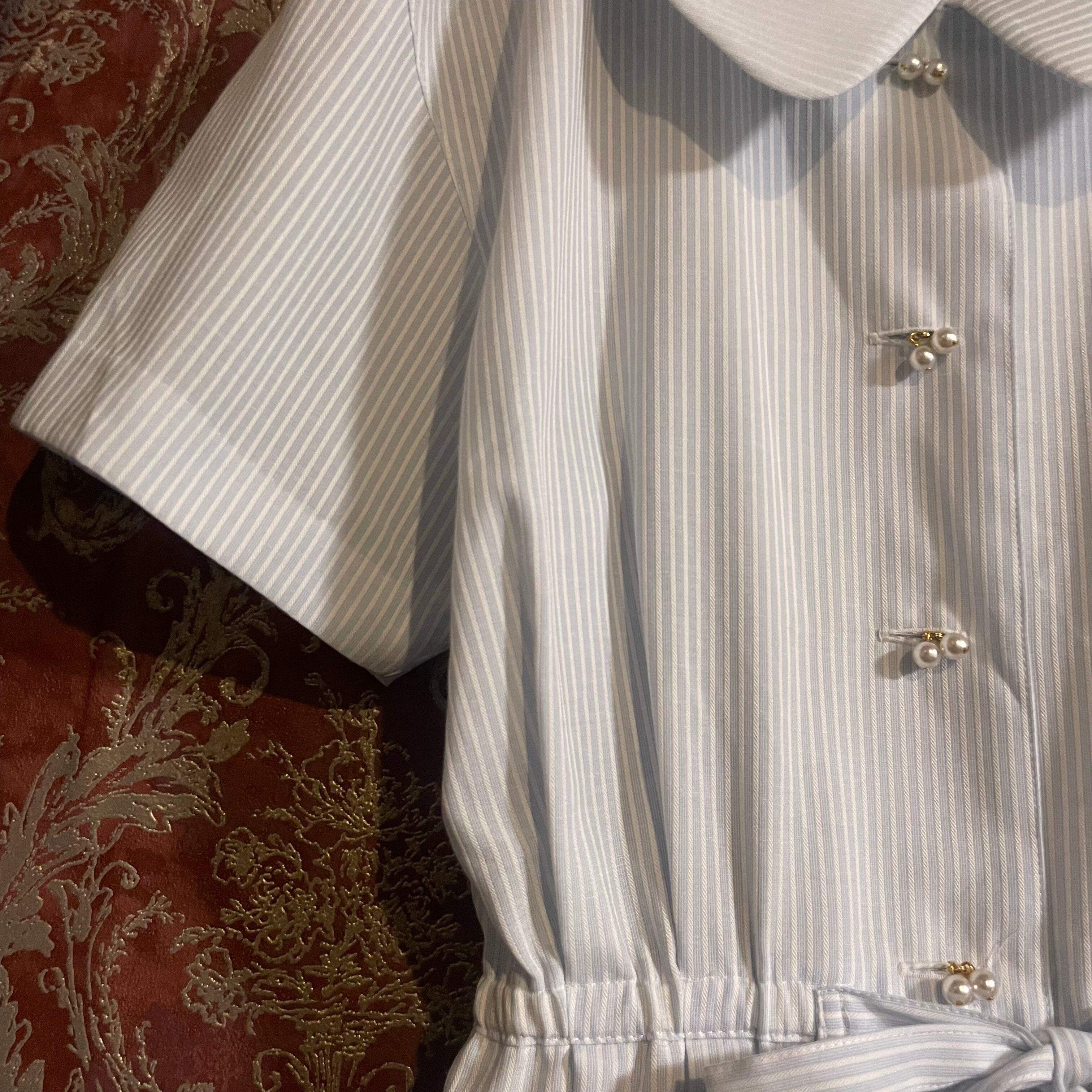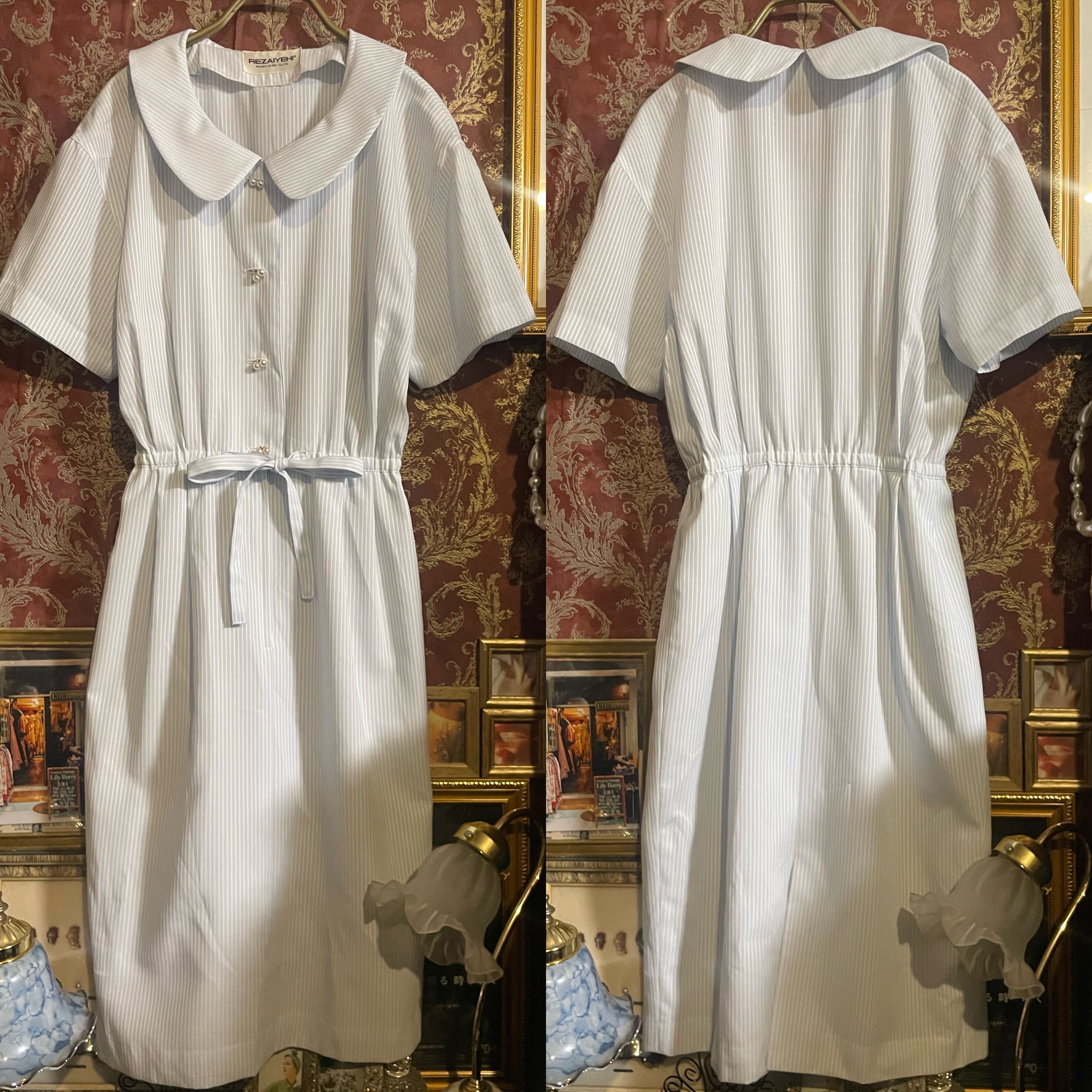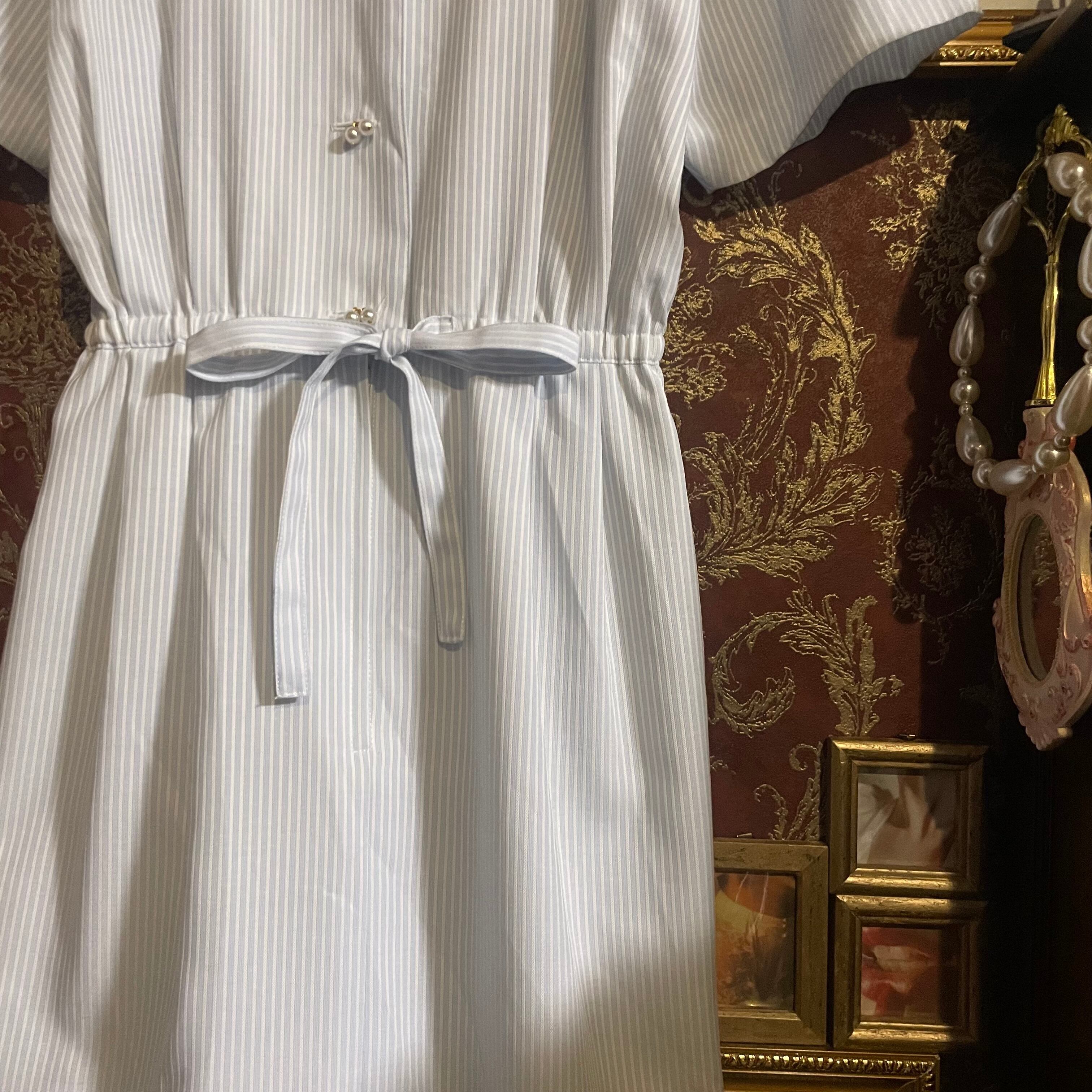 淡い水色と白のストライプが爽やかな印象を与えるワンピースです。