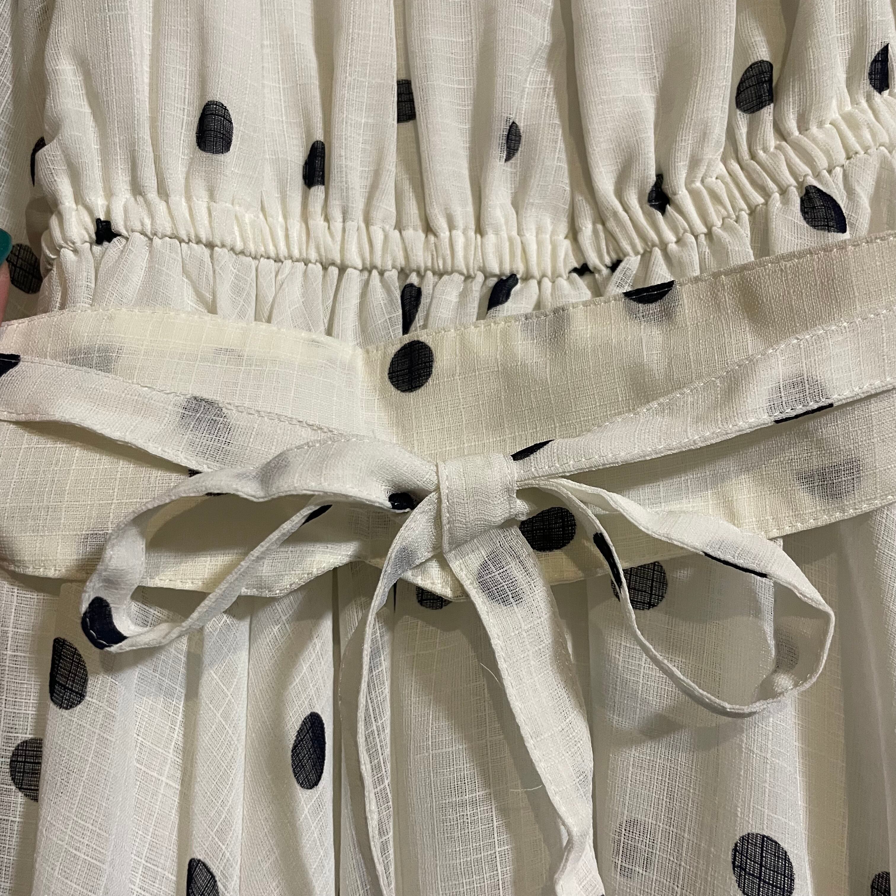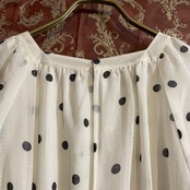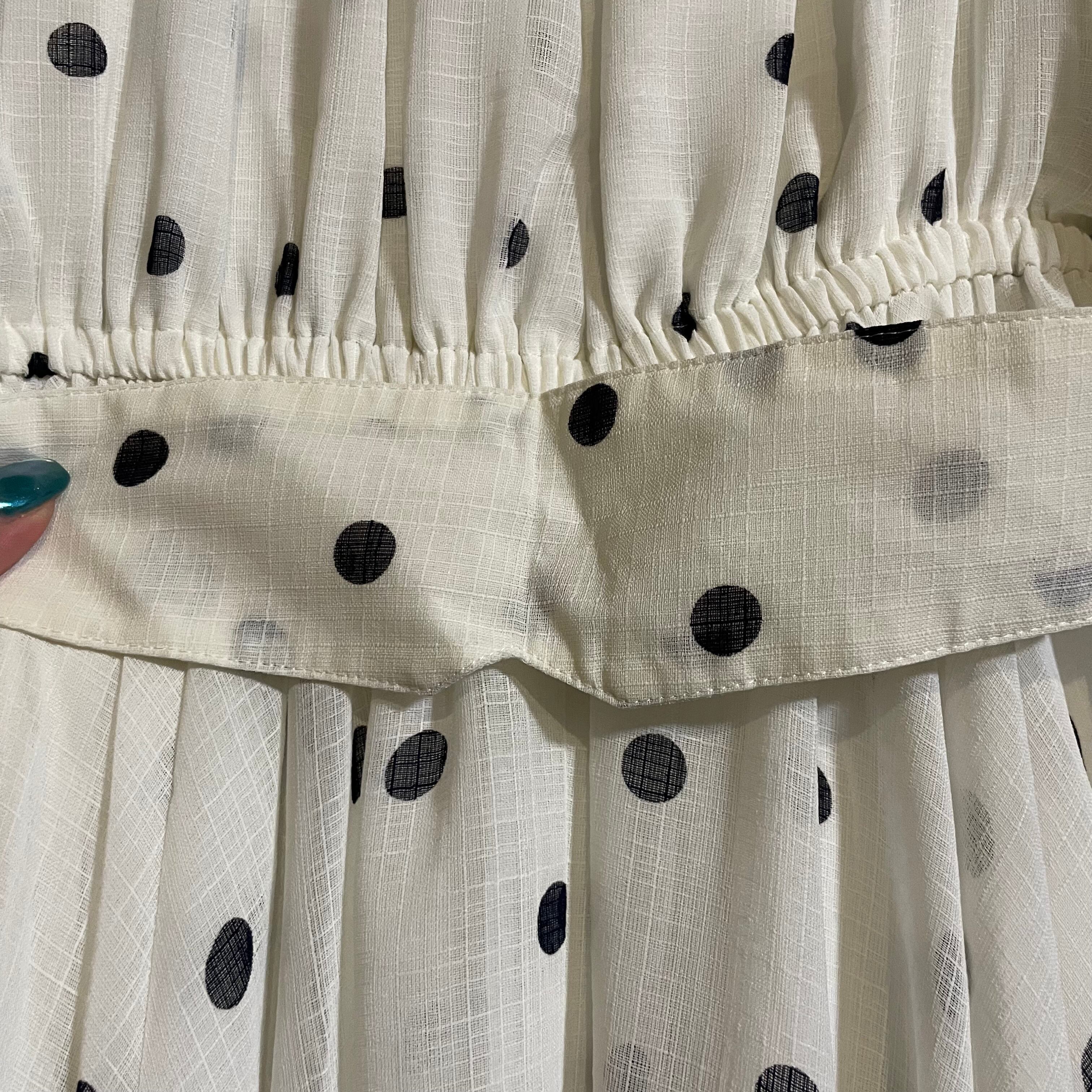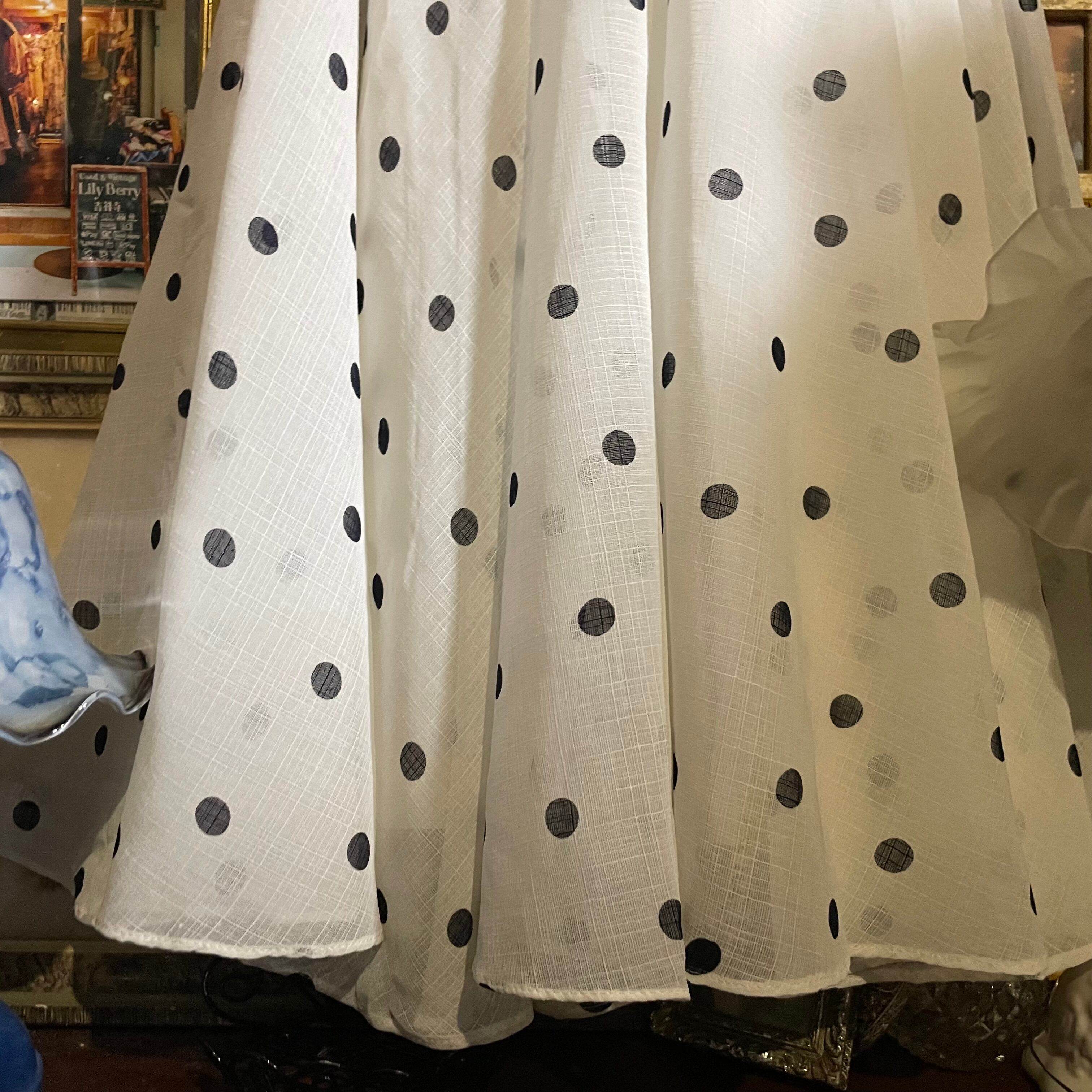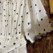 クラシカルなオフホワイト地に、上品な黒のドット柄が映えるロングワンピースです。