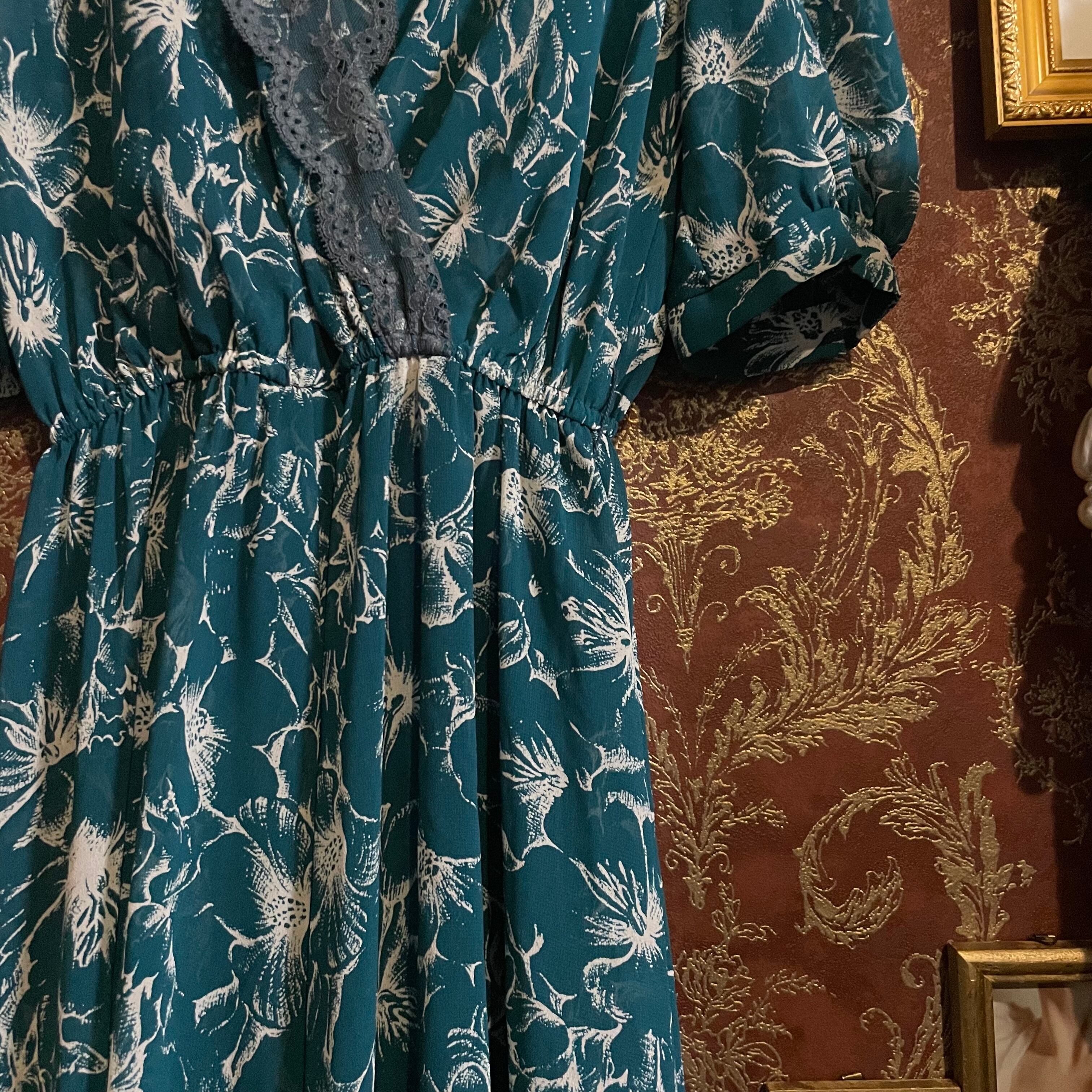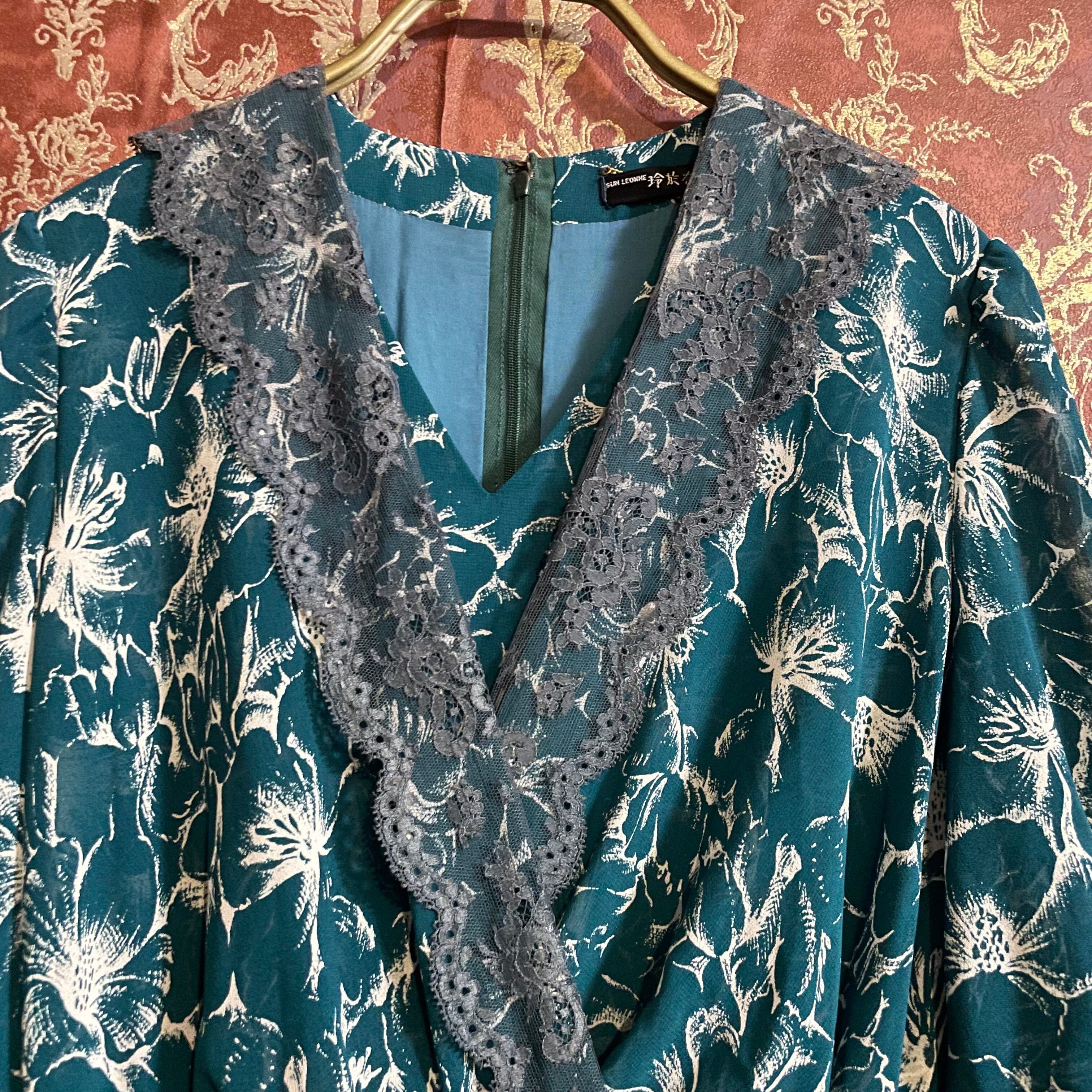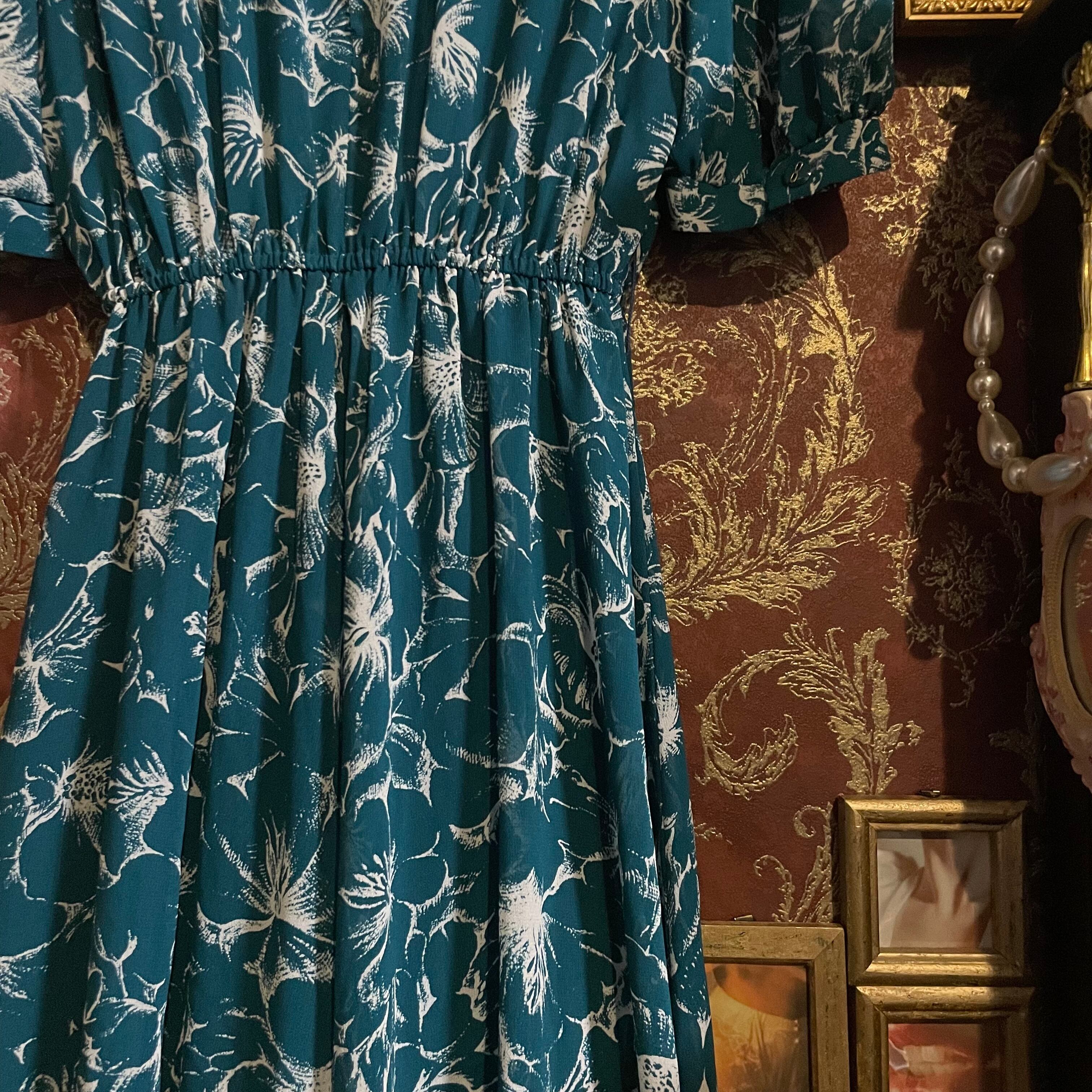 深みのあるピーコックグリーンに、繊細な白の植物モチーフが描かれた美しい総柄デザインです。