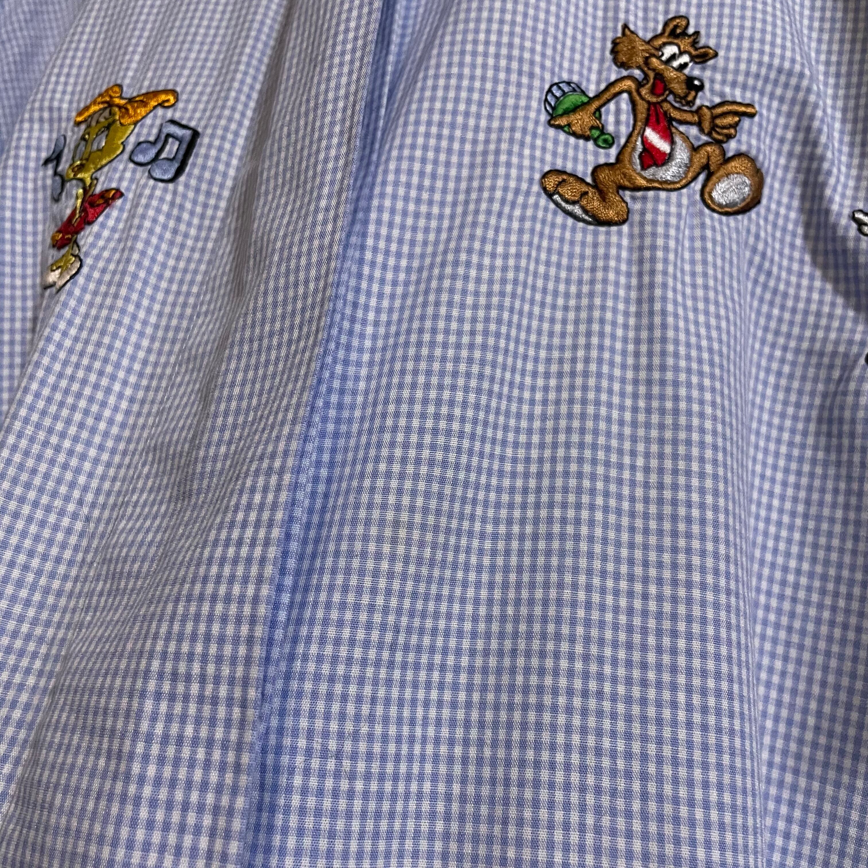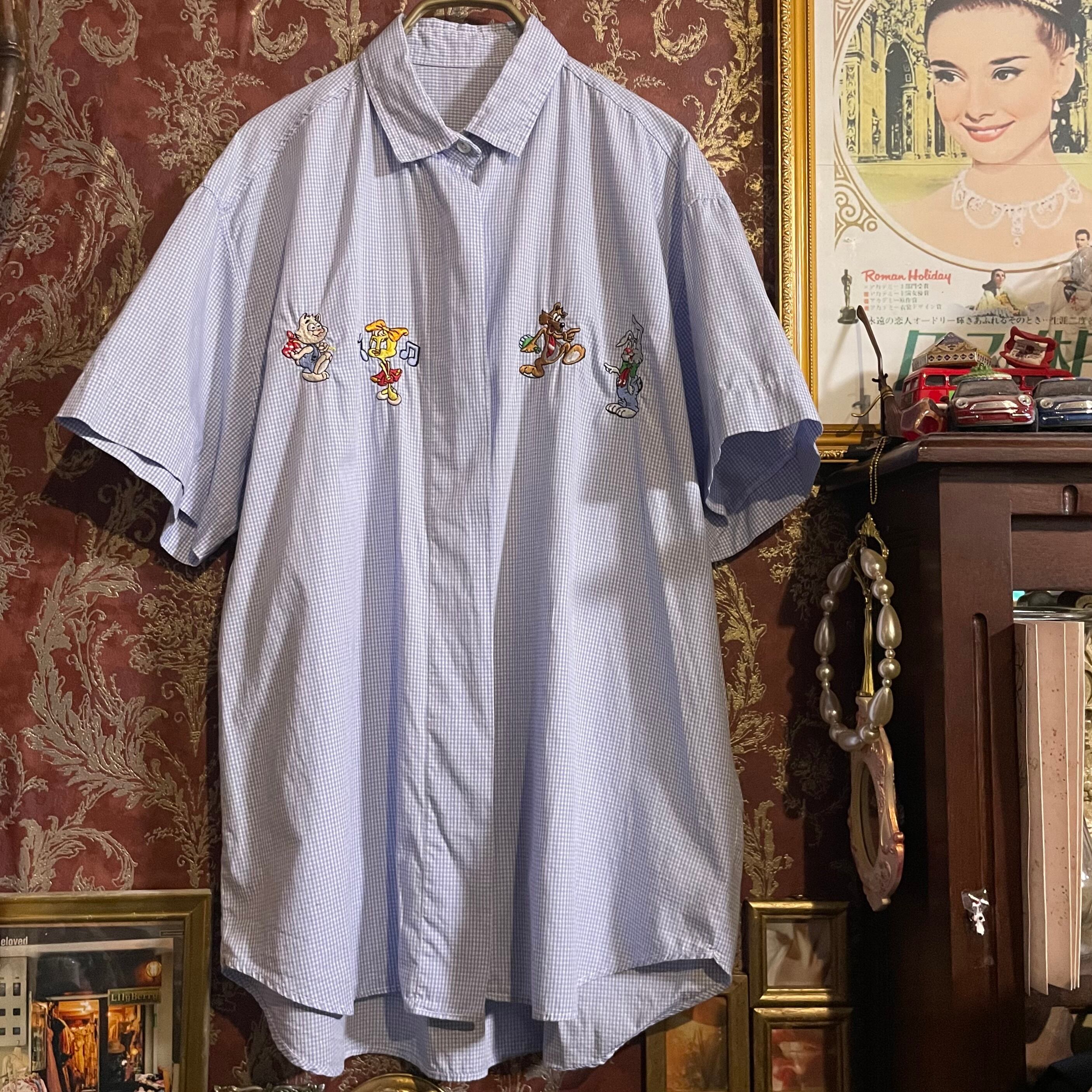 胸元に可愛らしいキャラクターたちが4体並んだ、遊び心たっぷりのギンガムチェックシャツです。