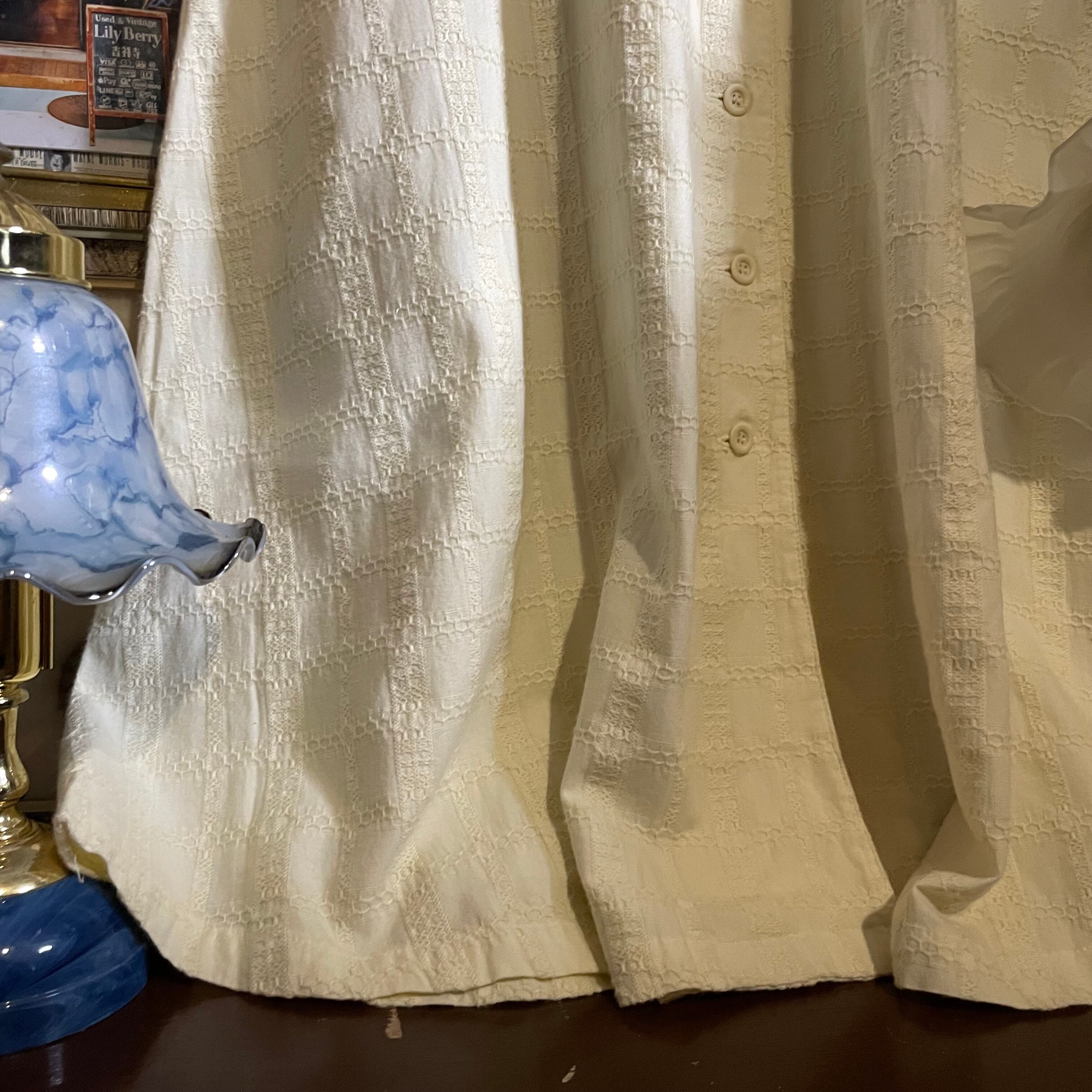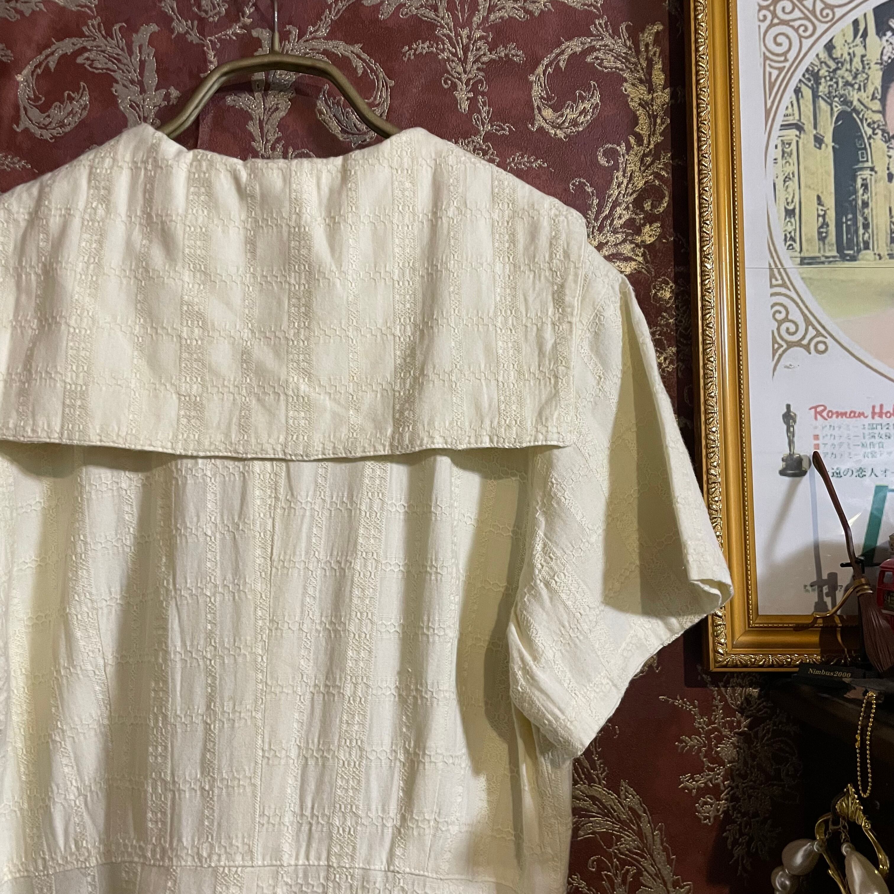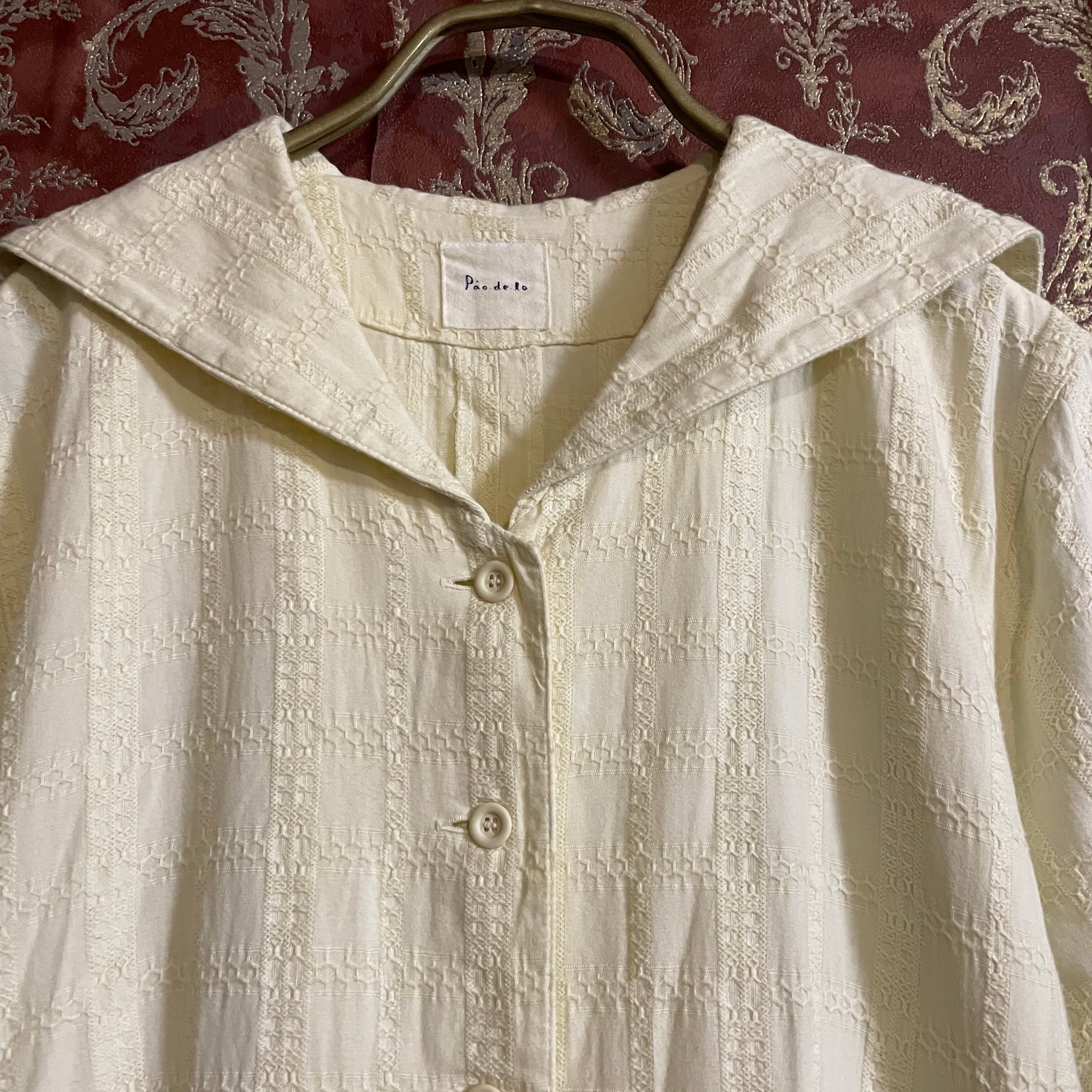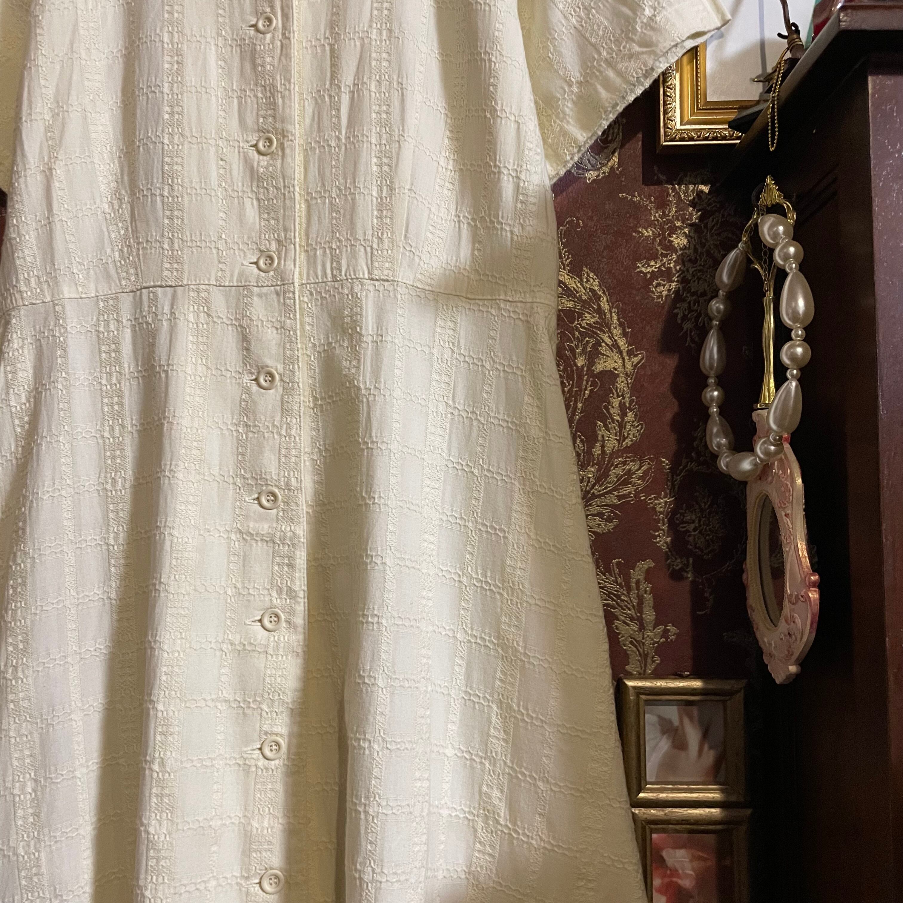優しいクリーム色に、さりげない格子柄のジャガード織りが施された、上品で可憐なセーラーカラーワンピースです。