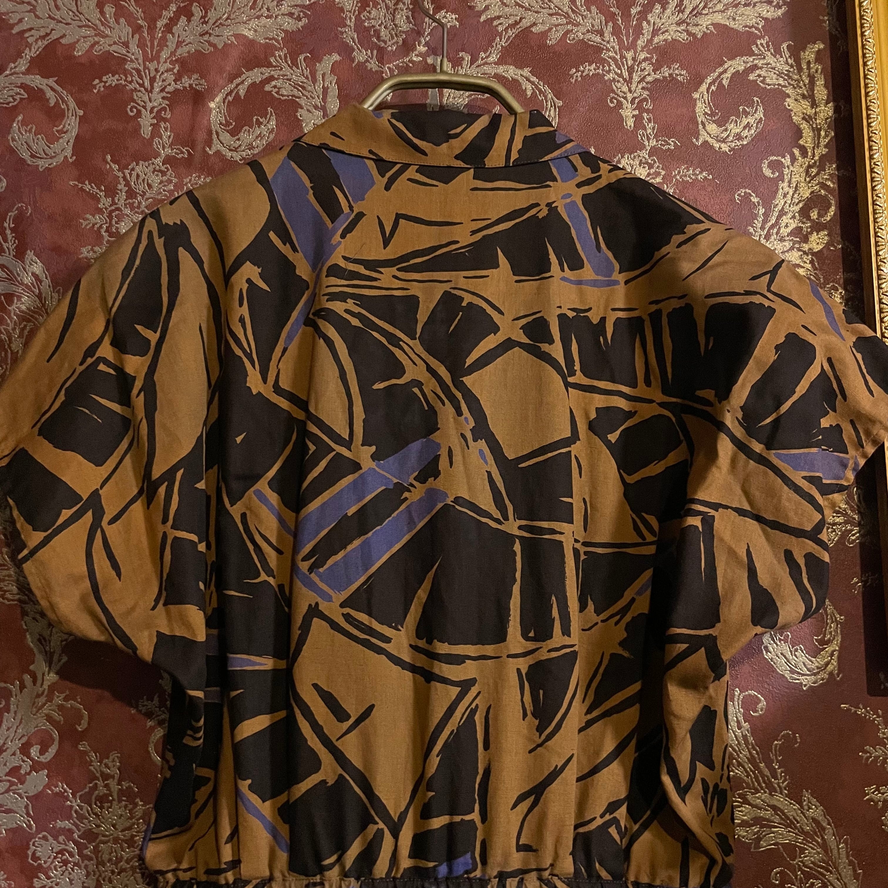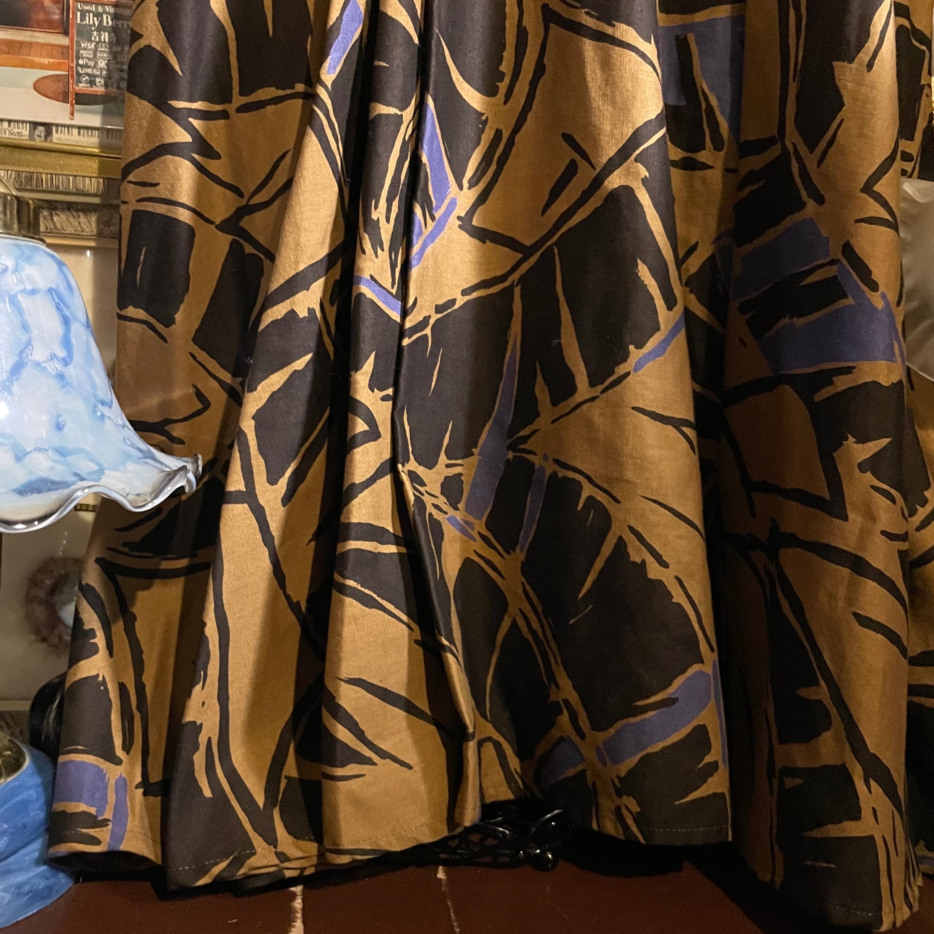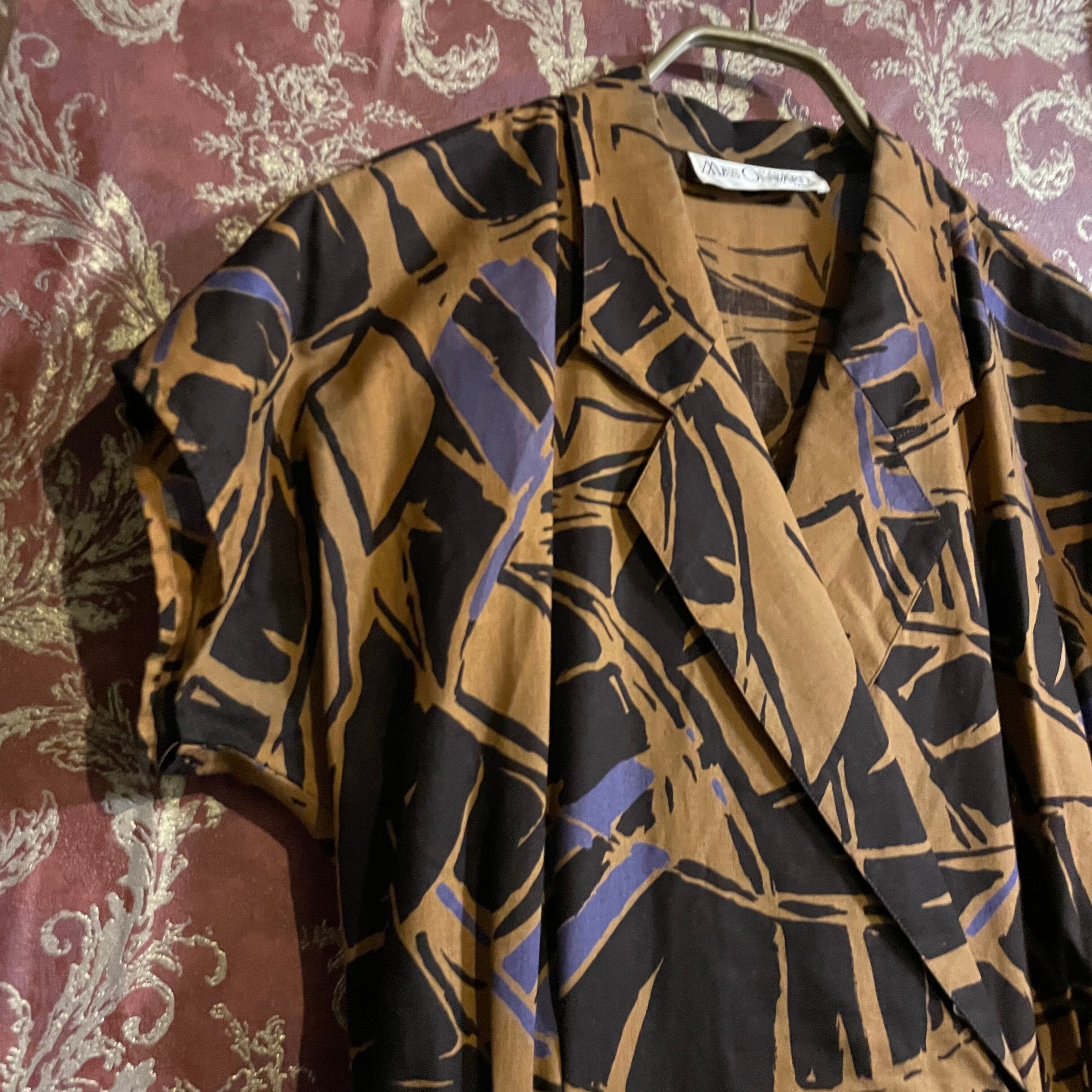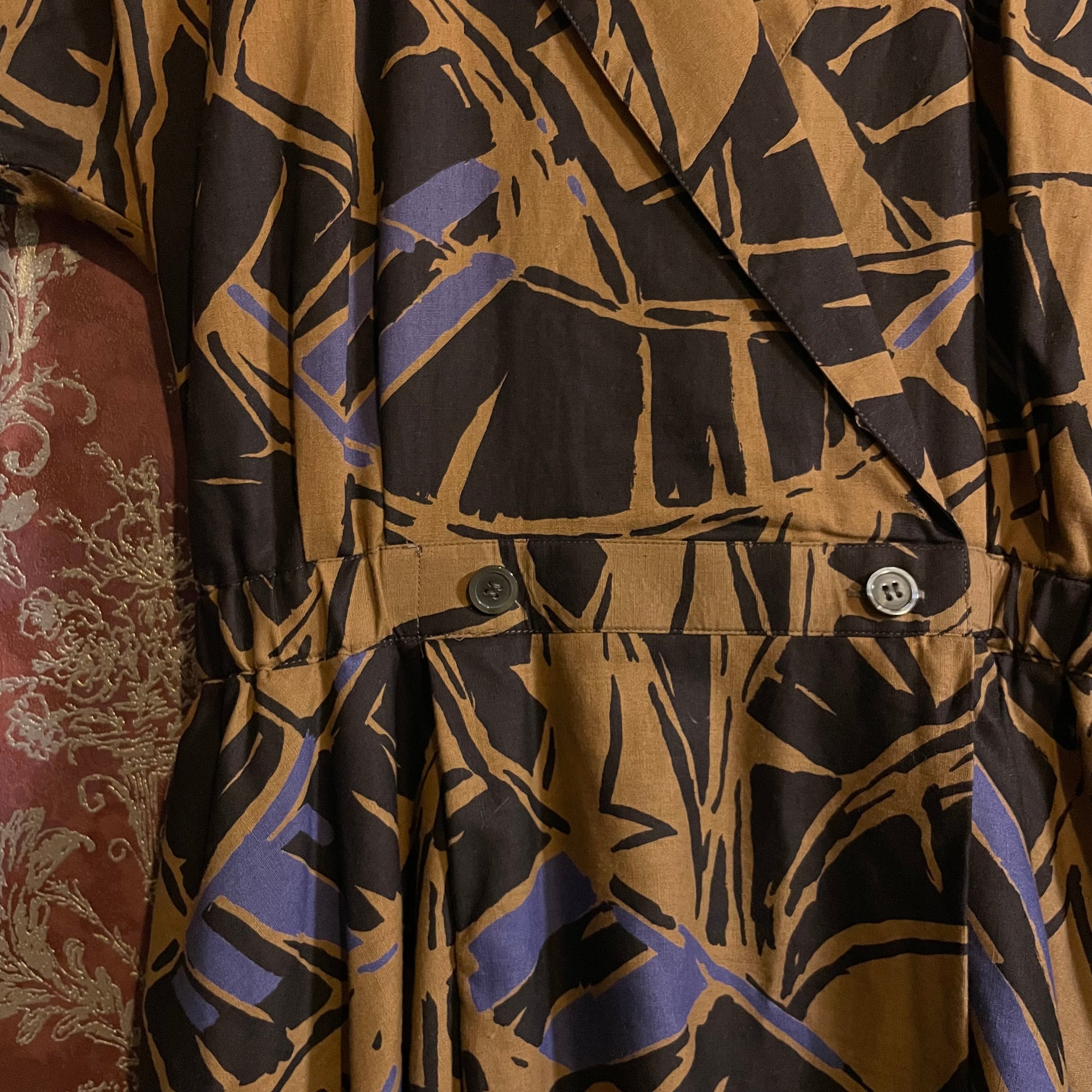 ブラウンを基調に、深みのあるパープルがアクセントとして映える、抽象的な柄が個性的なヴィンテージドレスです。