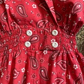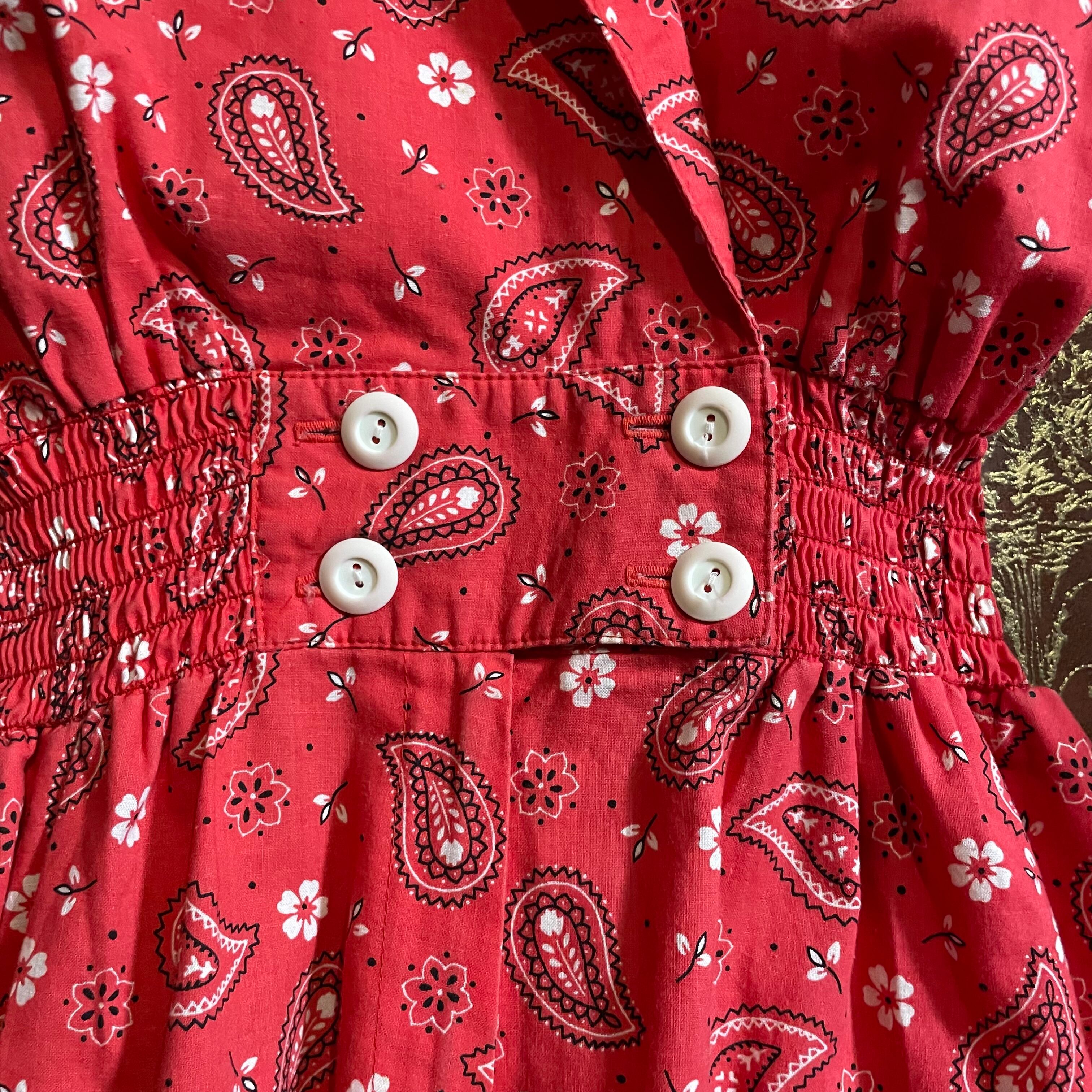 バンダナをそのまま仕立てたような、遊び心たっぷりのデザインが魅力のペイズリー柄ロンパースです。