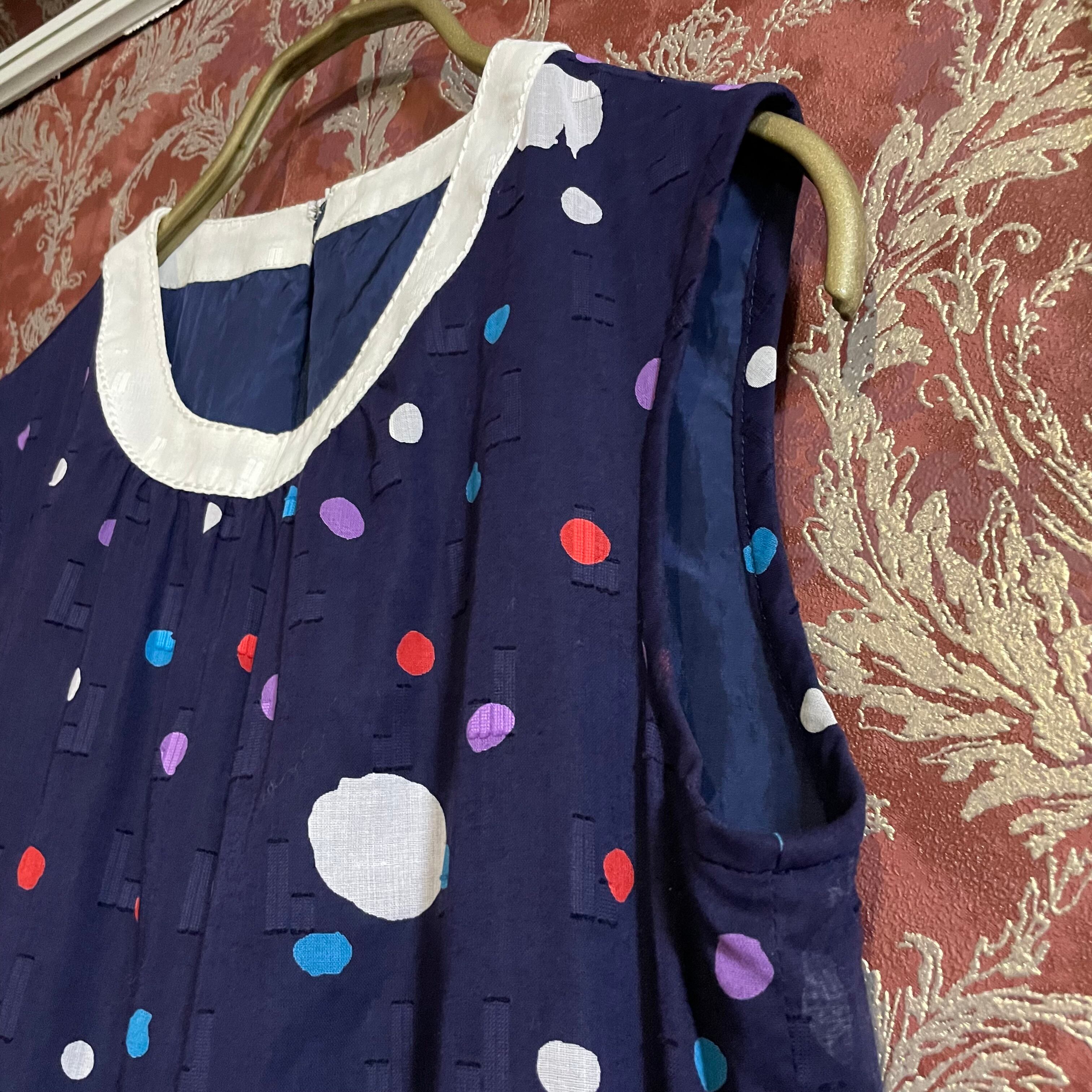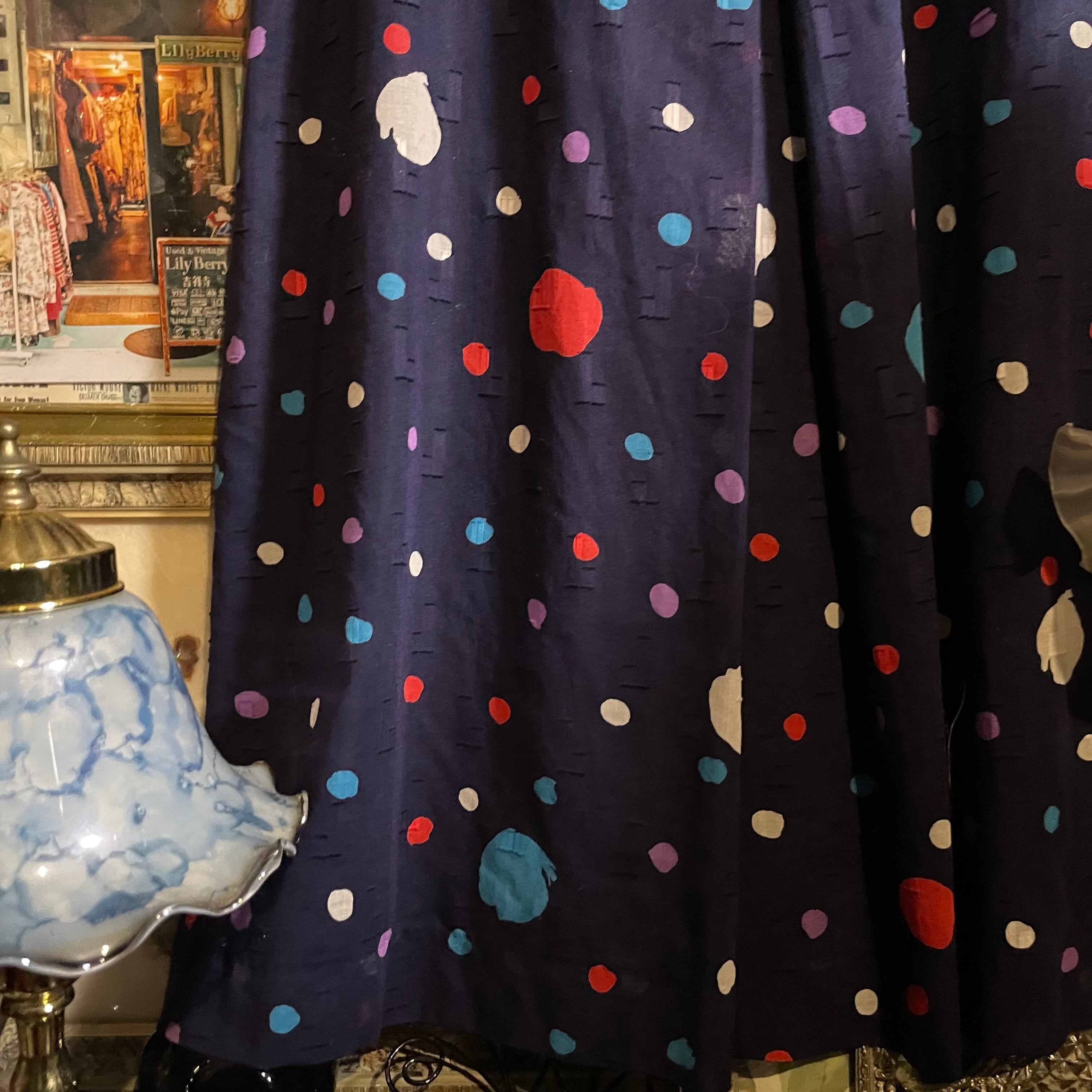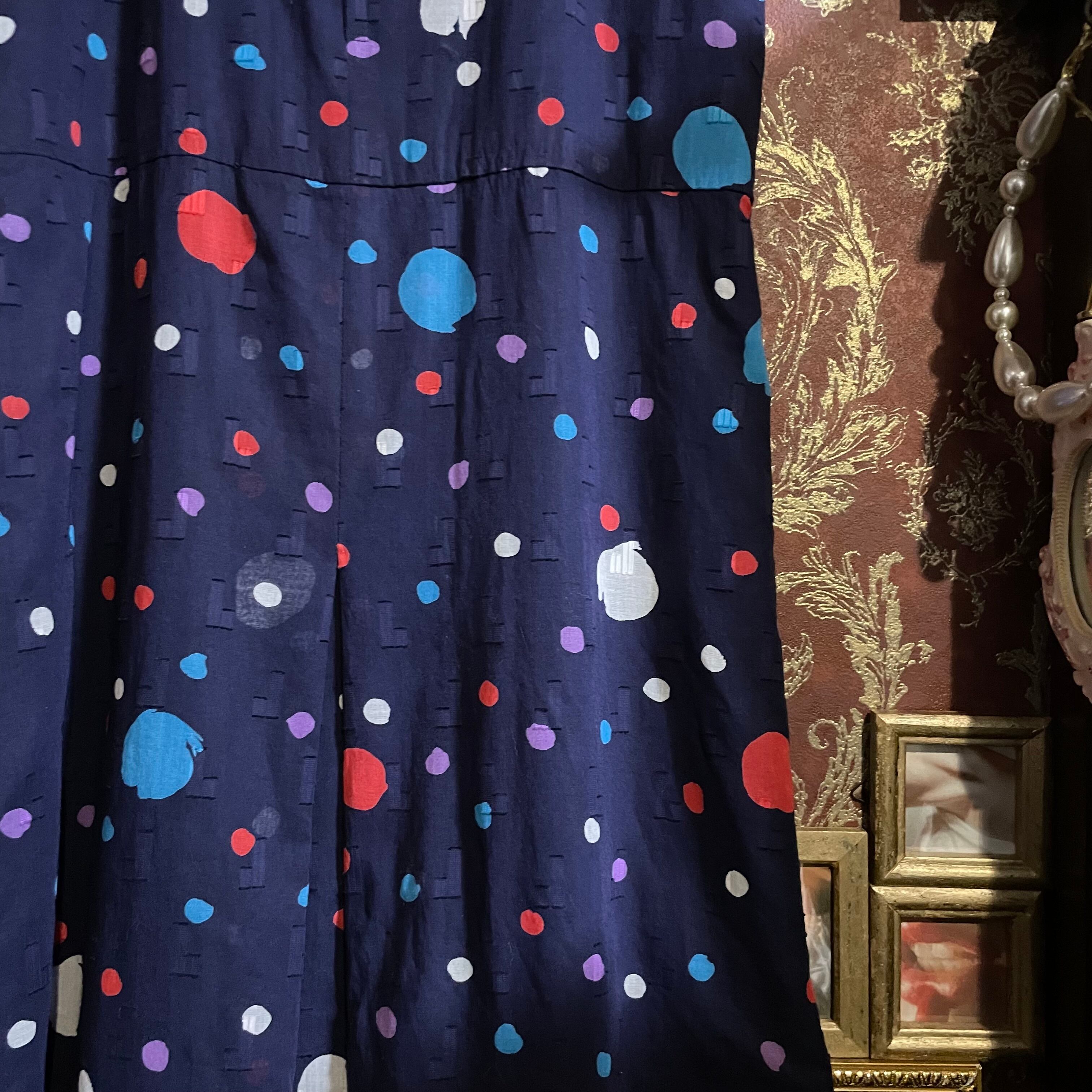 深みのあるネイビーベースに、赤・白・水色・紫の大小さまざまなドットが散りばめられたポップな柄が印象的です。