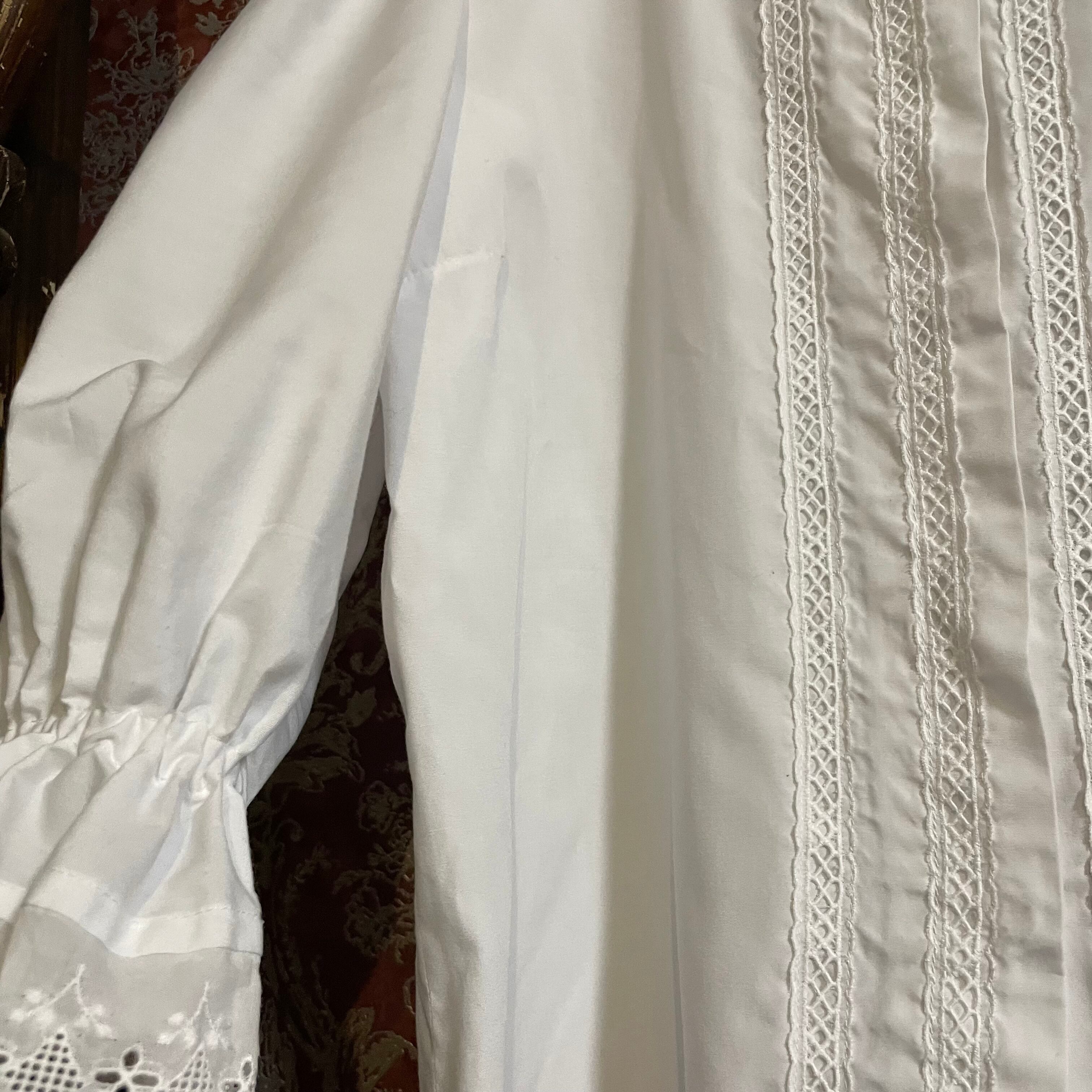 ふんわりとしたボリュームスリーブと、襟元・袖口にあしらわれた繊細なレースが目を引く、クラシカルなブラウスです。
