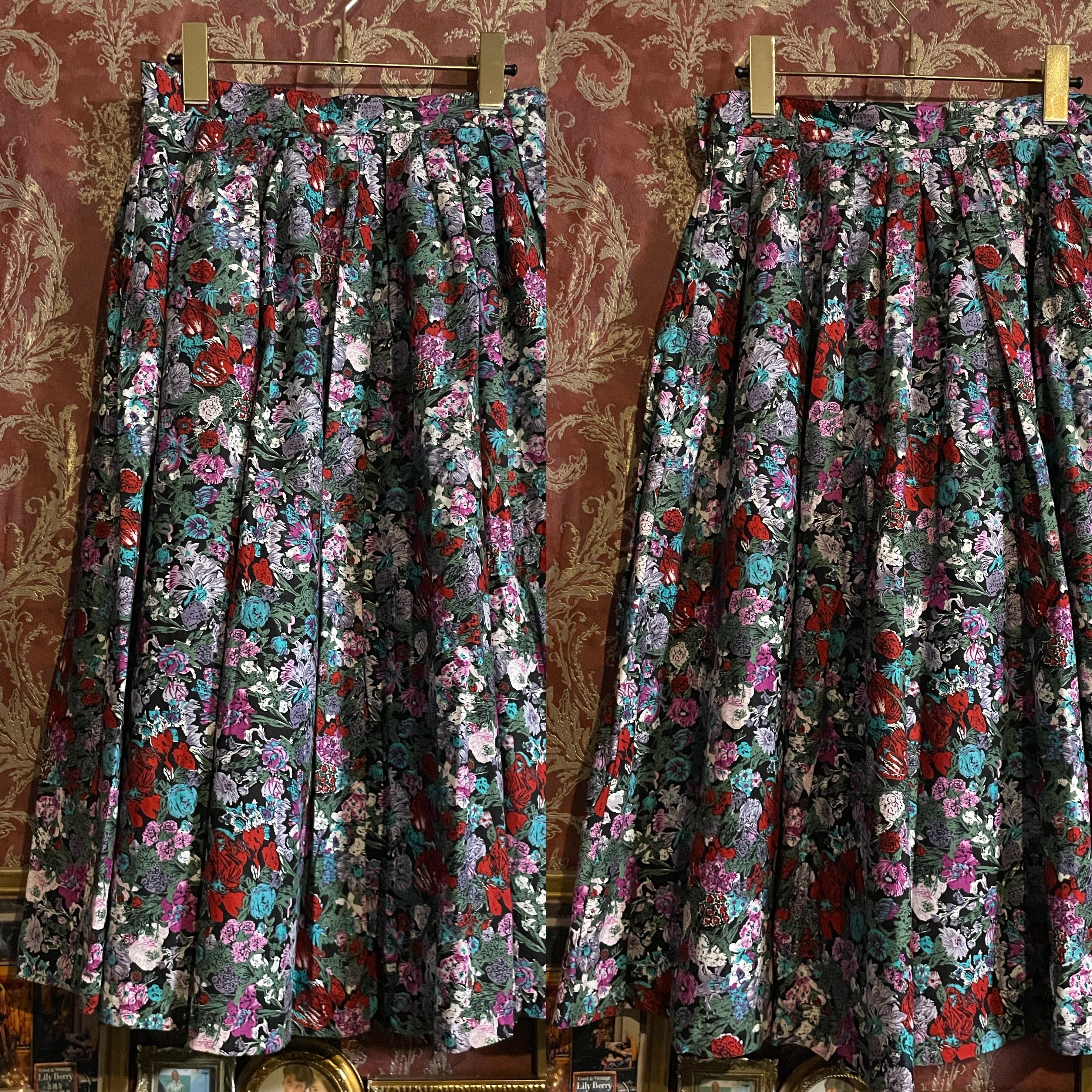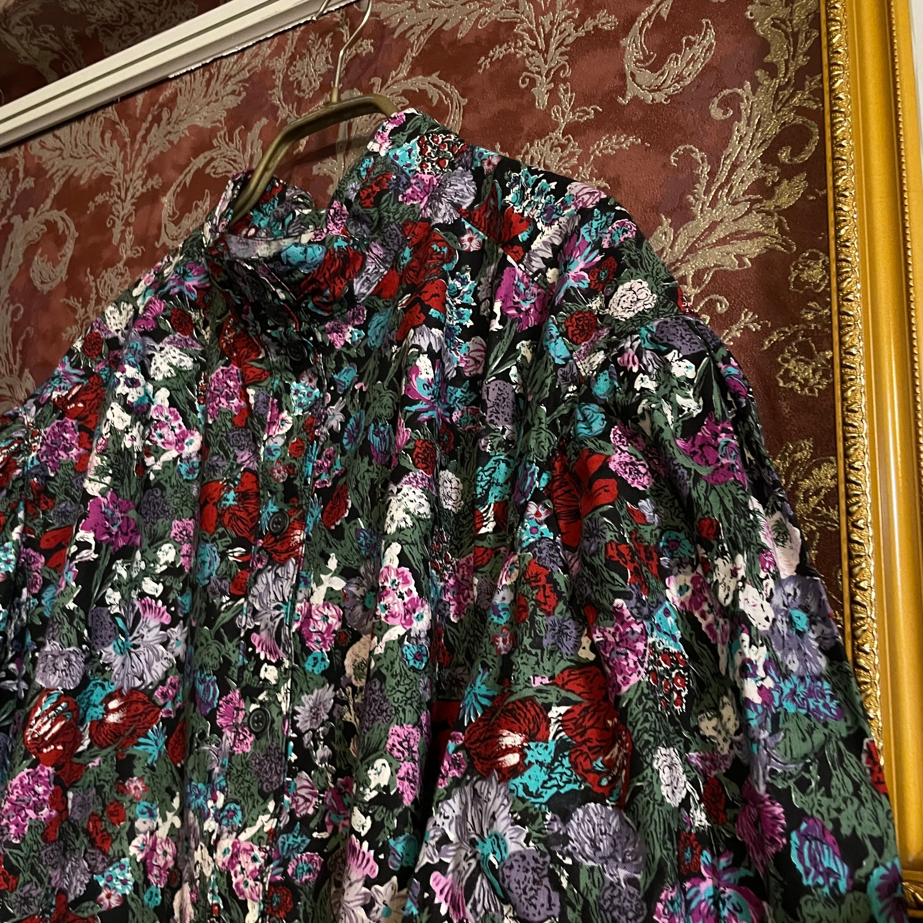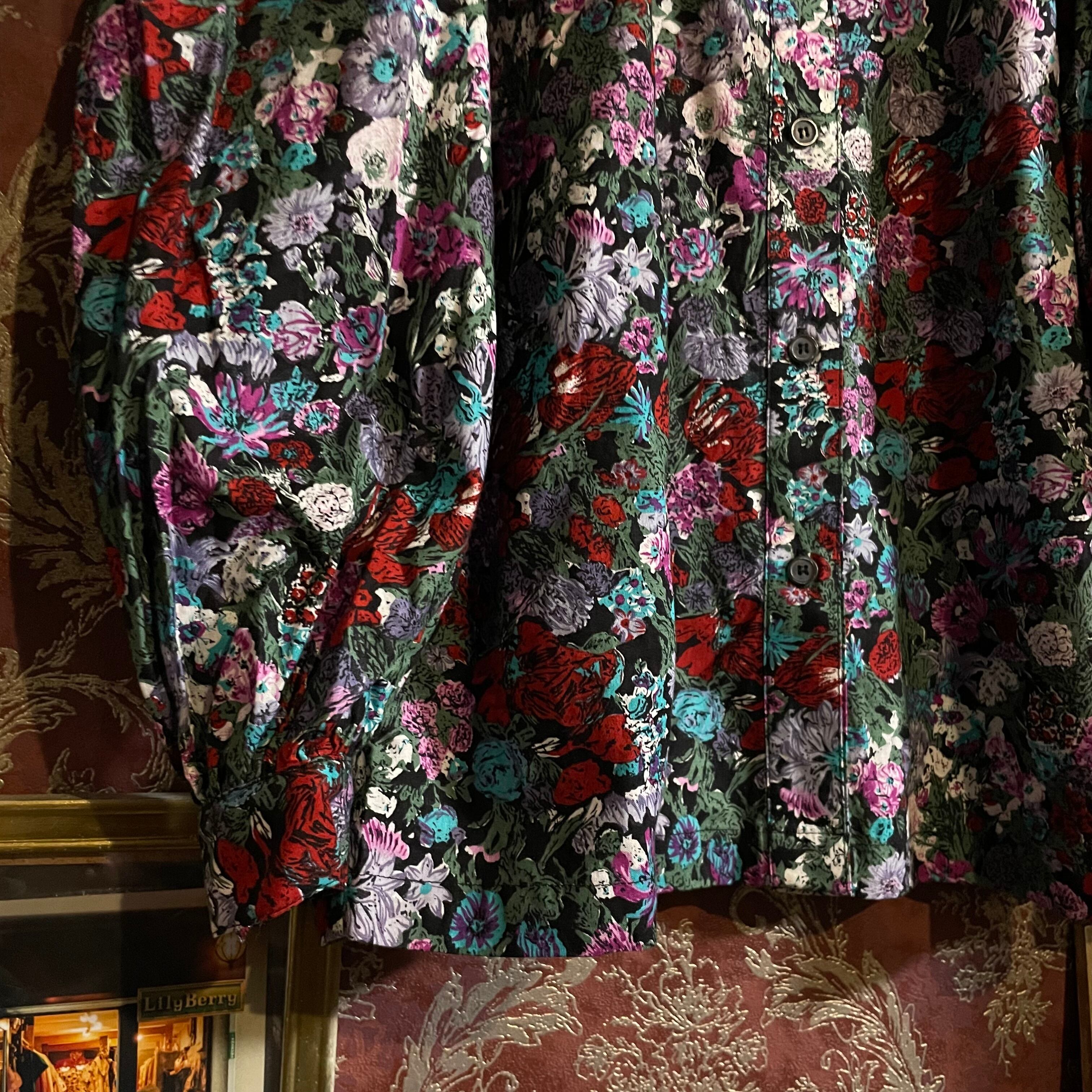 ブラックベースに、赤やパープル、ターコイズなど多彩なフローラル柄が映えるデザインで、レトロな中にもモダンな印象を与えてくれます。