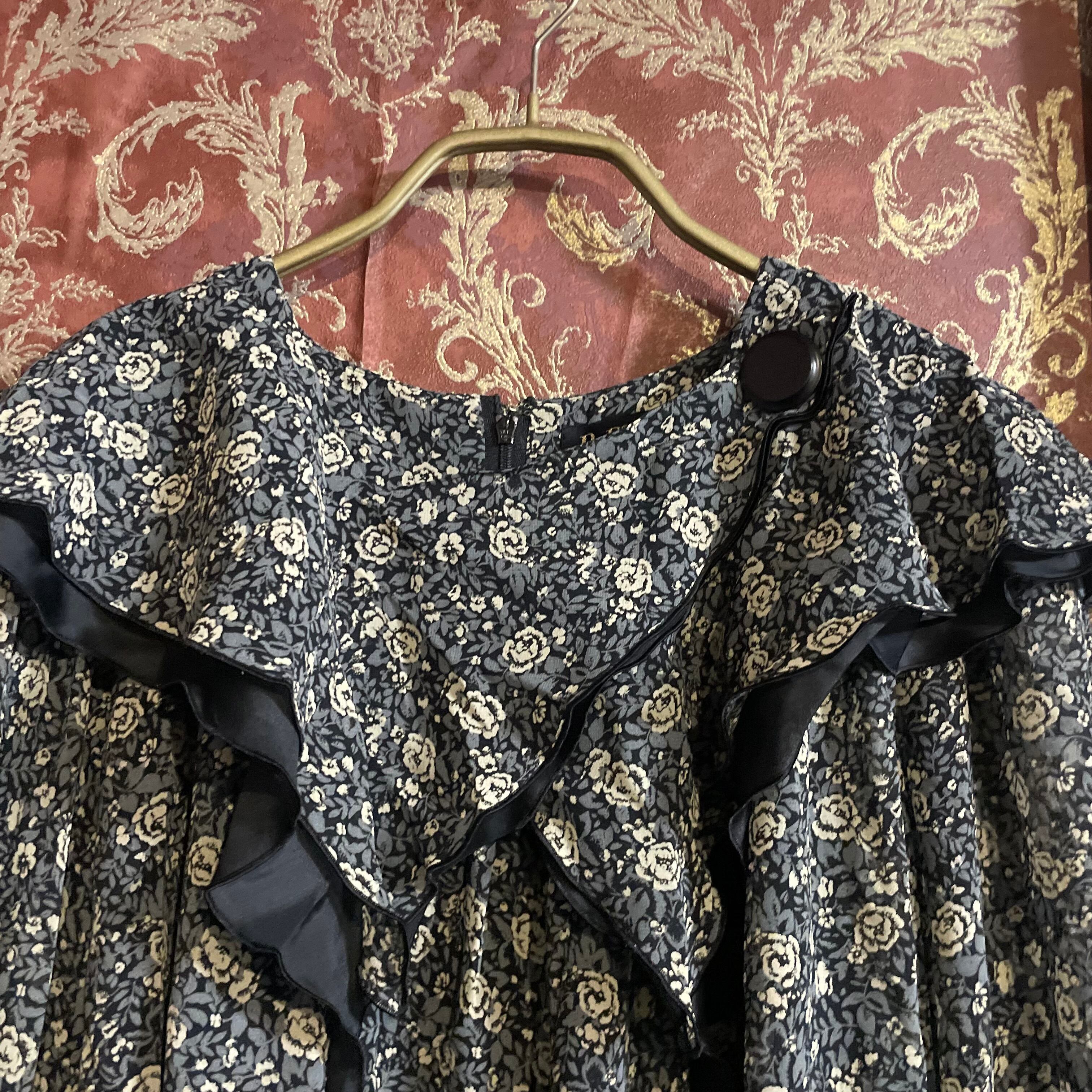 たっぷりとギャザーを寄せた身頃に、ボリュームのあるダブルのフリルカラーが重なり、華やかさと可憐さを兼ね備えた一枚です。