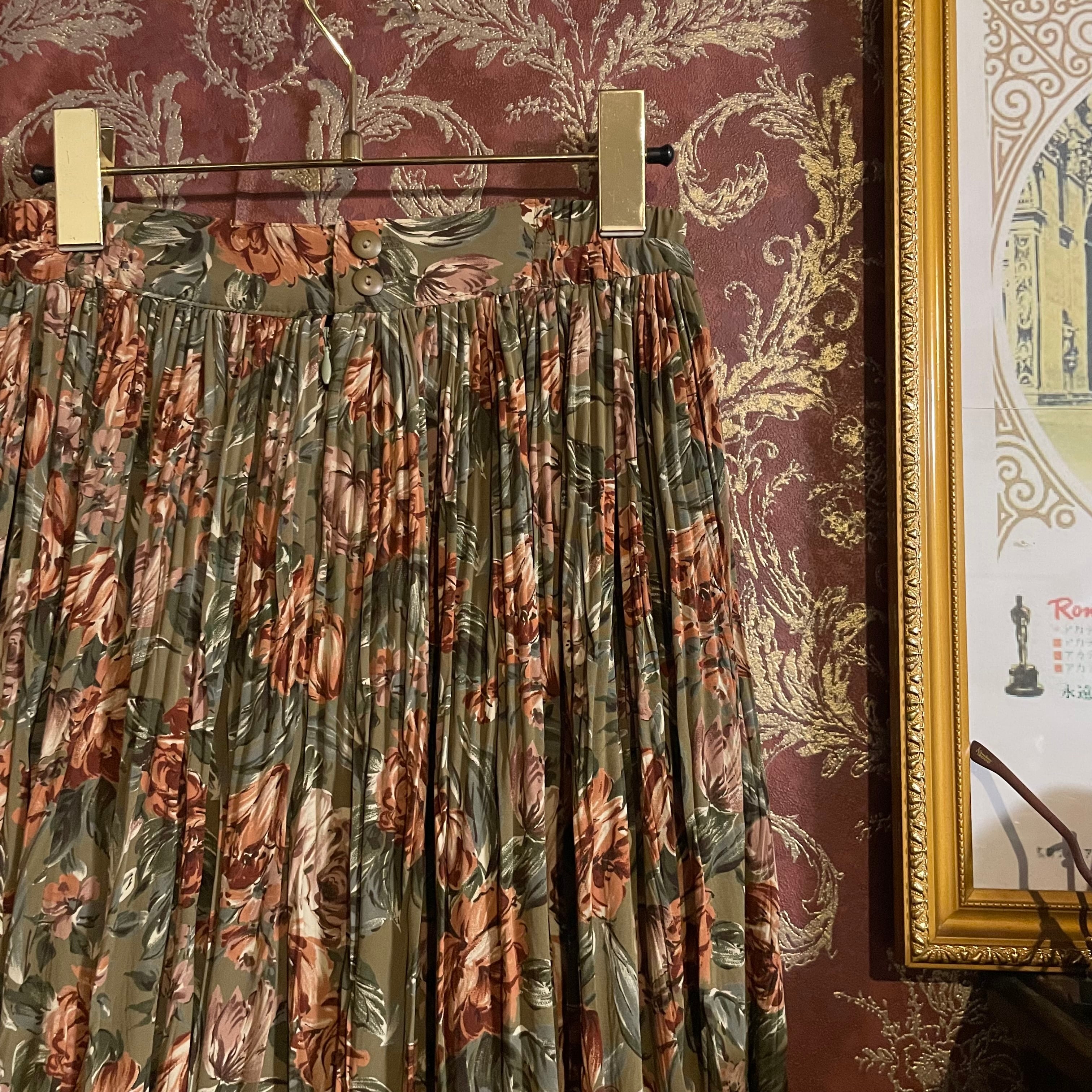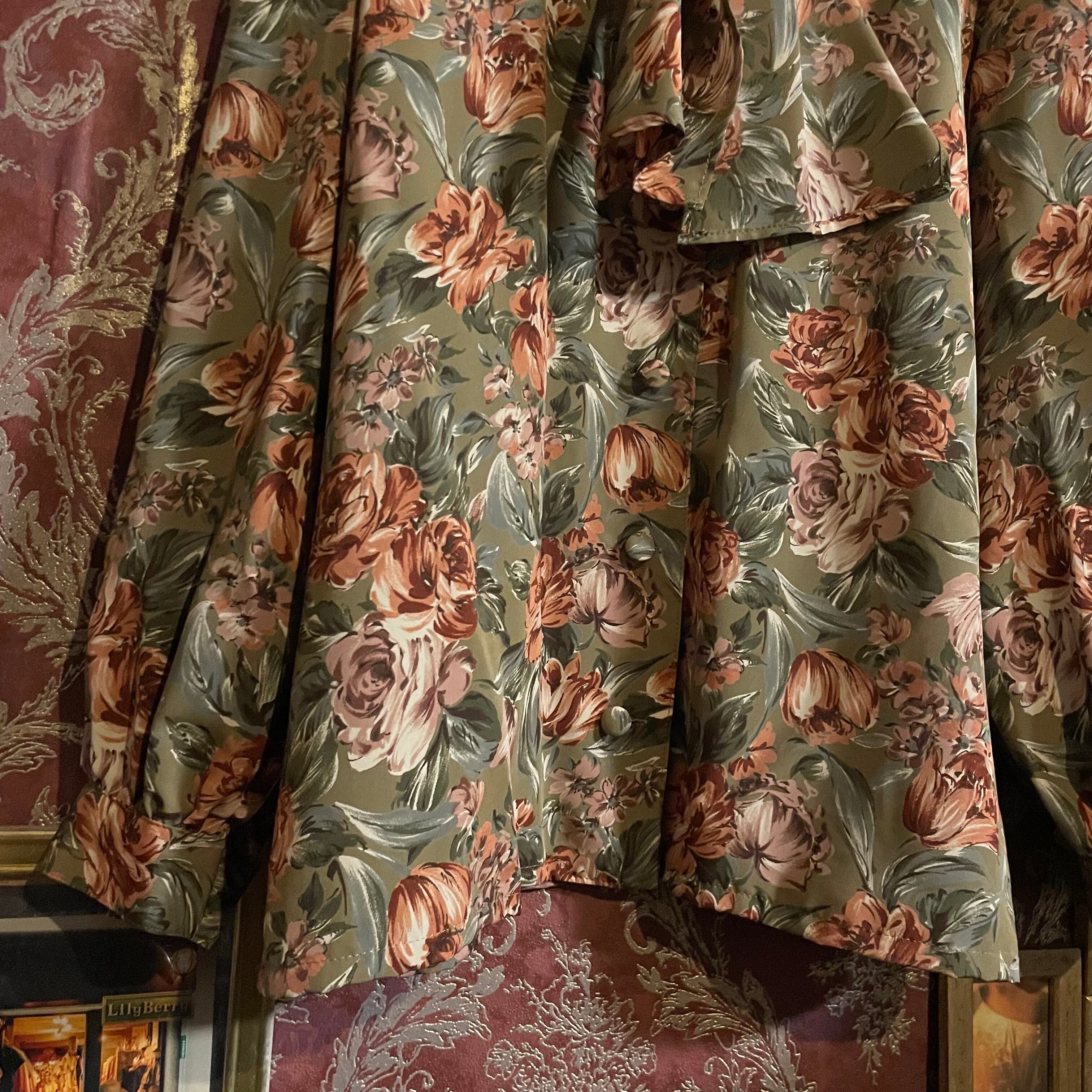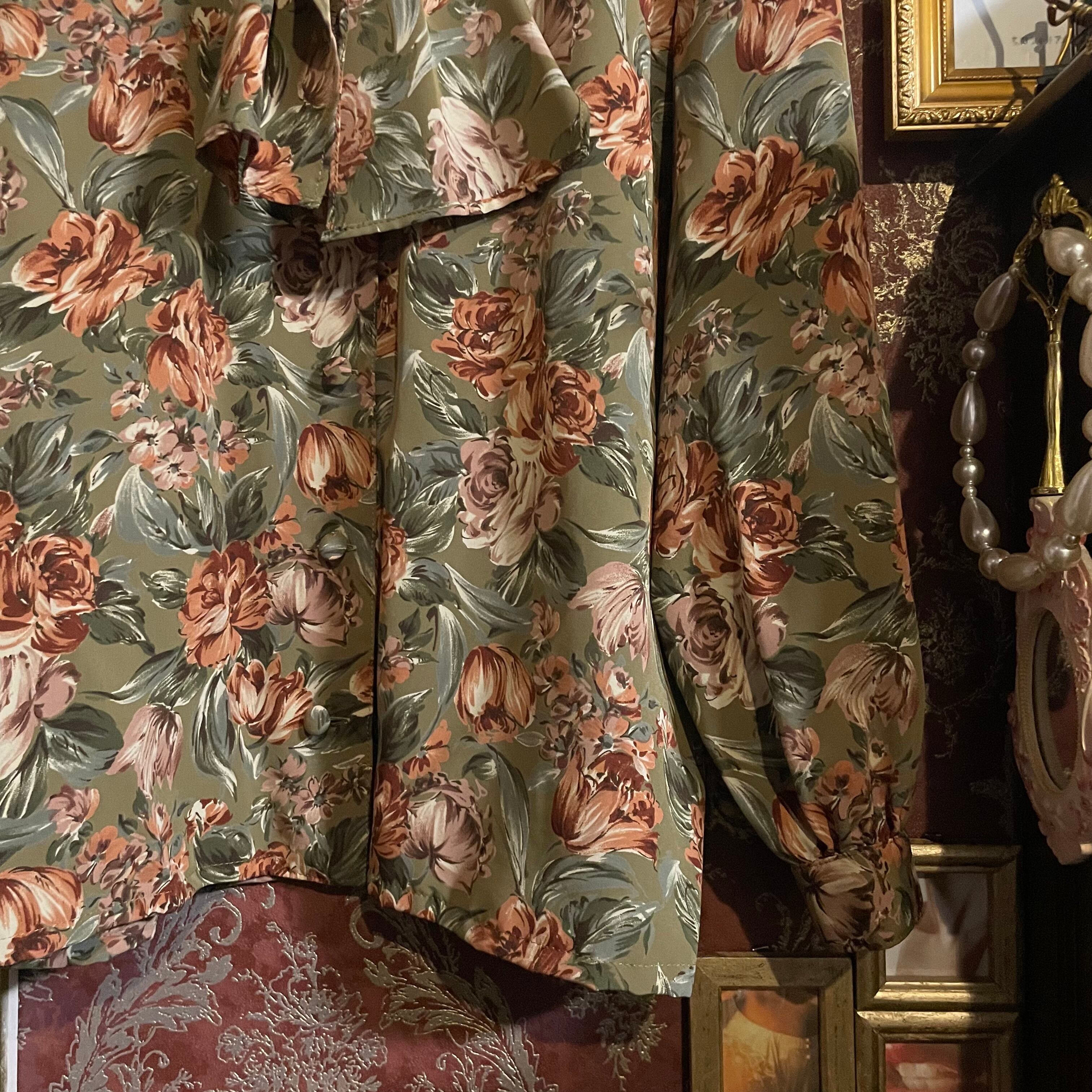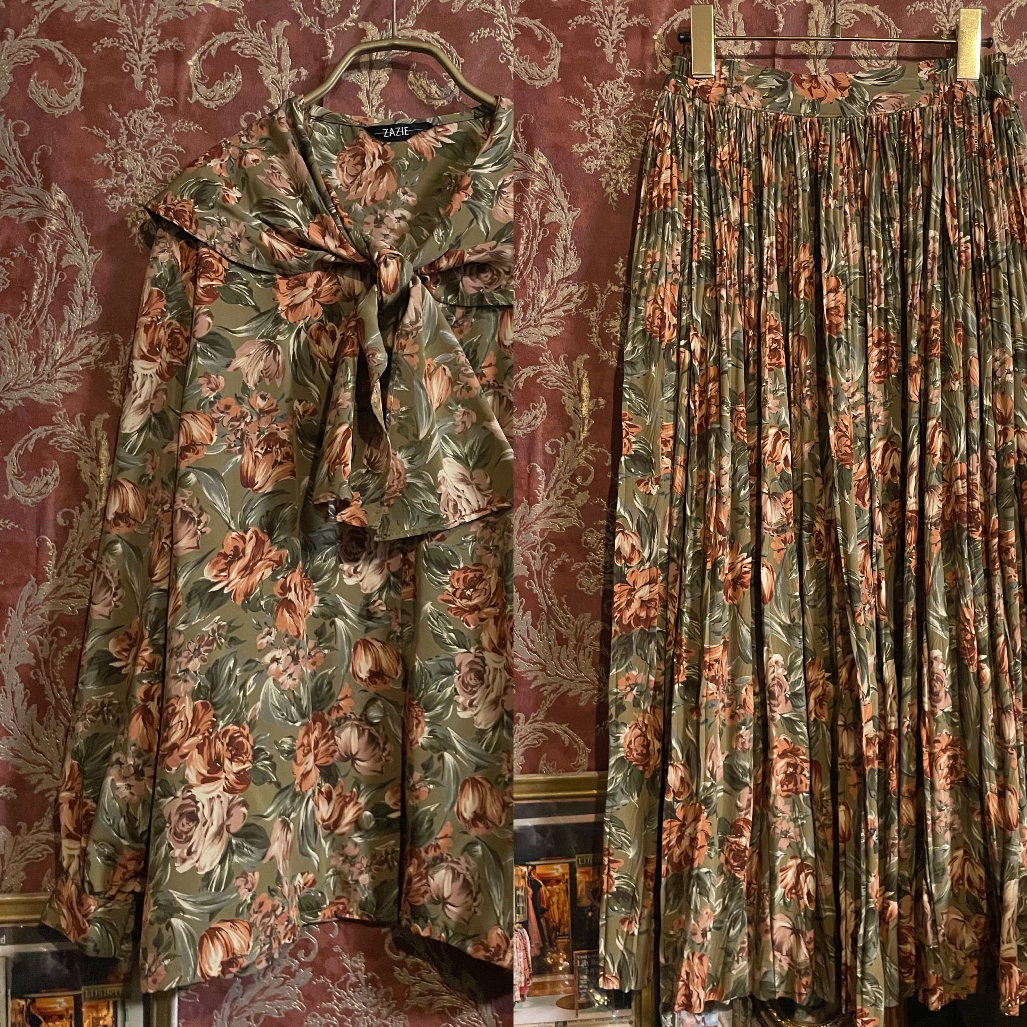 カーキベージュをベースに、くすみ感のあるオレンジブラウンの花々が咲く、温もりあふれるヴィンテージのセットアップです。