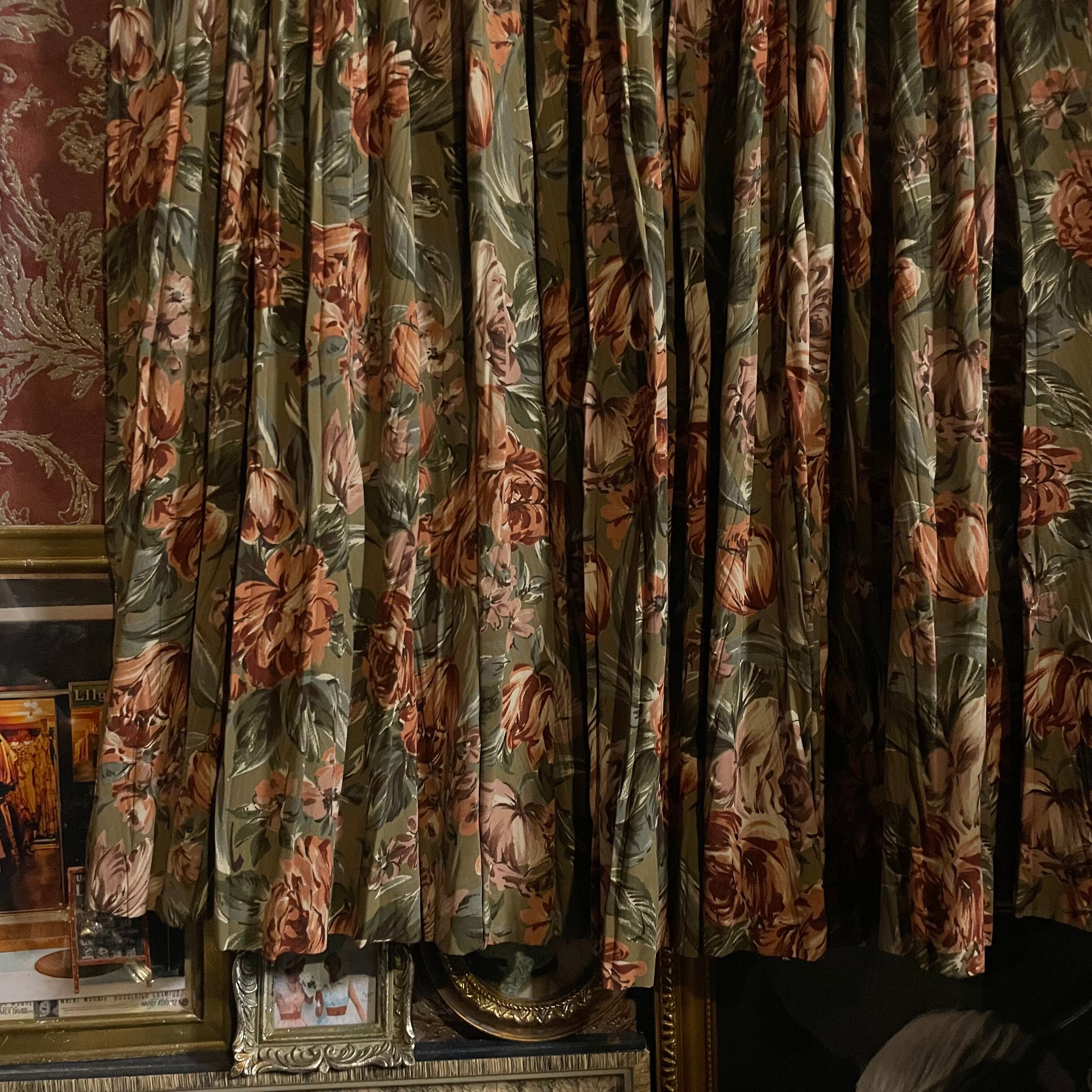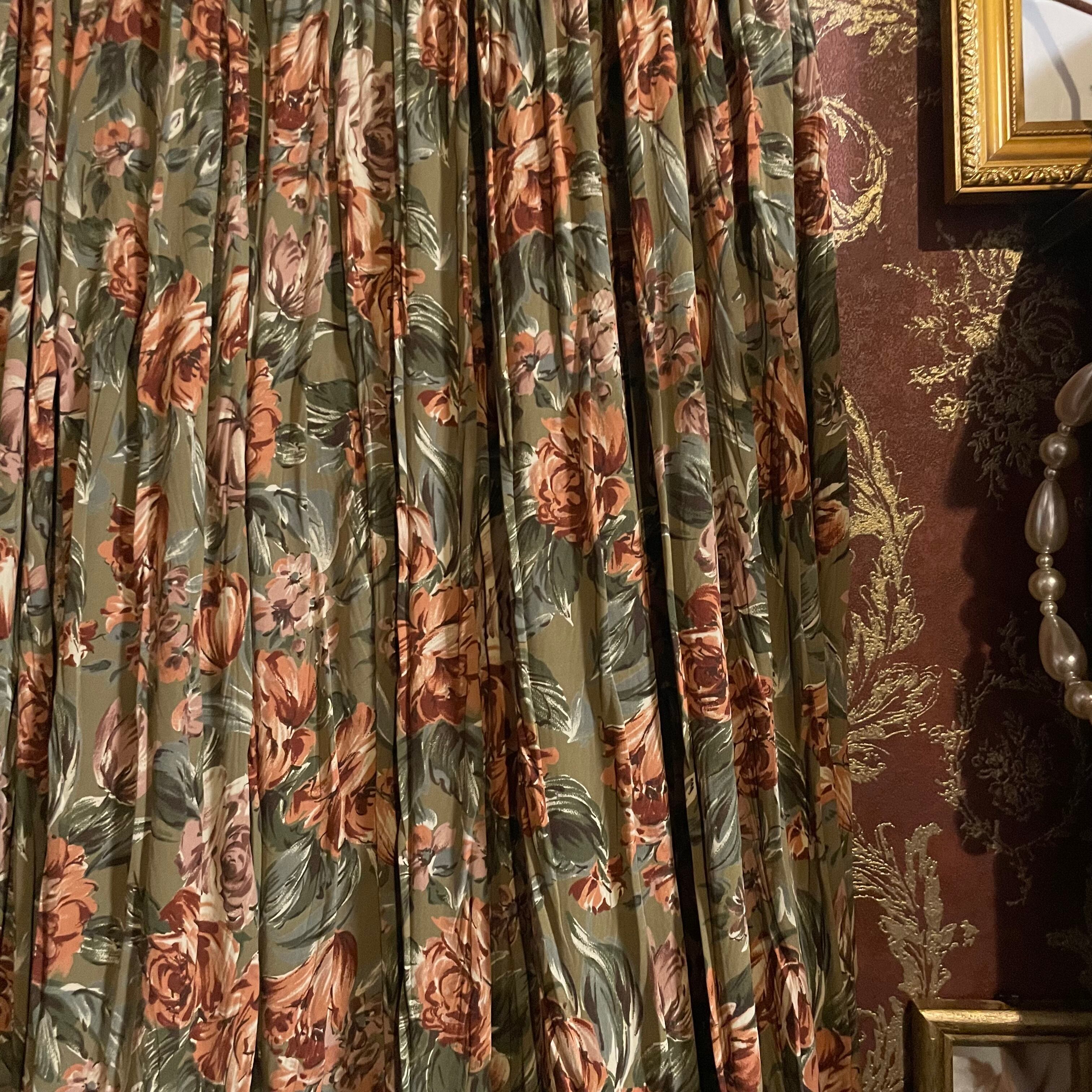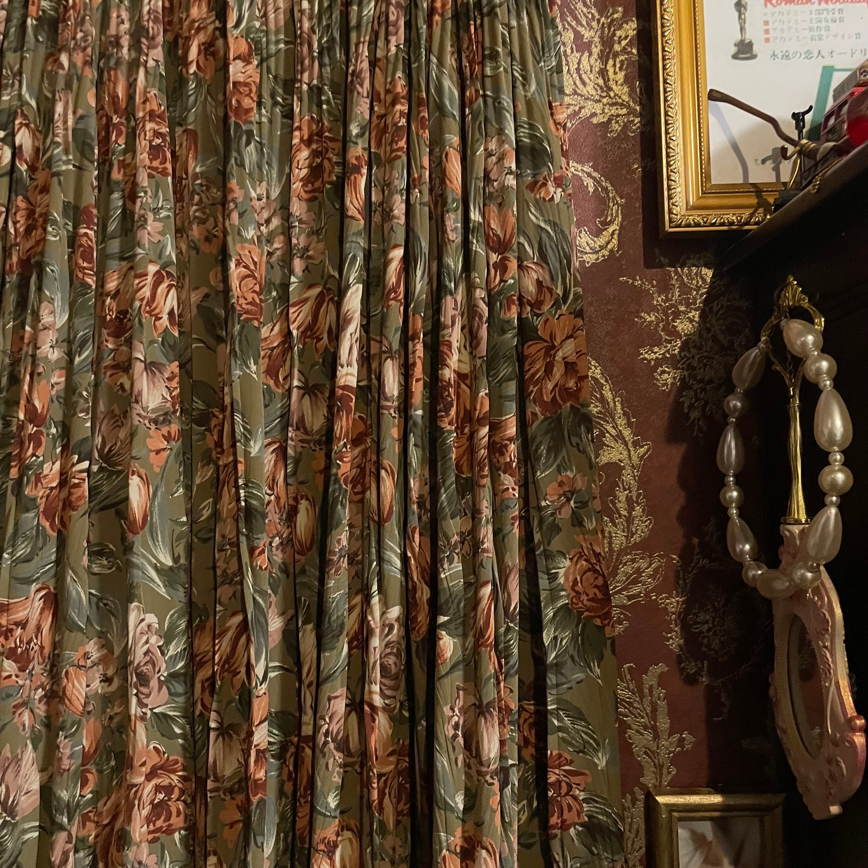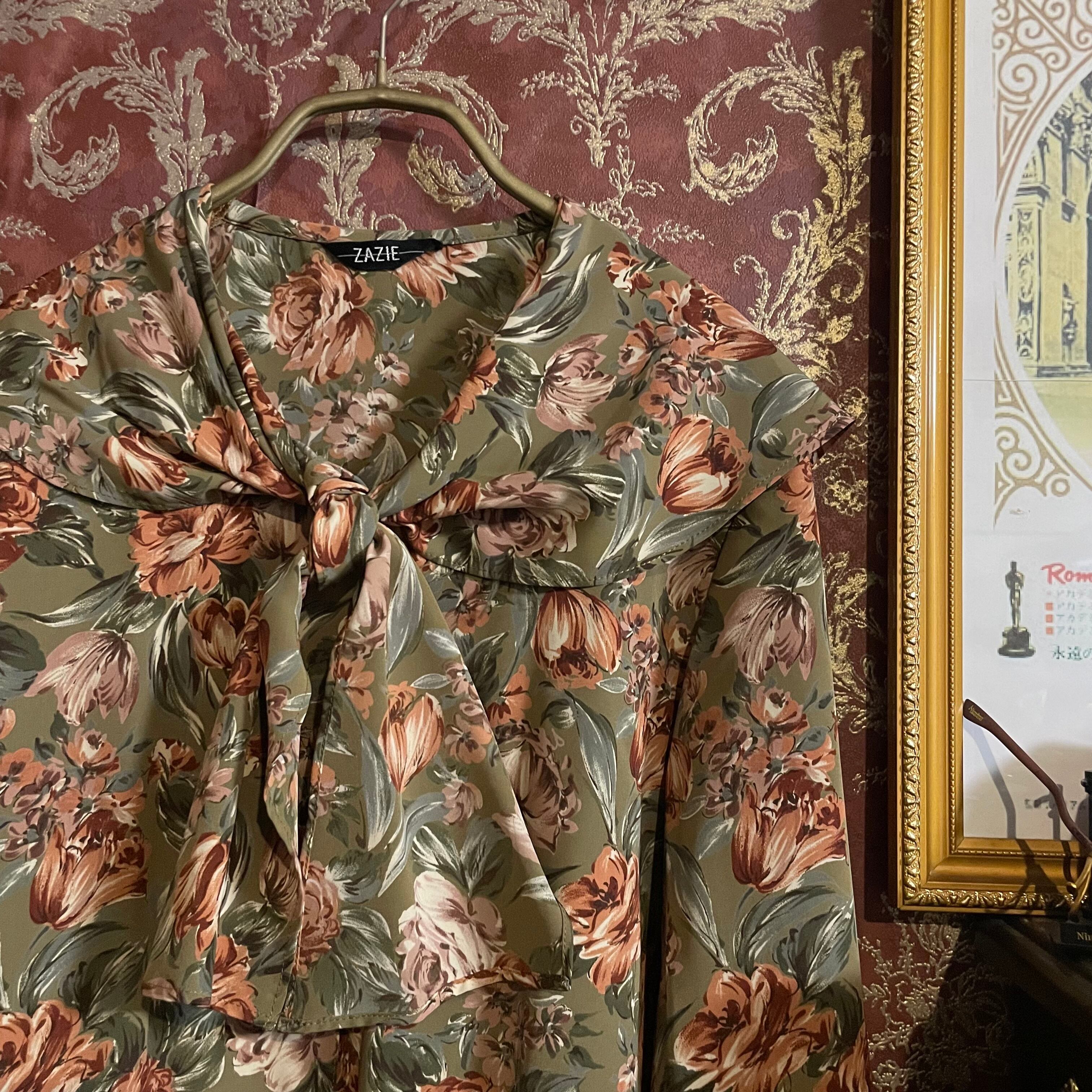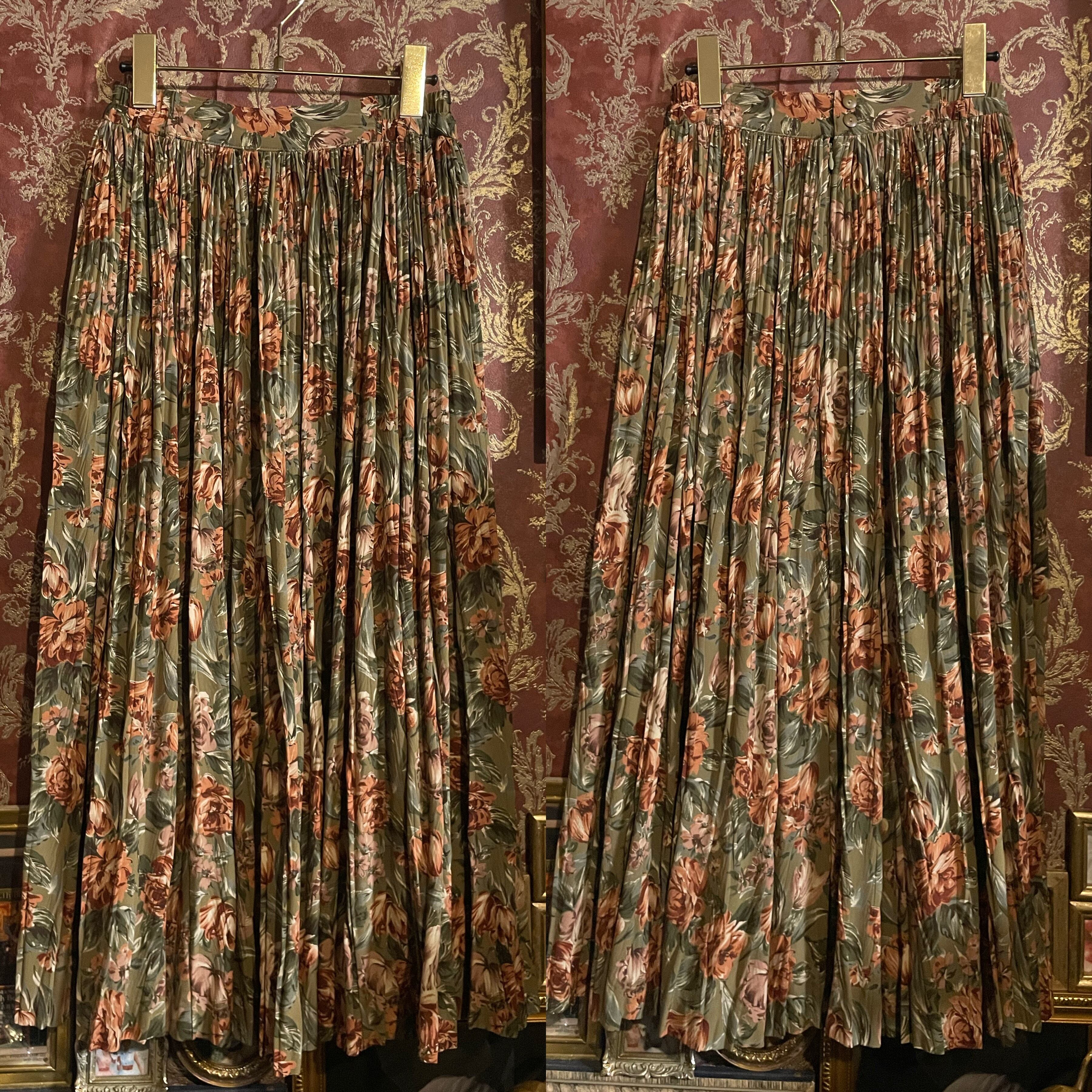 カーキベージュをベースに、くすみ感のあるオレンジブラウンの花々が咲く、温もりあふれるヴィンテージのセットアップです。