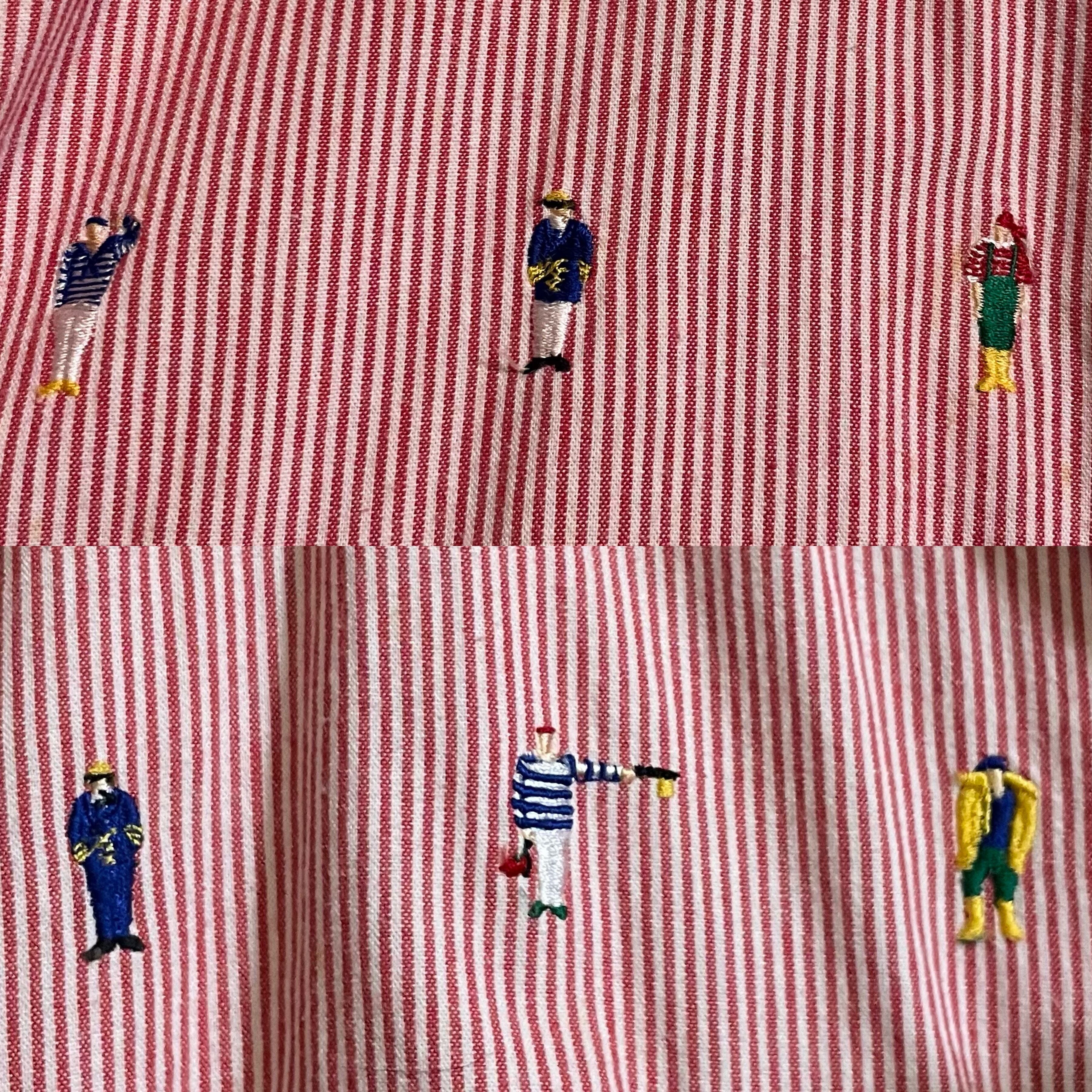フロントには、船乗りや港の人物たちを描いた刺繍があしらわれ、どこかノスタルジックな雰囲気と遊び心を感じさせます。