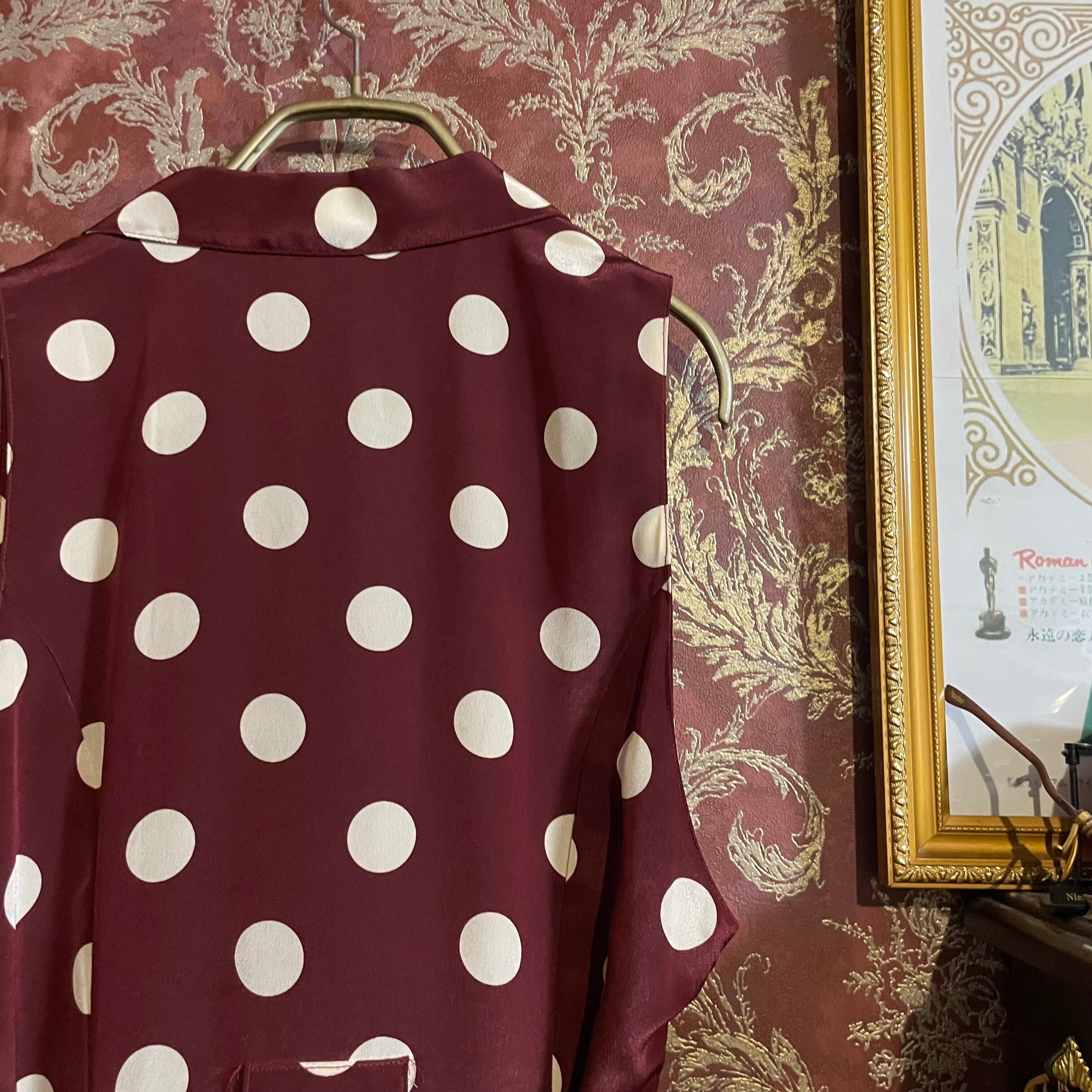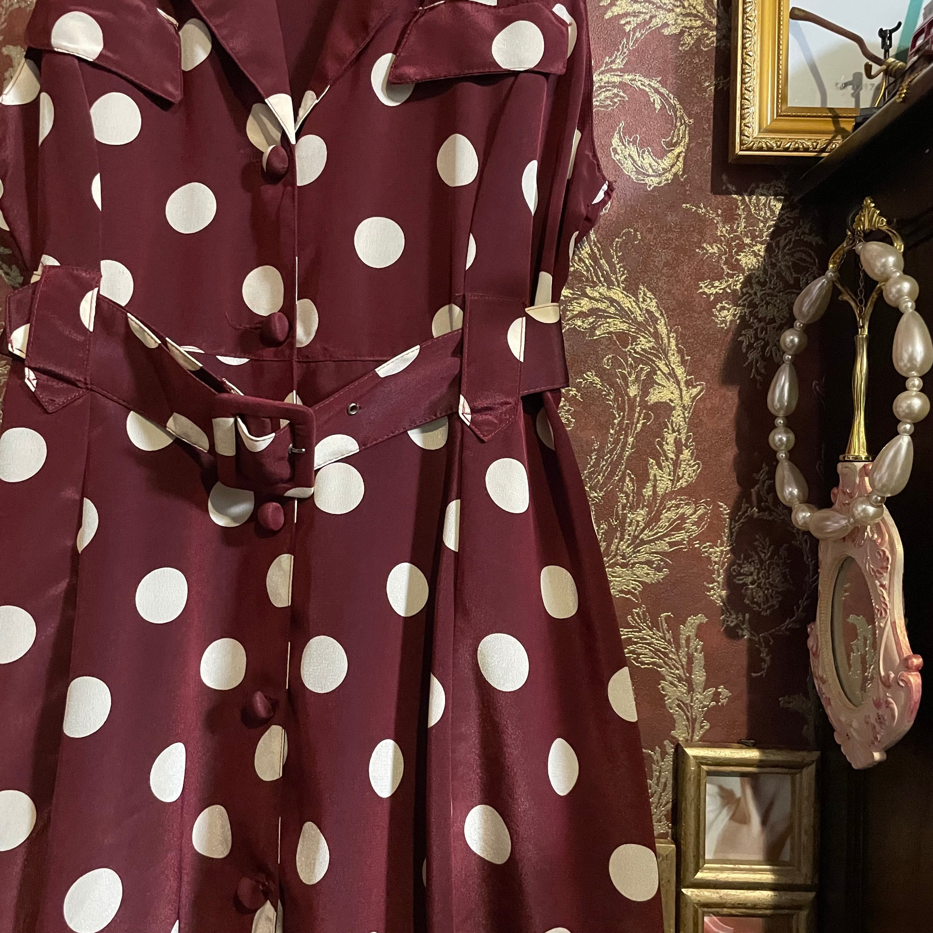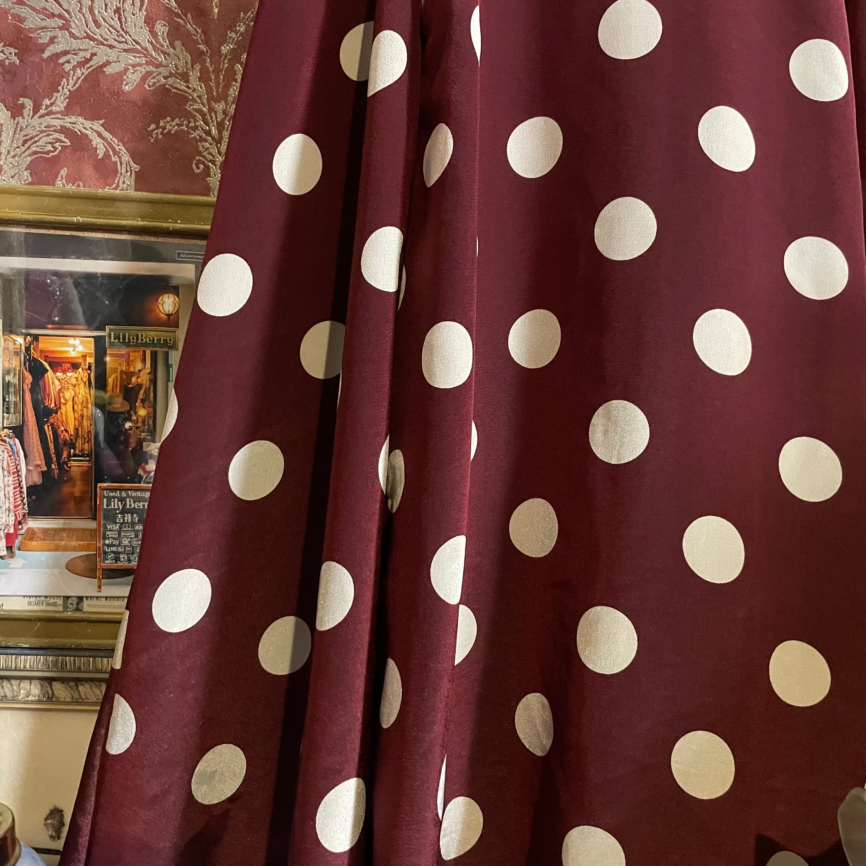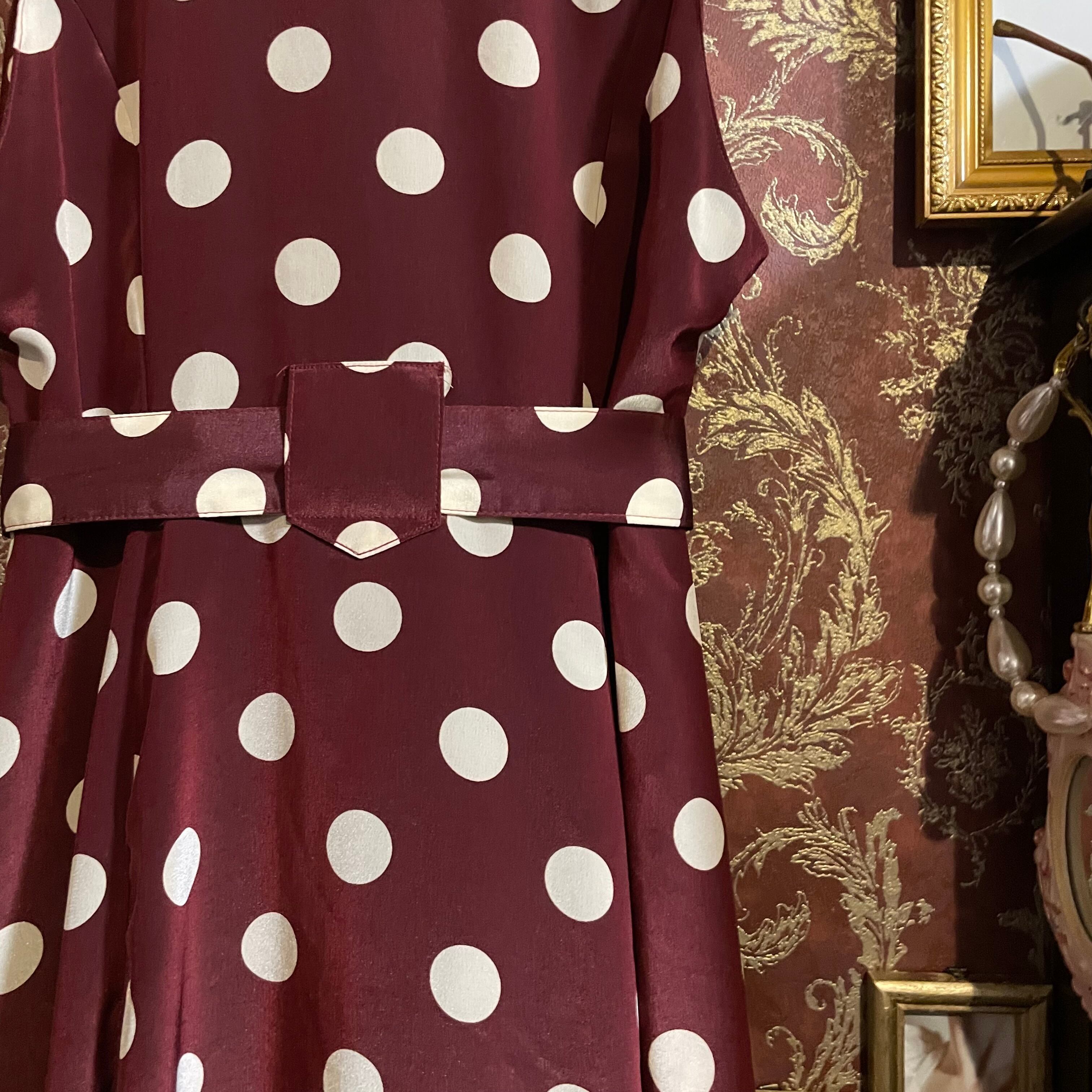 深みのあるバーガンディ(#4a1920)に、リズミカルに並んだ大きめドット柄ワンピースです。