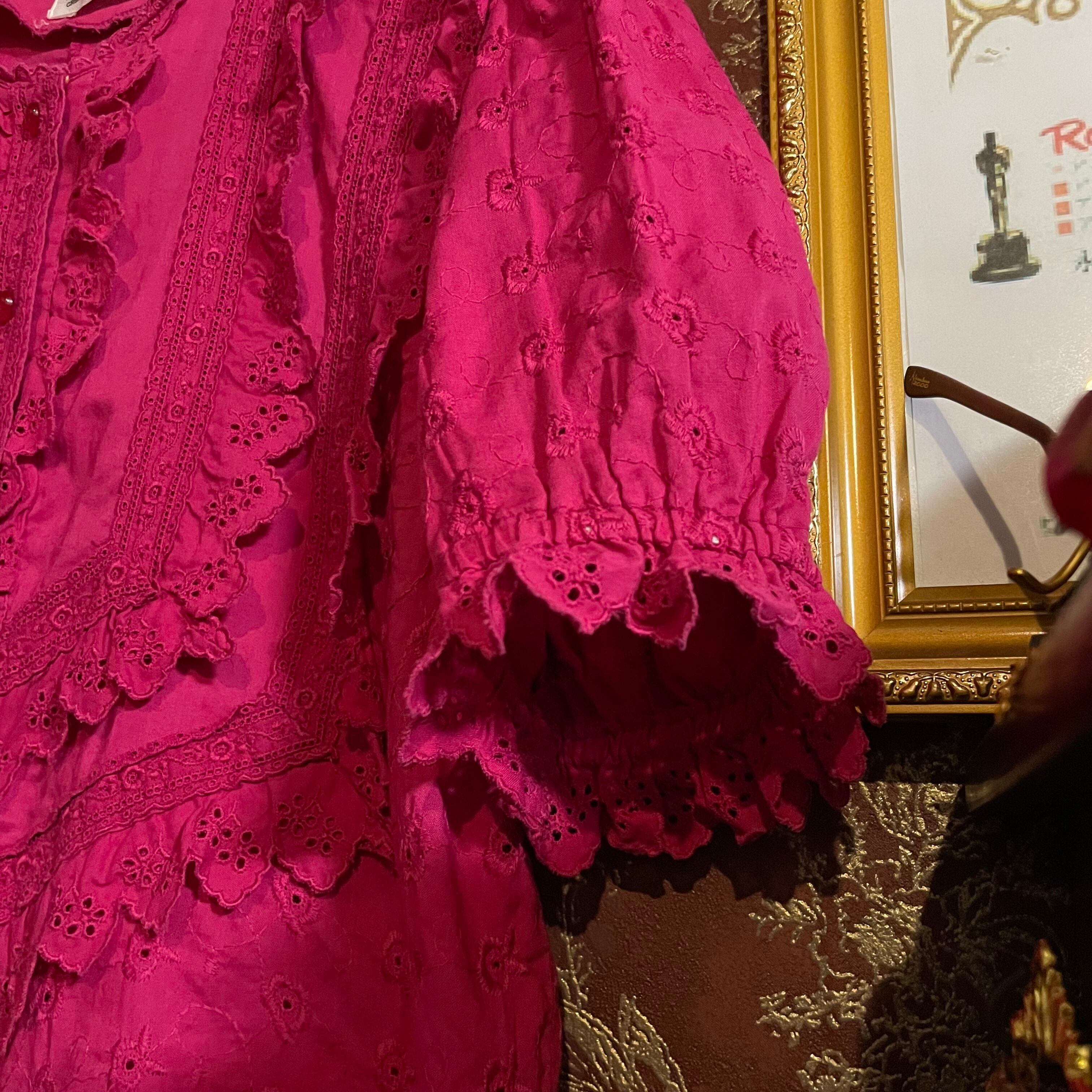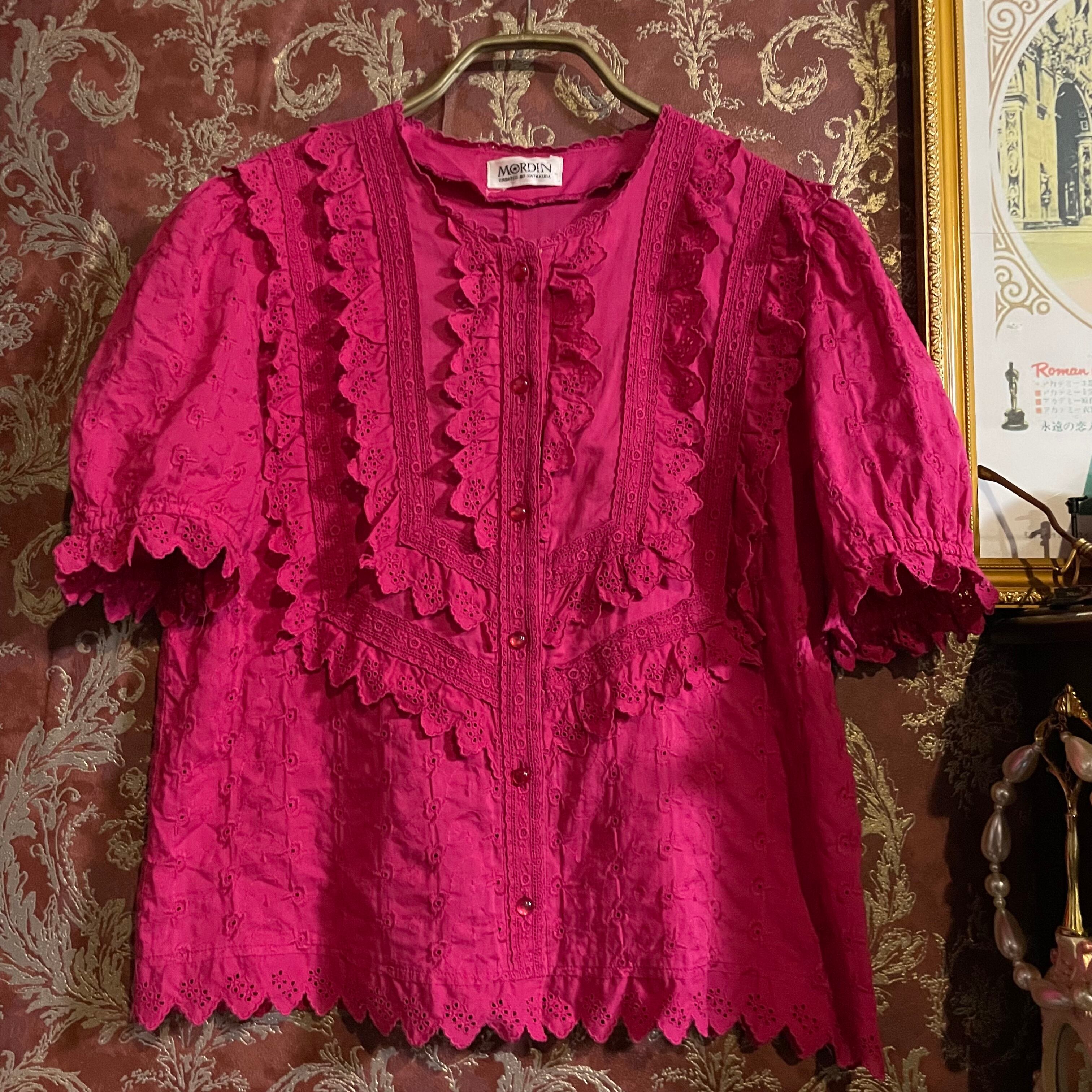 目を惹くラズベリーピンクが華やかに映える、コットンのレースブラウスです。