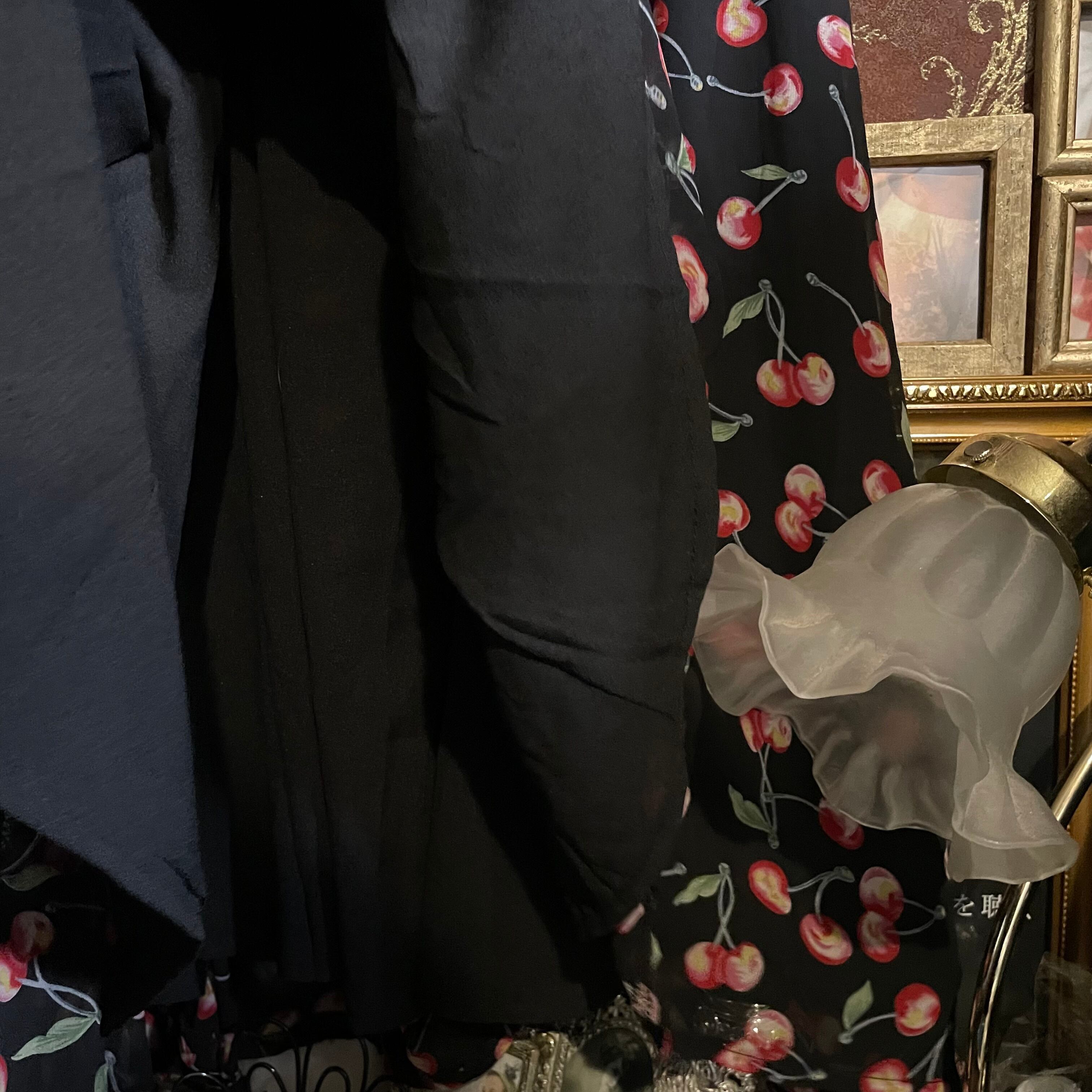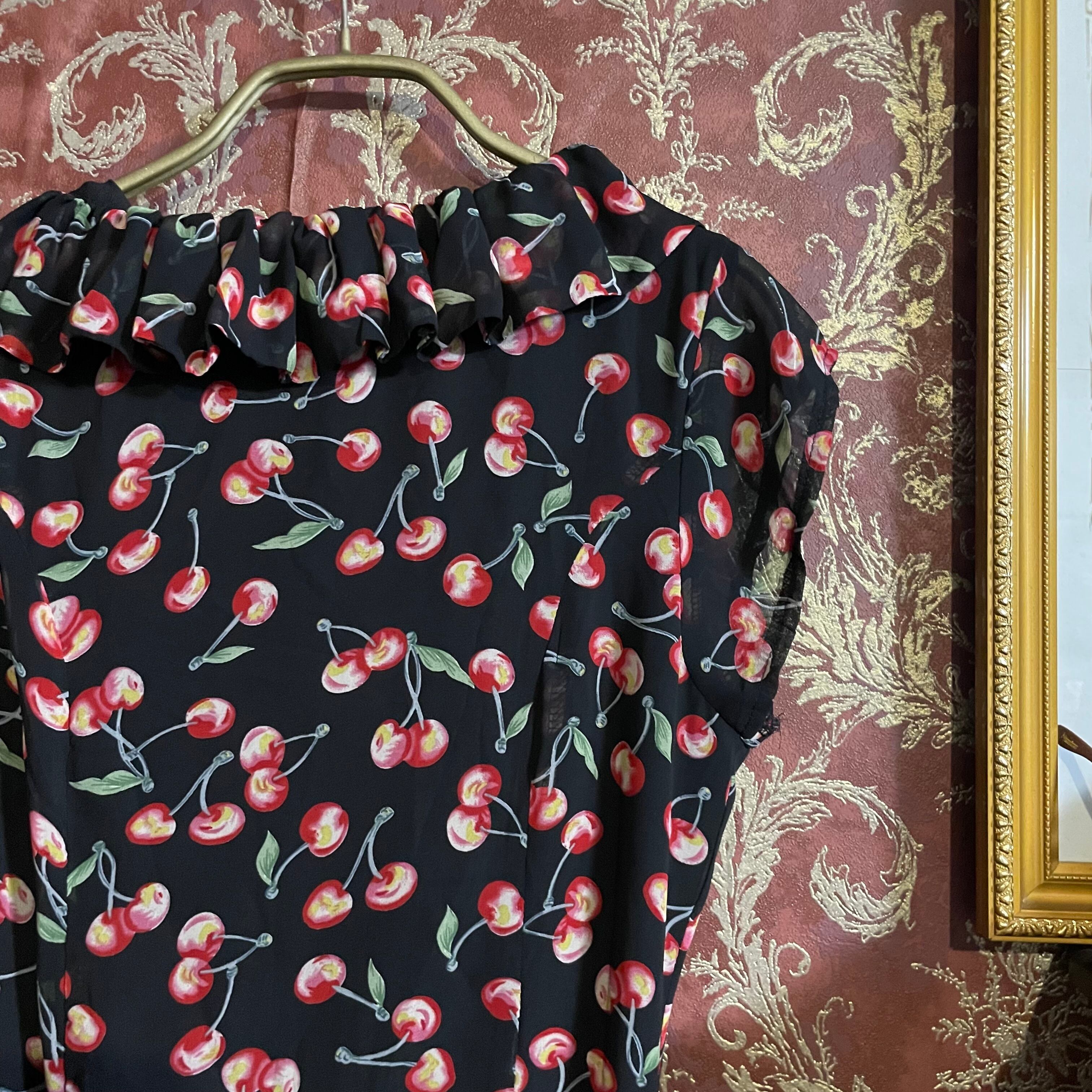 ブラック地に映える艶やかなチェリーモチーフが、まるで1950年代のピンナップガールを思わせるクラシックな可愛らしさを演出します。