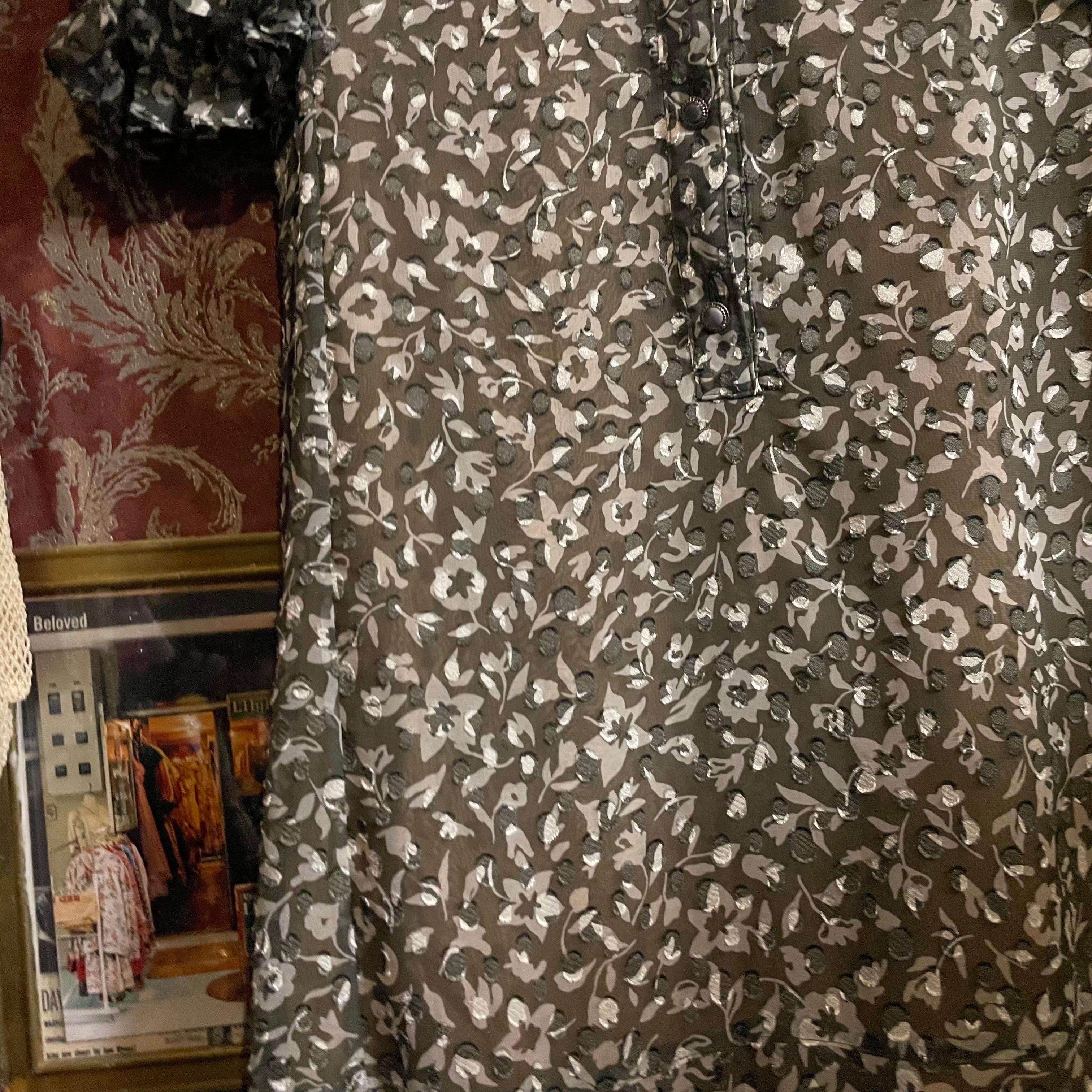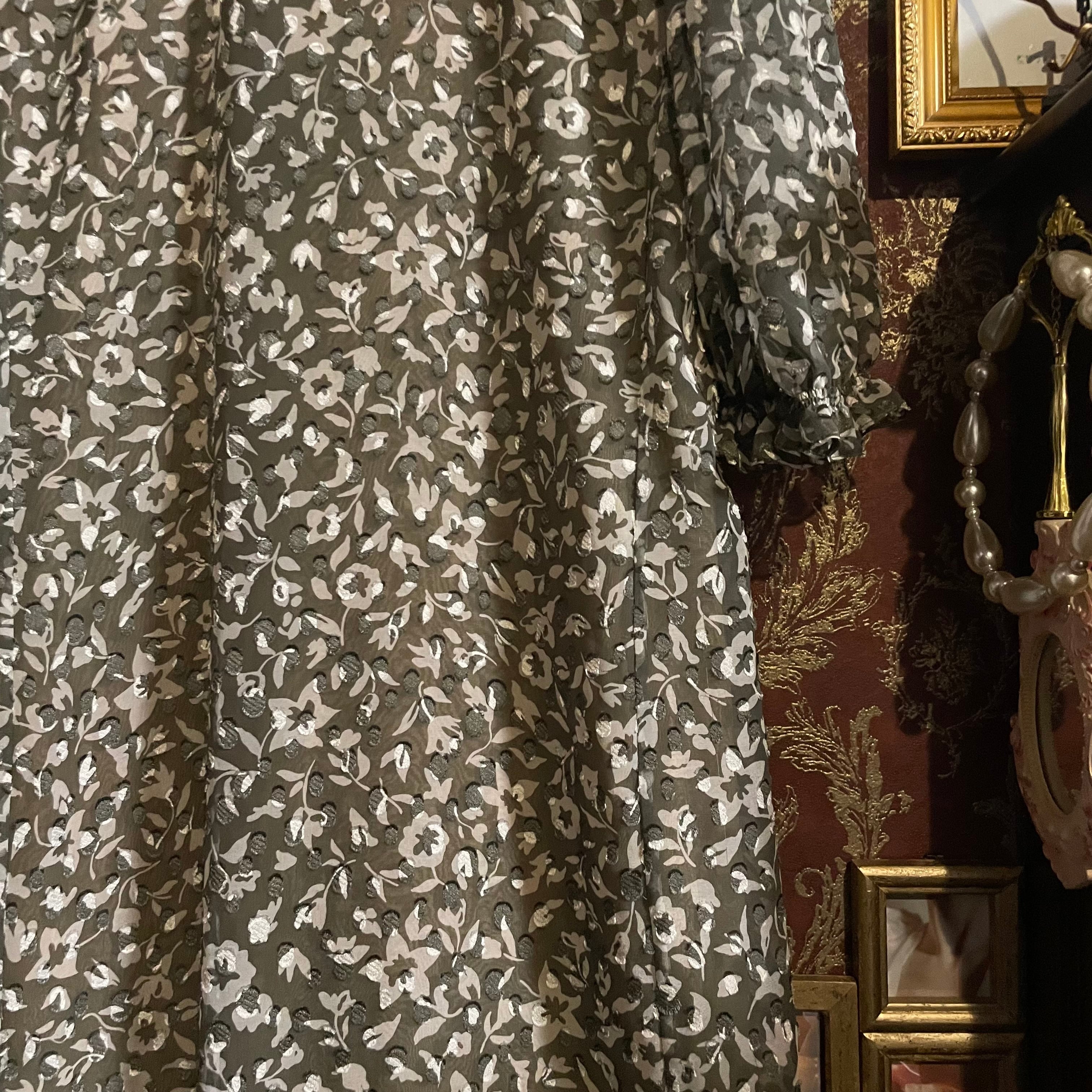 こちらの一着は、透け感のある軽やかなシフォン地に、小花のような総柄があしらわれたロマンティックなデザイン。
