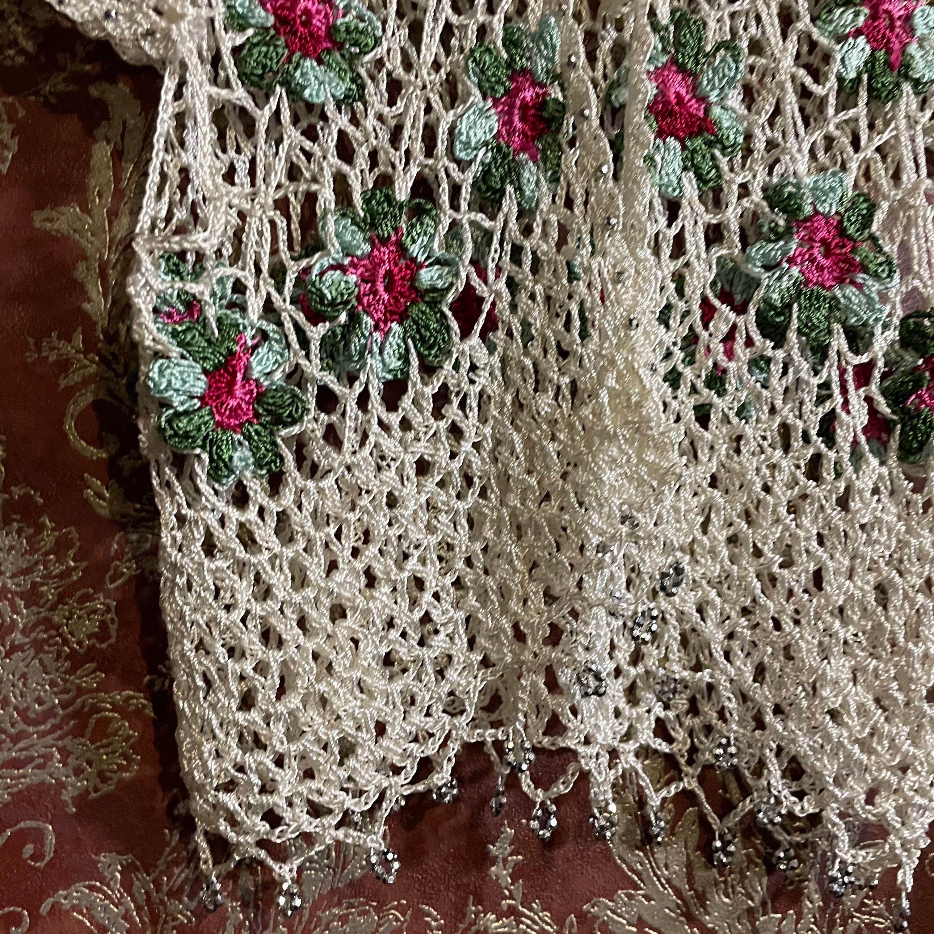 ホワイトの糸でざっくりと編まれ、フロントや肩にあしらわれたピンクのフラワーモチーフが華やかなアクセントに。