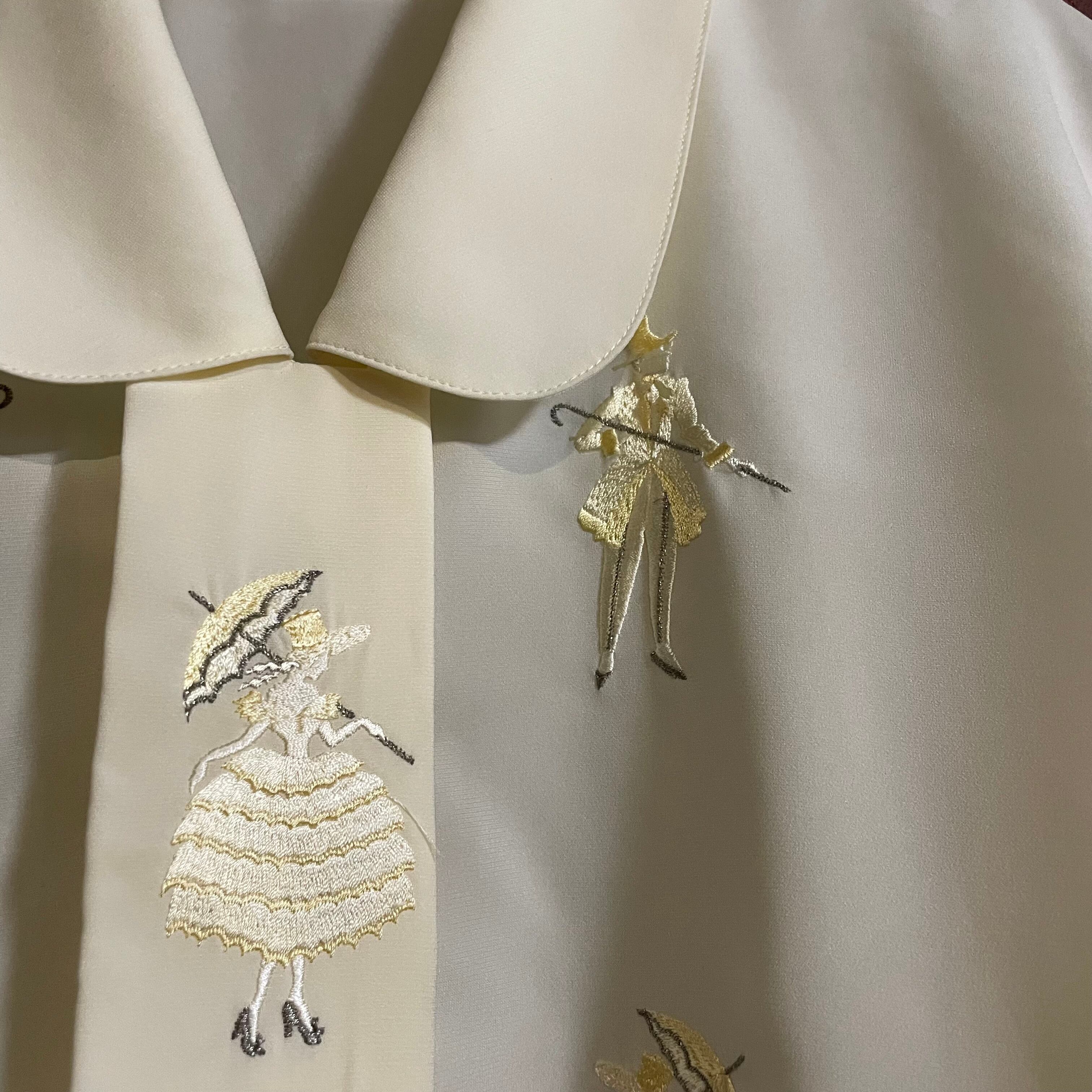 立体的な糸使いで表現されたスカートやパラソルが、細部まで丁寧に作り込まれた一枚です。