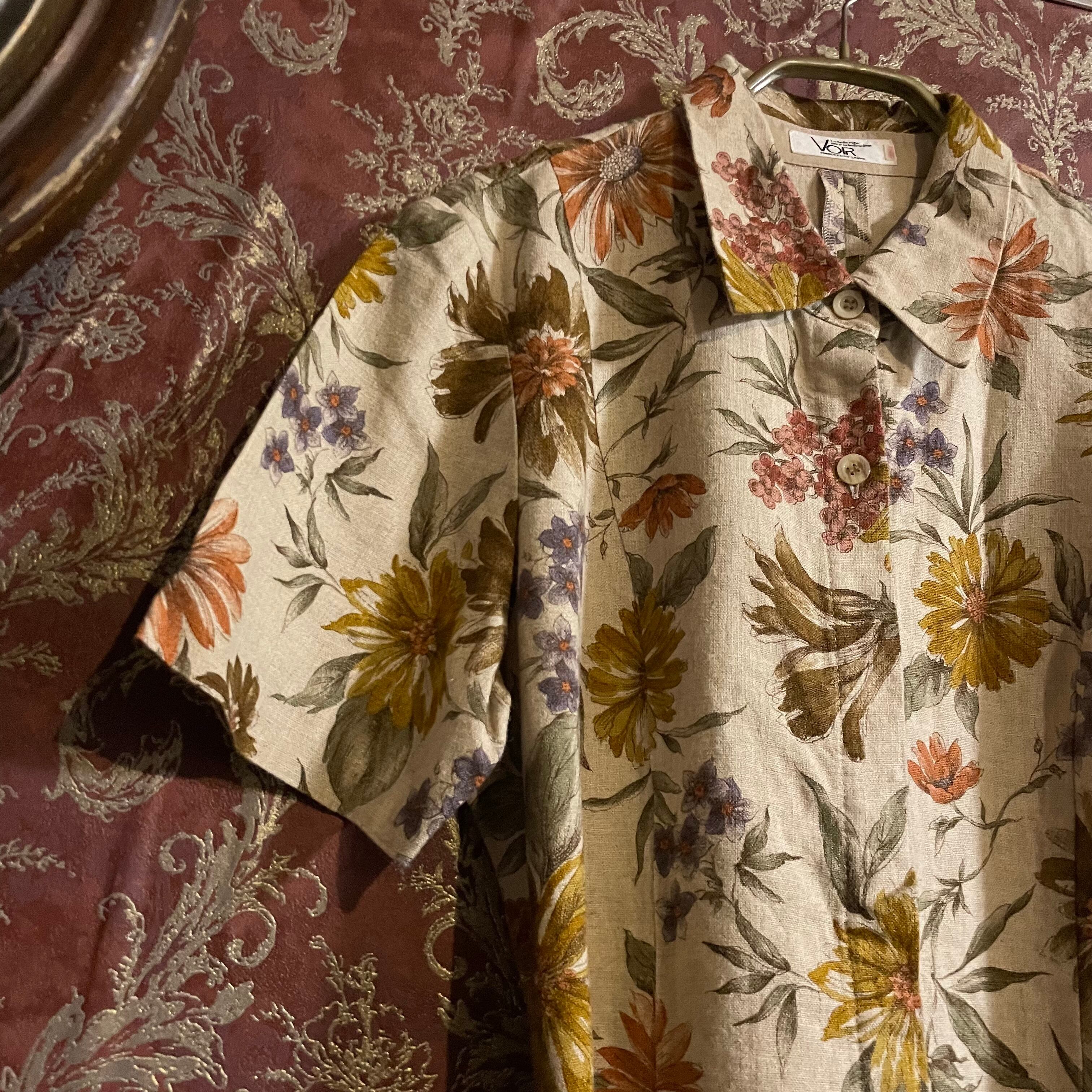 生成りベースに、大輪の花や繊細な葉が描かれたボタニカル柄が優雅に広がり、まるで絵画のような存在感を放ちます。