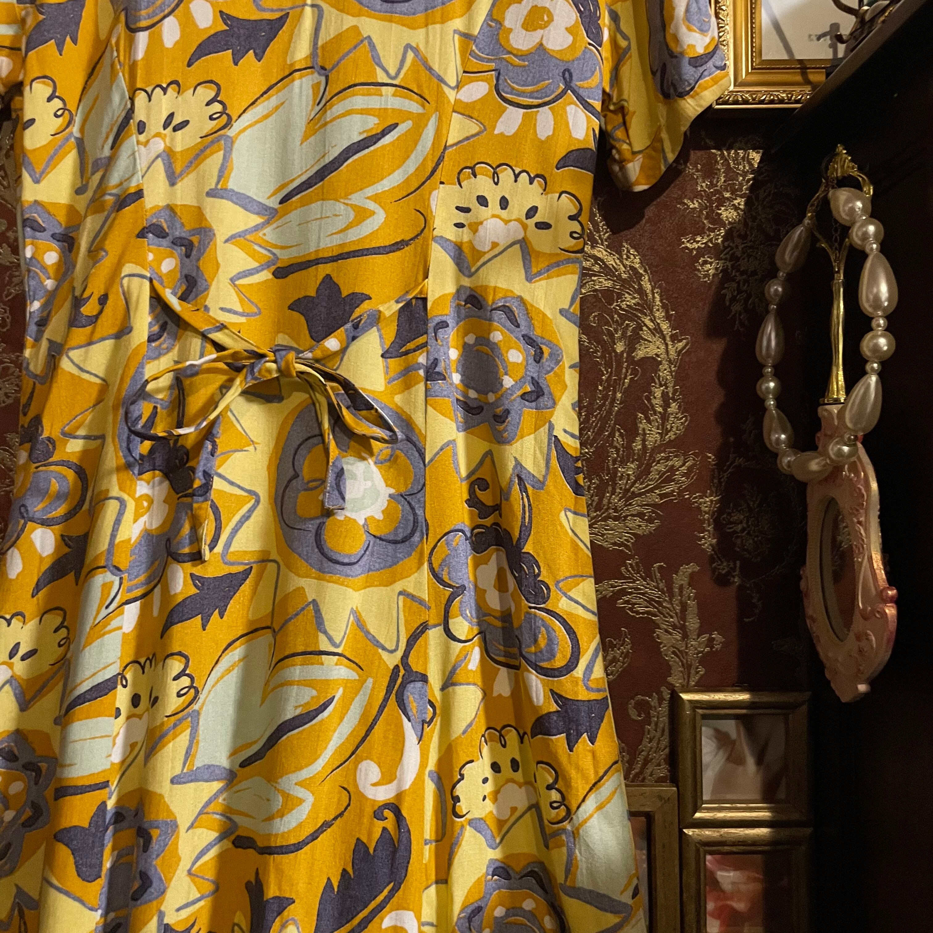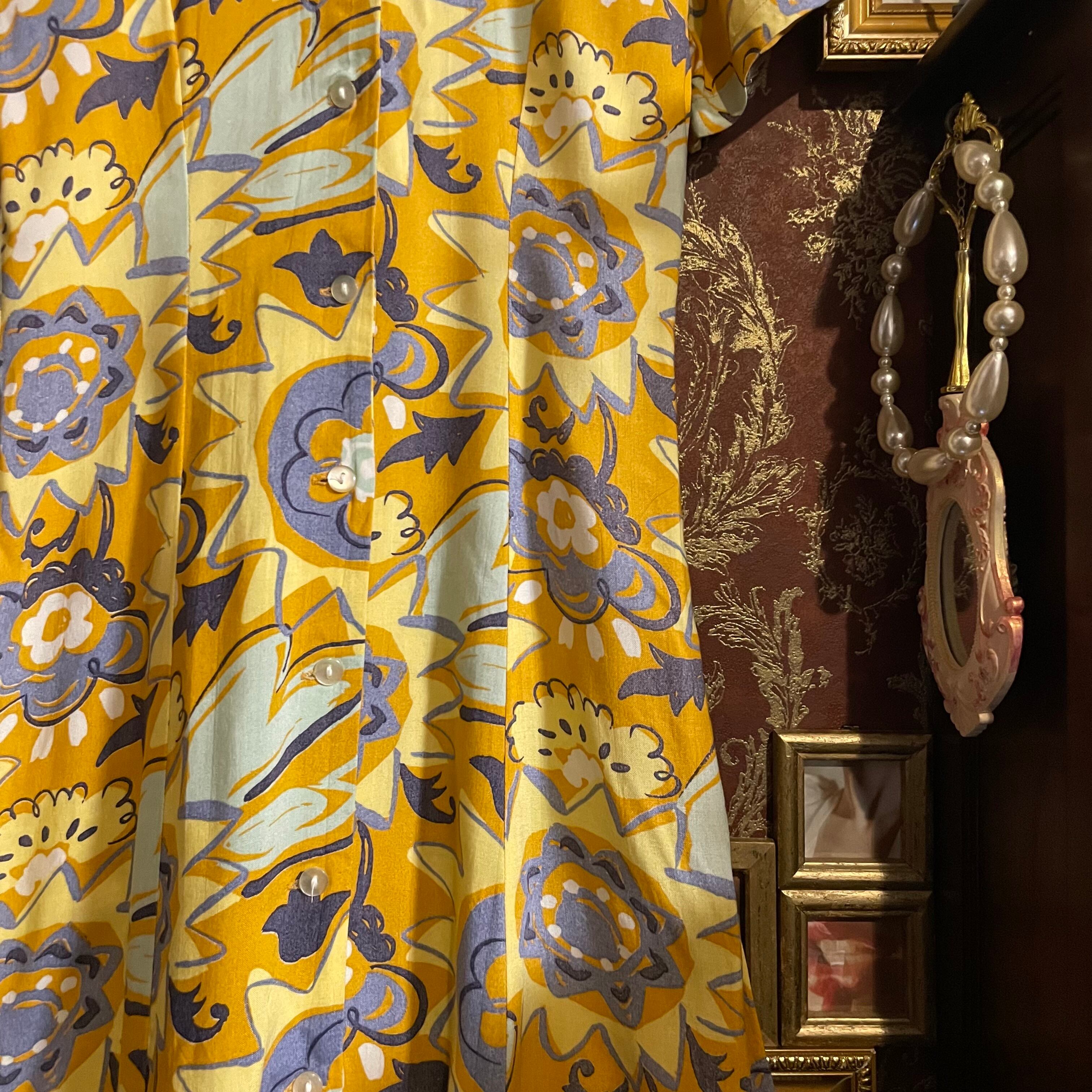 ぱっと目を引く、鮮やかなオレンジ(#d17d2aあたり)をベースに、ポップなフラワーとリーフが大胆に描かれたヴィンテージシャツワンピースです。