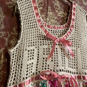 上身頃はノースリーブで、かぎ針編みによる方眼編みで製作し、胸元には"ARIEL”の文字が浮かび上がり、まるで天の名を纏うかのような印象に。